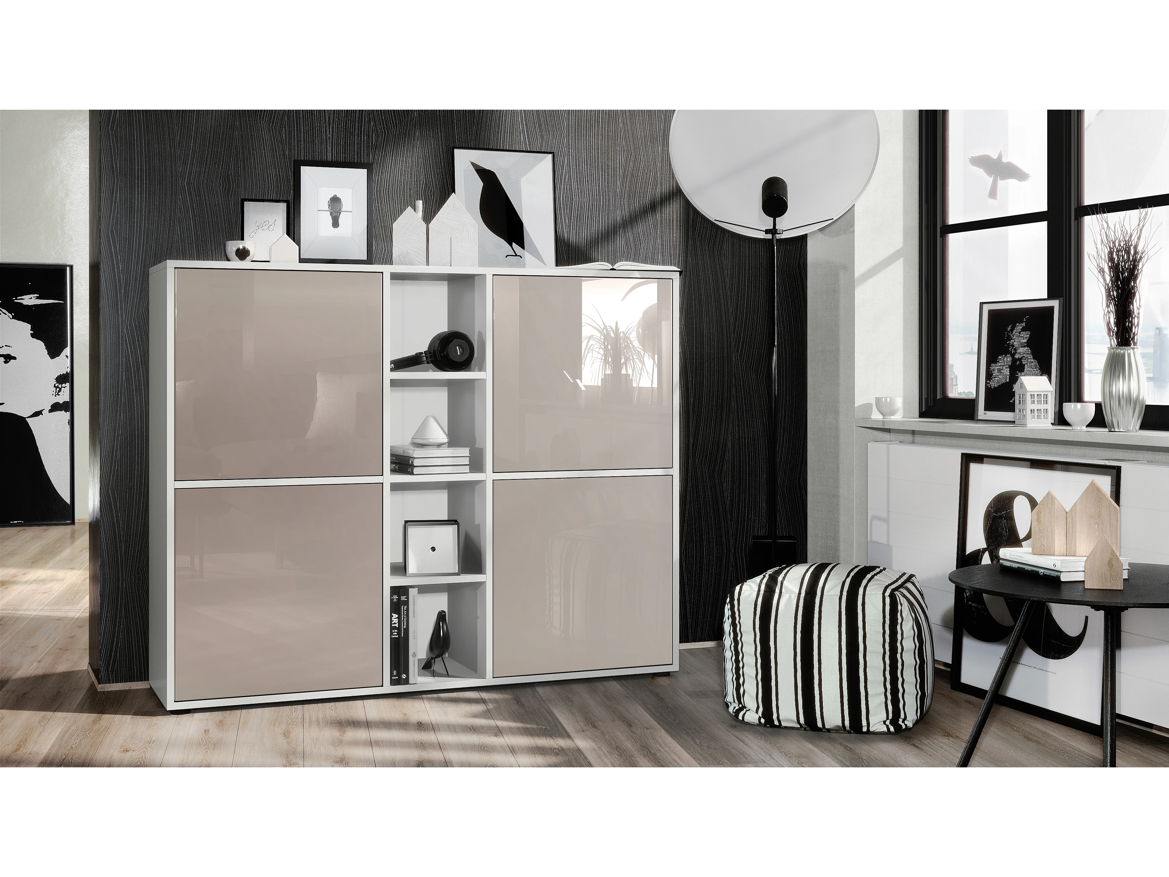 Highboard Cuba V3, blanc mat/gris sable haute brillance - Buffet moderne à 12 compartiments (130,5 x 105,5 x 35,5 cm)