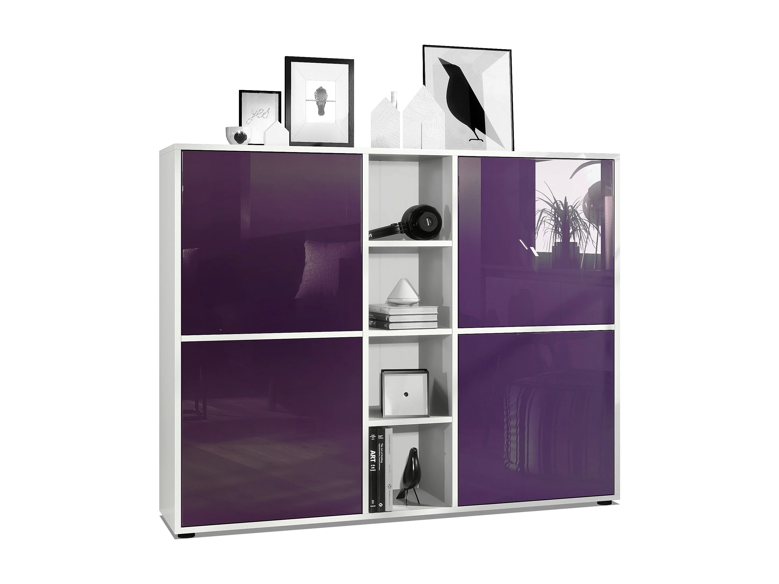 Highboard Cuba V3, blanc mat/mûre haute brillance - Buffet moderne à 12 compartiments (130,5 x 105,5 x 35,5 cm)
