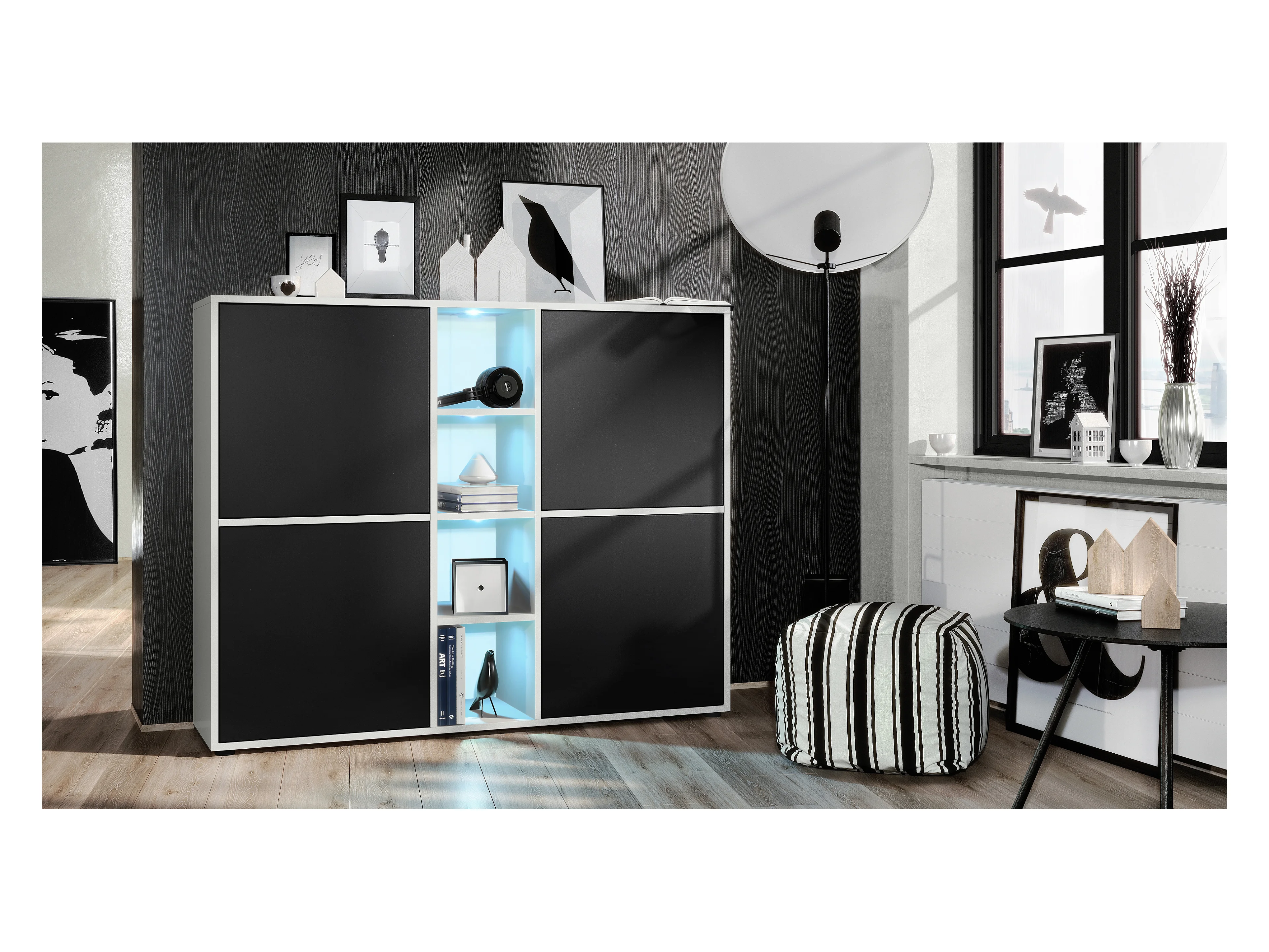 Highboard Cuba V3, blanc mat/noir mat y compris LED - Buffet moderne à 12 compartiments (130,5 x 105,5 x 35,5 cm)