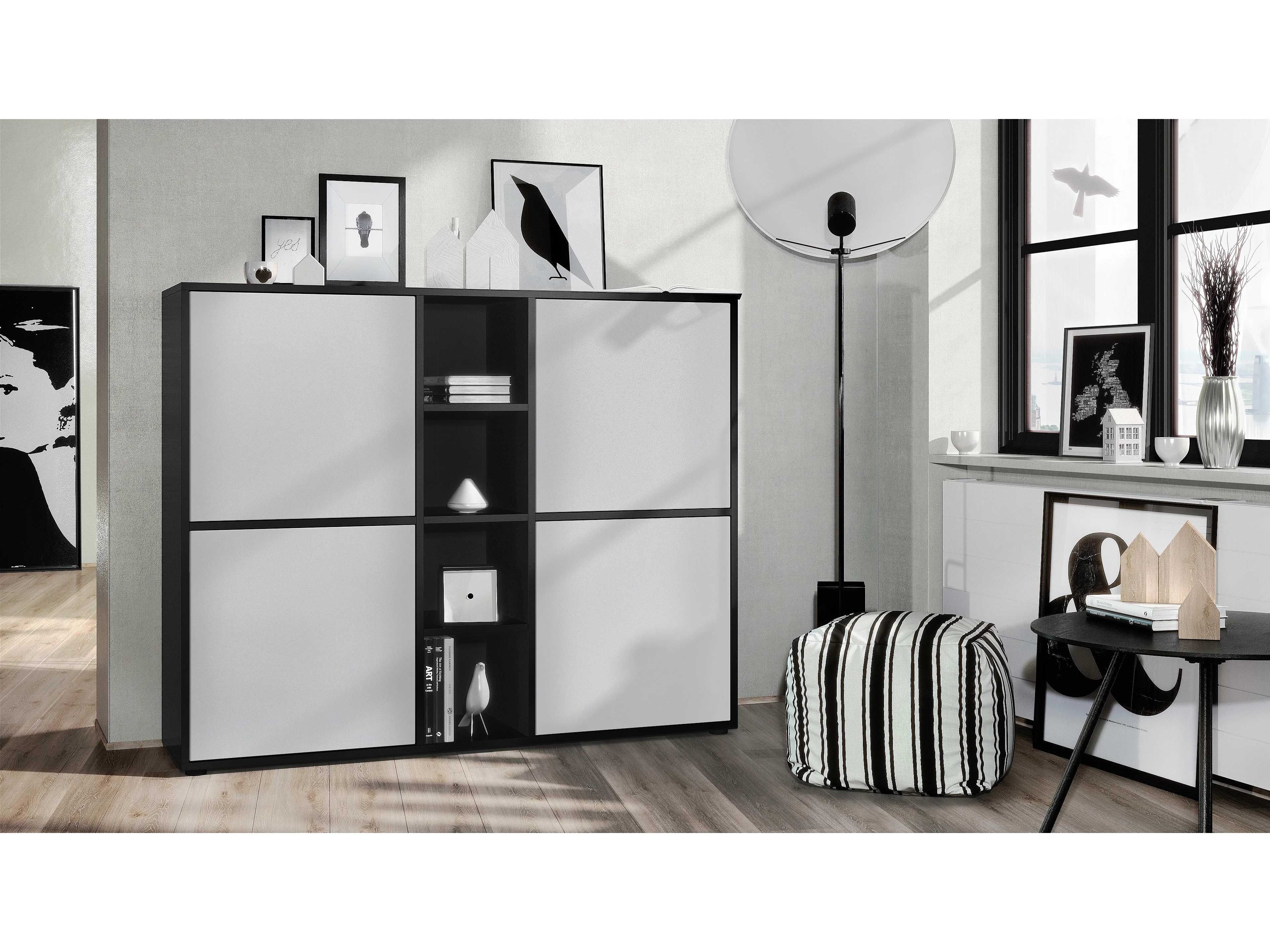 Highboard Cuba V3, noir mat/gris clair satiné mat - Buffet moderne à 12 compartiments (130,5 x 105,5 x 35,5 cm)