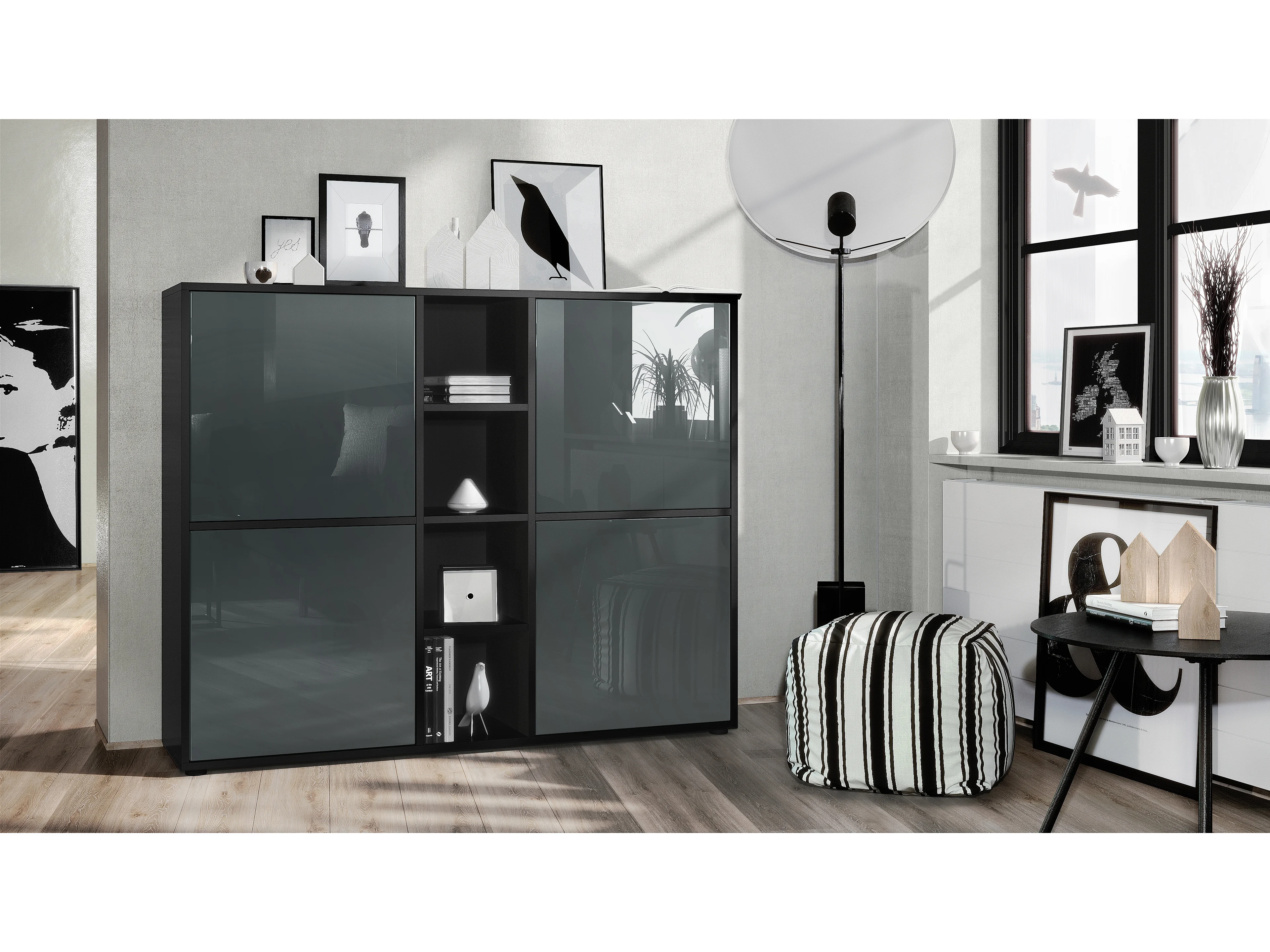 Highboard Cuba V3, noir mat/gris haute brillance - Buffet moderne à 12 compartiments (130,5 x 105,5 x 35,5 cm)