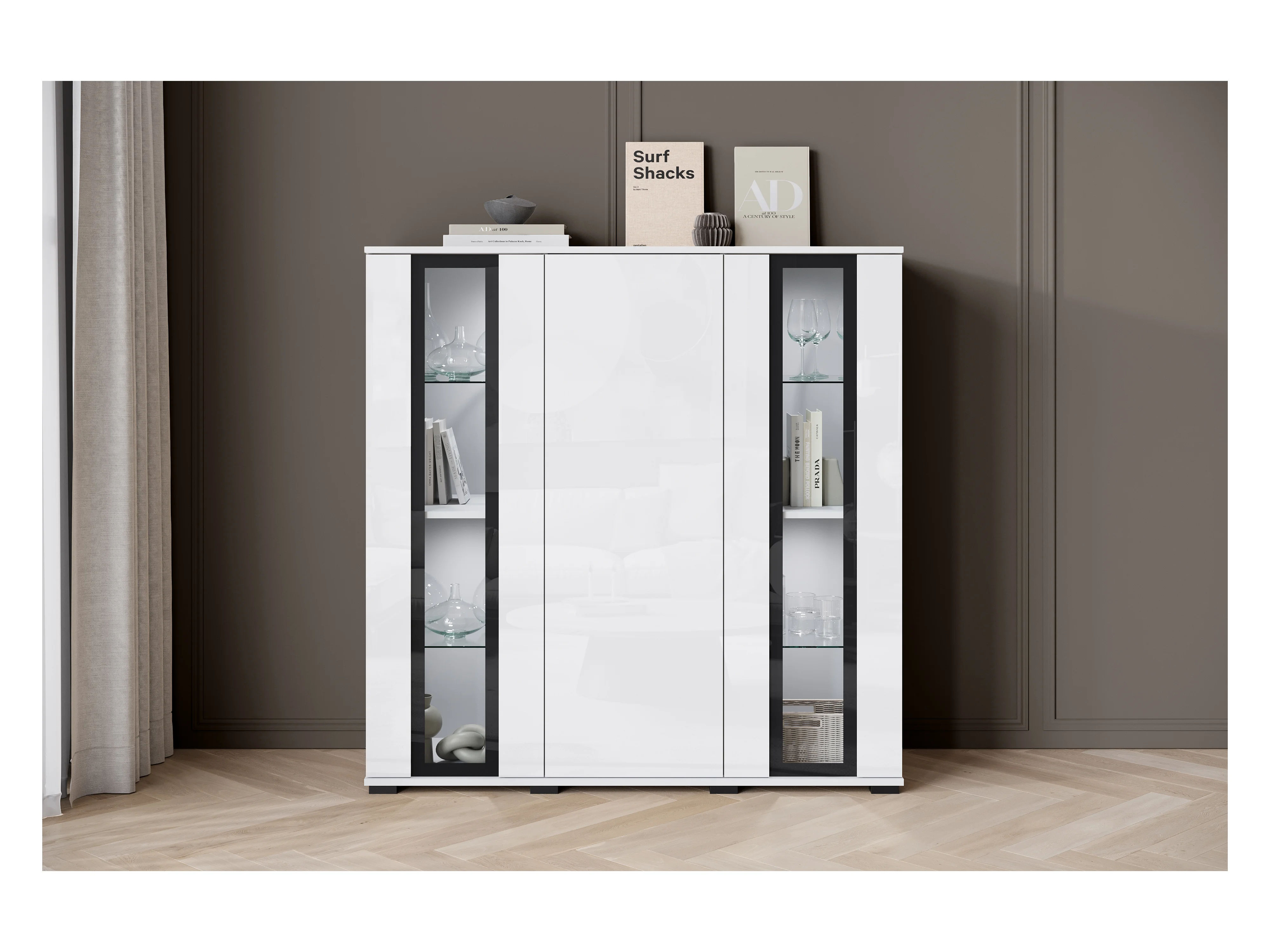 Highboard moderne 120 cm avec LED – vitrine haute de salon avec vitrages, corps blanc mat façades blanc brillant