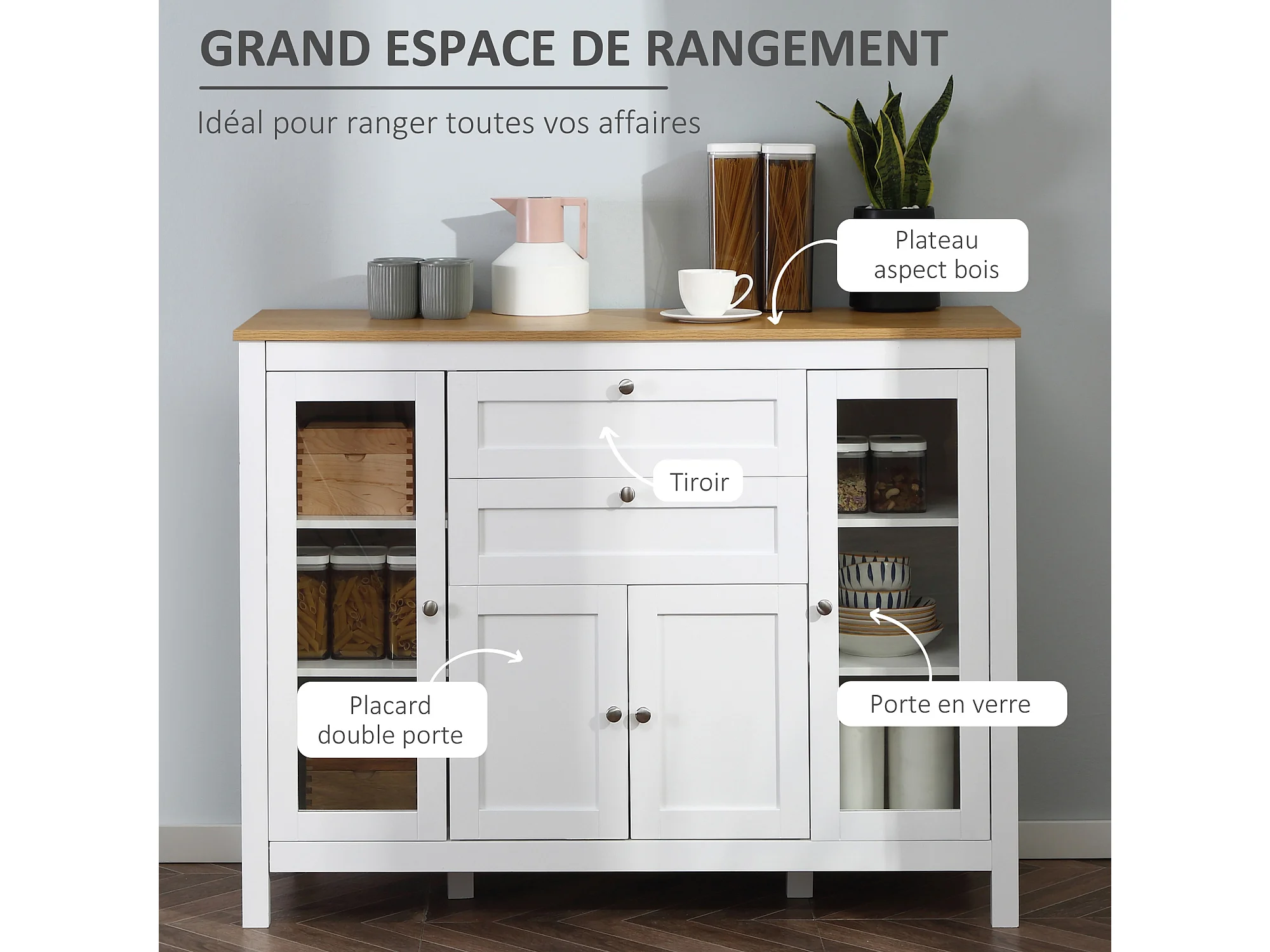 Buffet style classique chic multi-rangement 2 portes 2 étagères réglables 2 tiroirs coulissants placard 2 portes MDF blanc plateau aspect bois clair