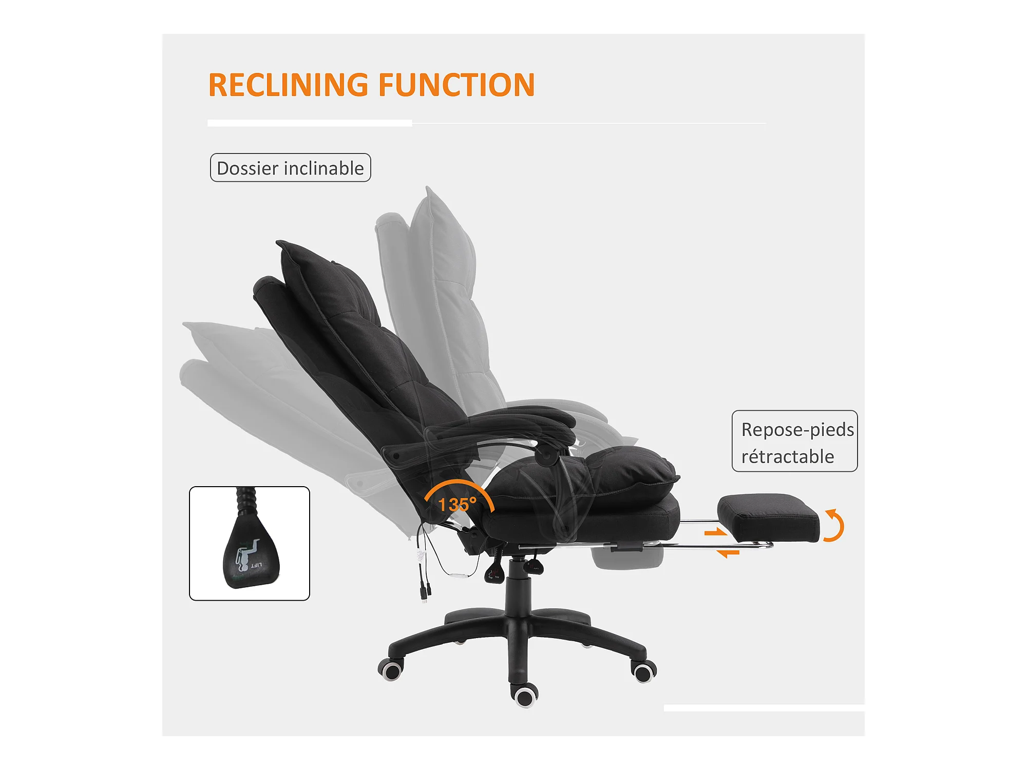 Fauteuil de bureau direction massant hauteur réglable dossier inclinable repose-pied intégré toile de lin noir