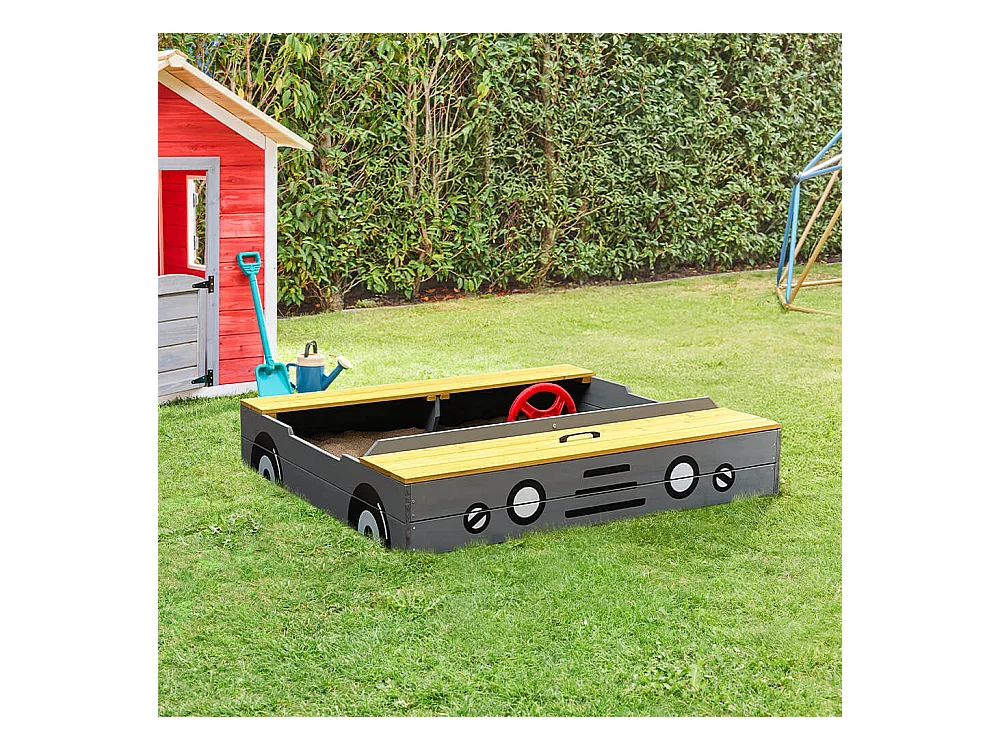 Bac à sable bois carré dim. 1,18L x 1,13l x 1,10H m - hauteur, inclinaison toit réglable, refermable - tableau, jeu - bois sapin gris