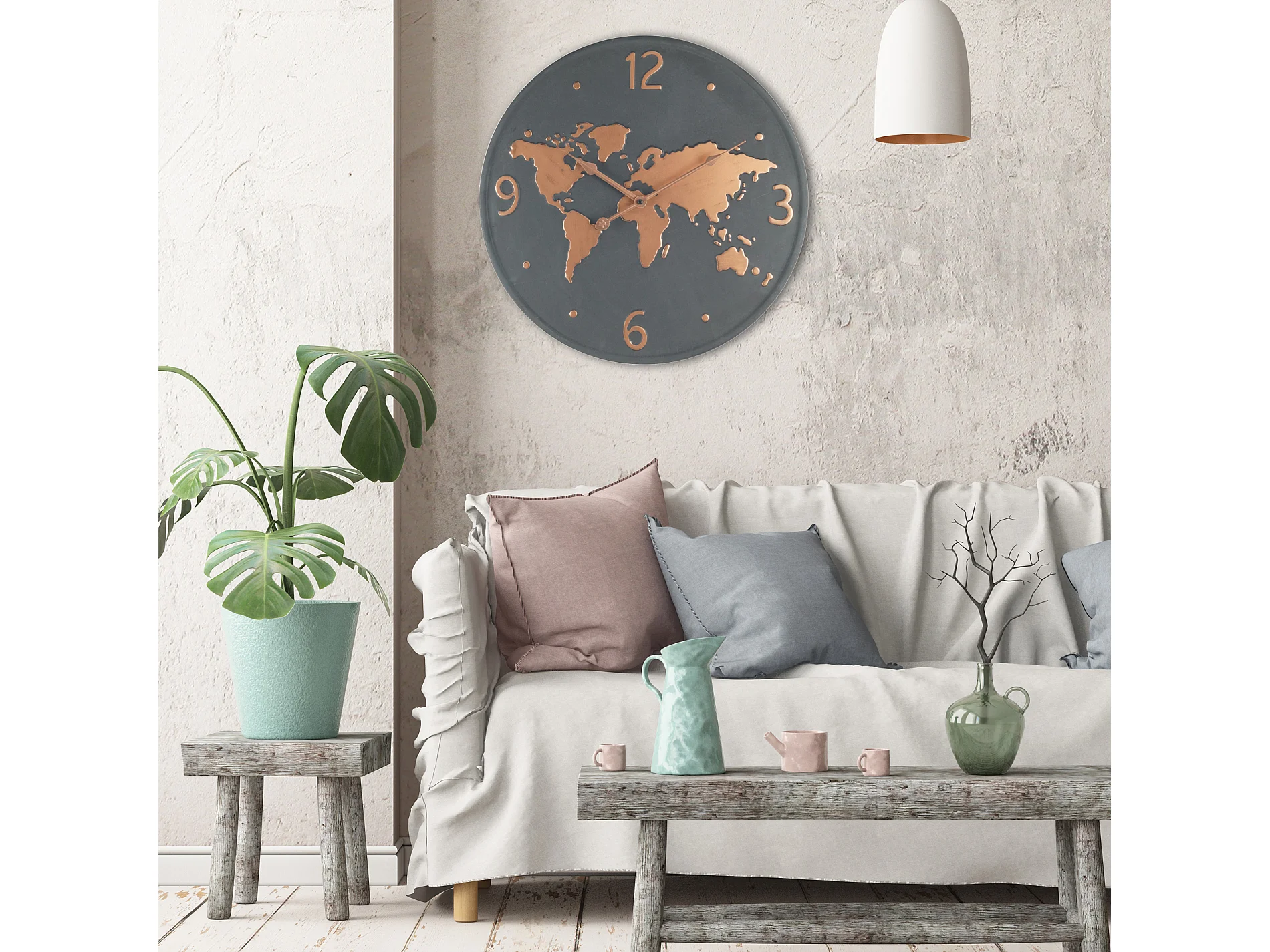 Horloge Murale Métal Mappemonde Gris Foncé Brun Cuivré Salon Cuisine