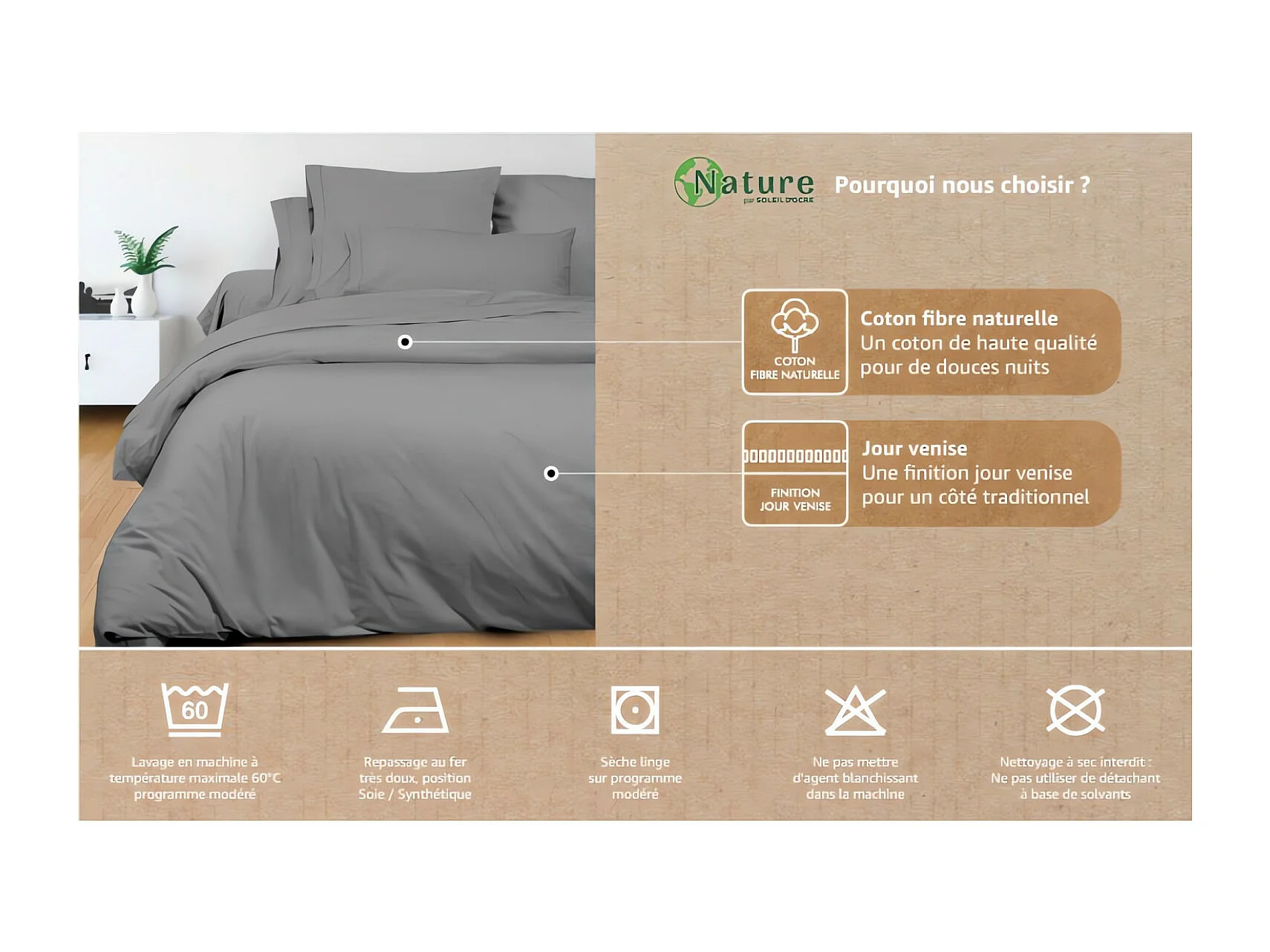 Housse de couette en coton 240x220 cm PERCALE gris, par Soleil d'ocre