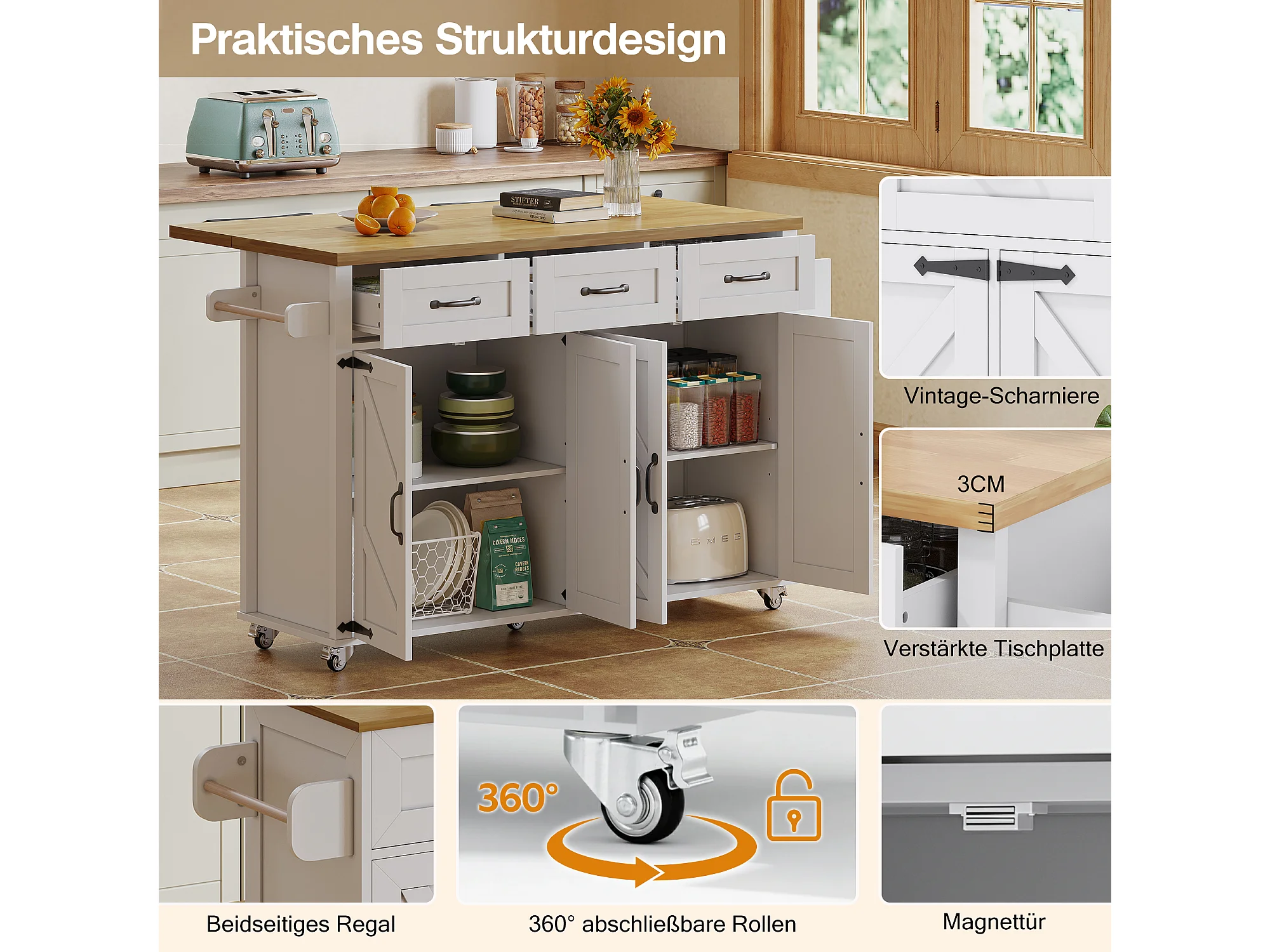 Îlot central à roulettes avec plan de travail rabattable + 4 portes + 3 tiroirs - 140 x 43(70) x 90.5 cm - blanc