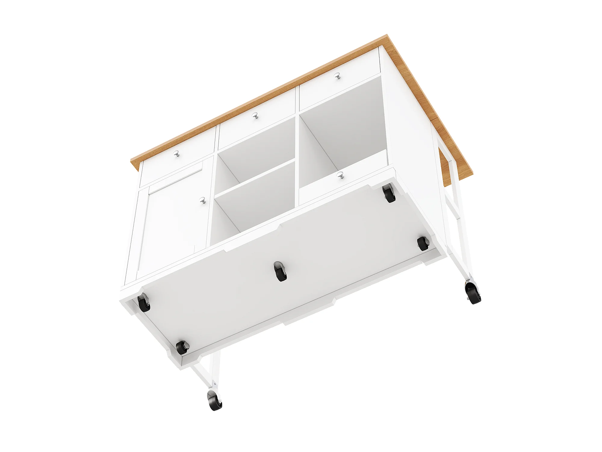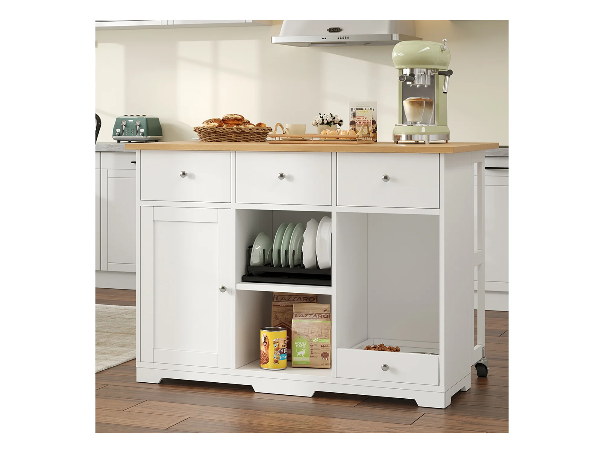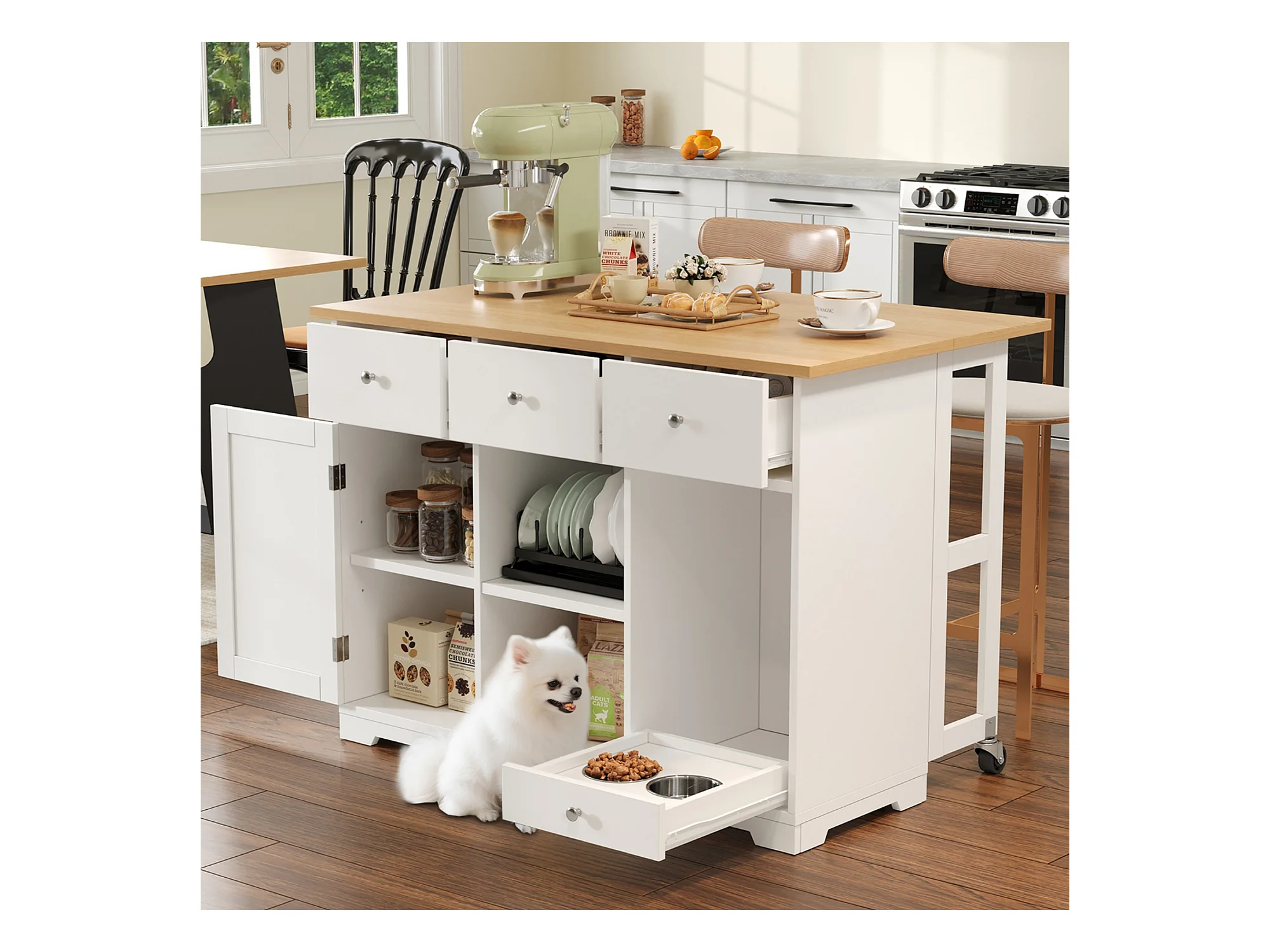 Îlot central cuisine - 120 x 70 x 90 cm - avec 3 tiroirs + 1 porte + coin repas pour animaux - MDF - blanc