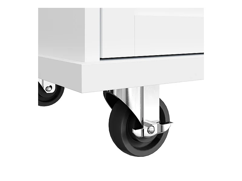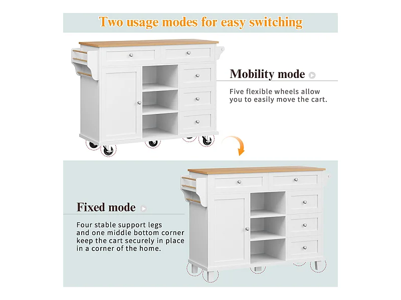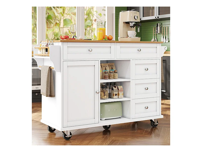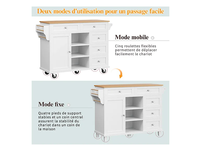 Ilot central de cuisine avec 5 tiroirs 3 niches et 1 porte, avec pieds de support fixe et roulettes, 134x46x92cm - Blanc