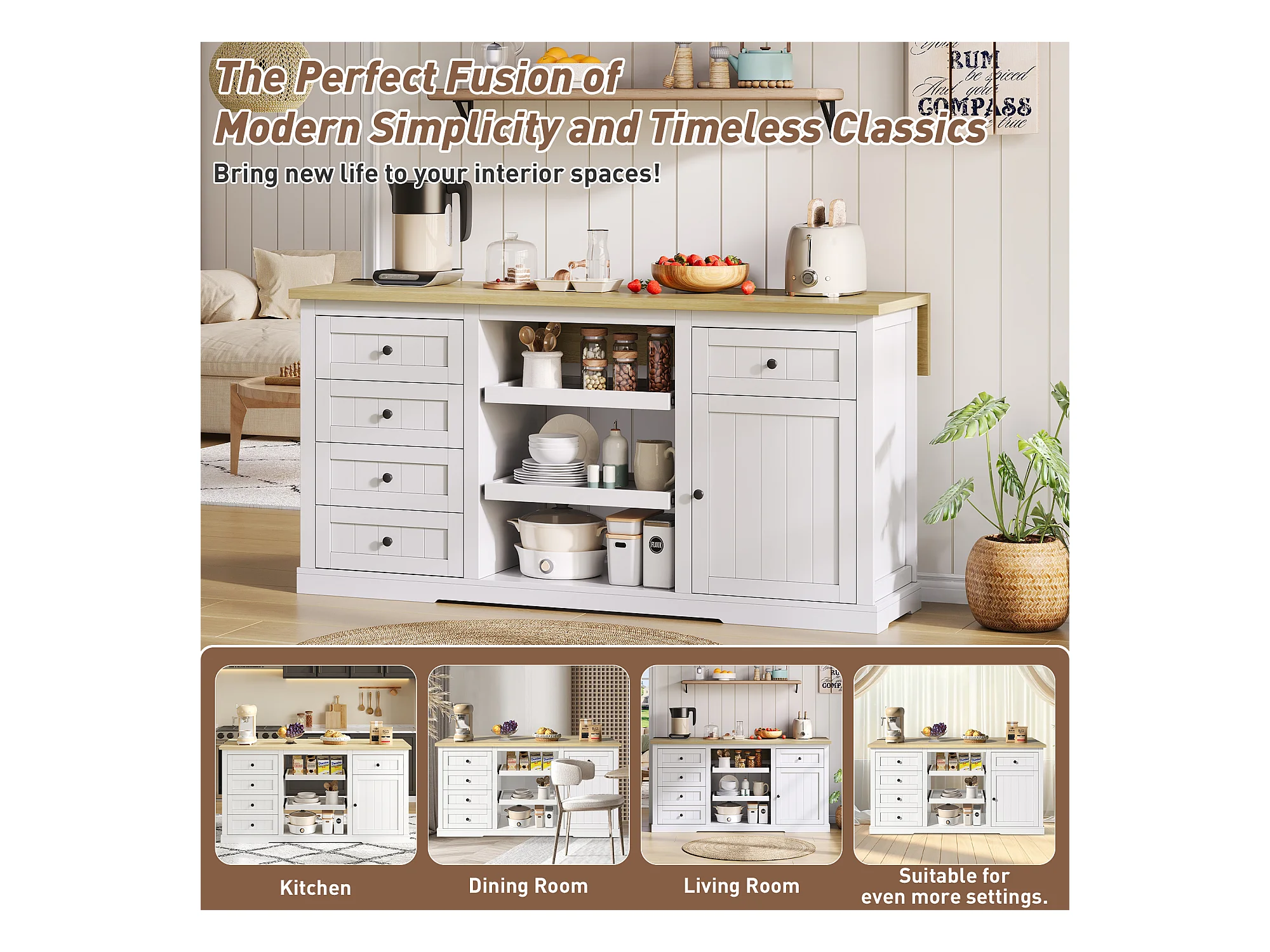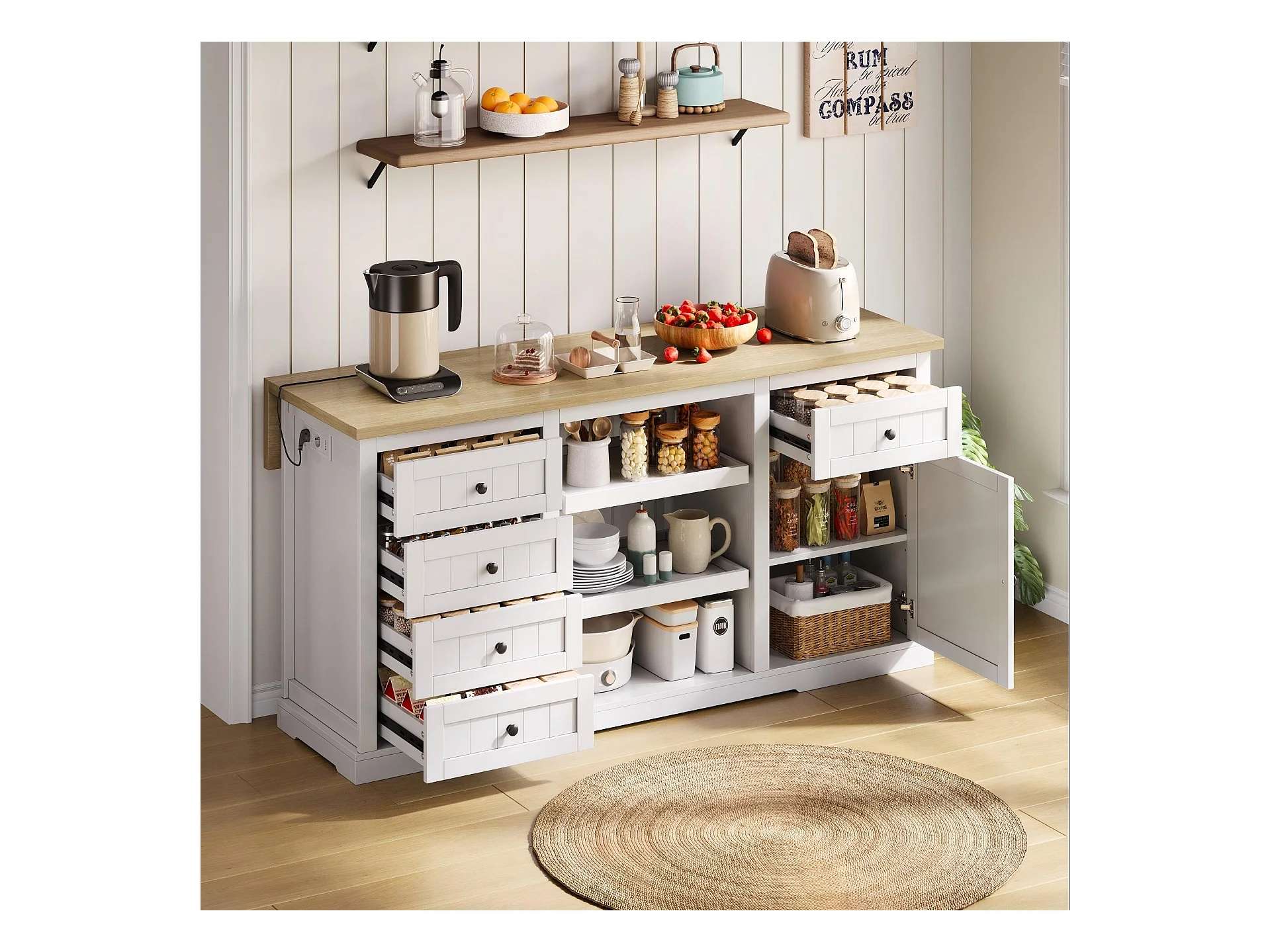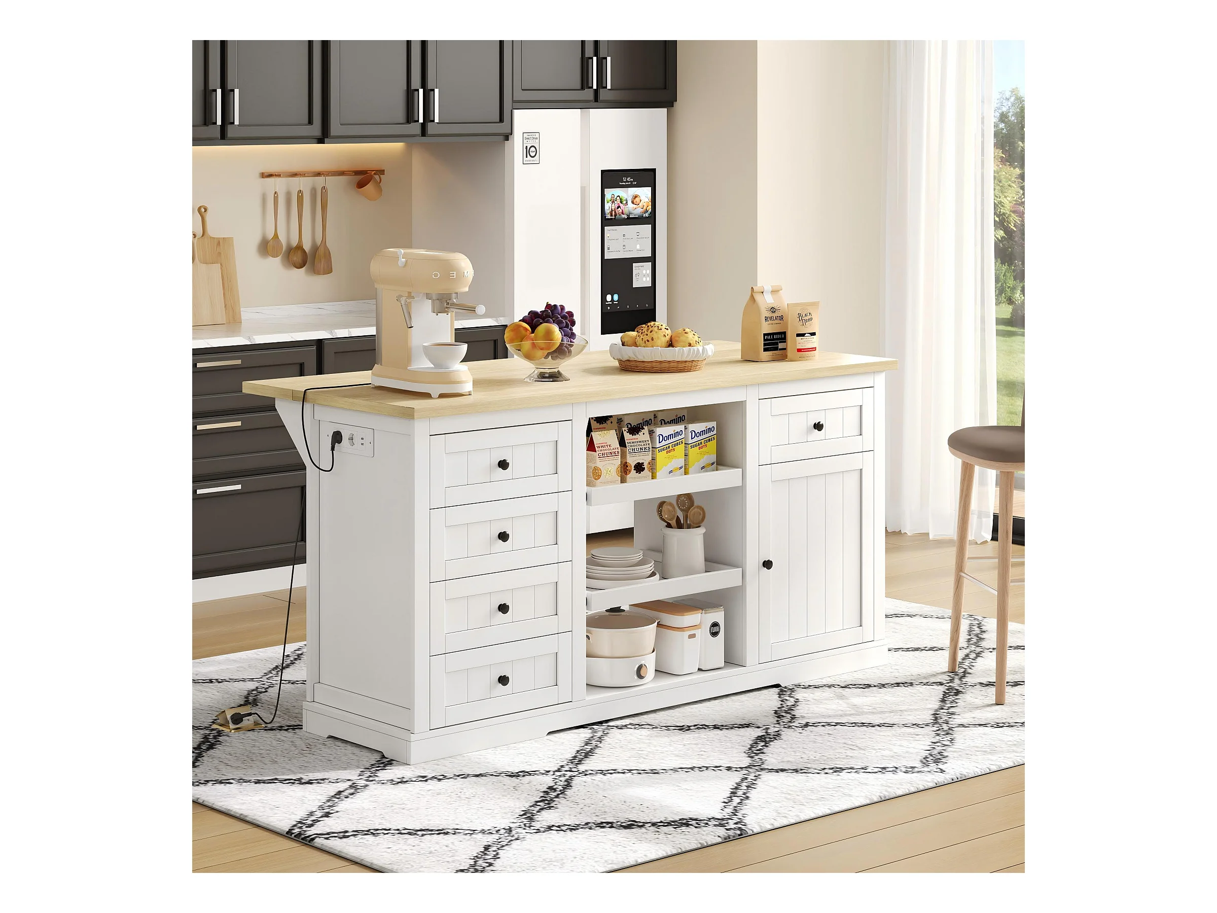 Ilot central de cuisine - avec 5 tiroirs et 2 étagères coulissantes - avec prise de courant - plateau extensible - Naturel + Blanc