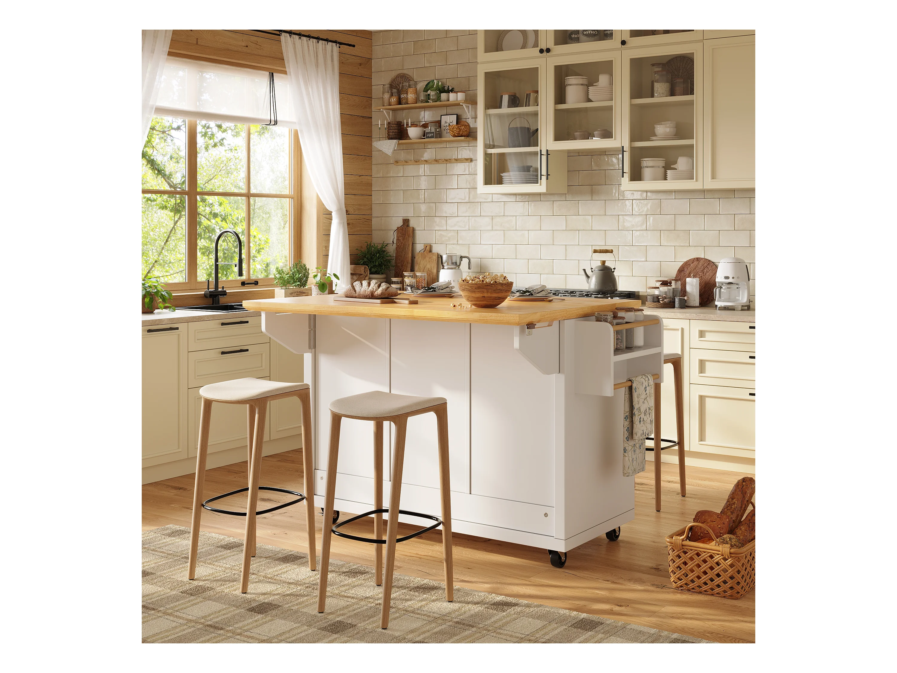 Îlot central extensible à roulettes - 120 x 73(45)x 93 cm - avec étagères + 2 portes + 3 tiroirs - MDF + métal - blanc