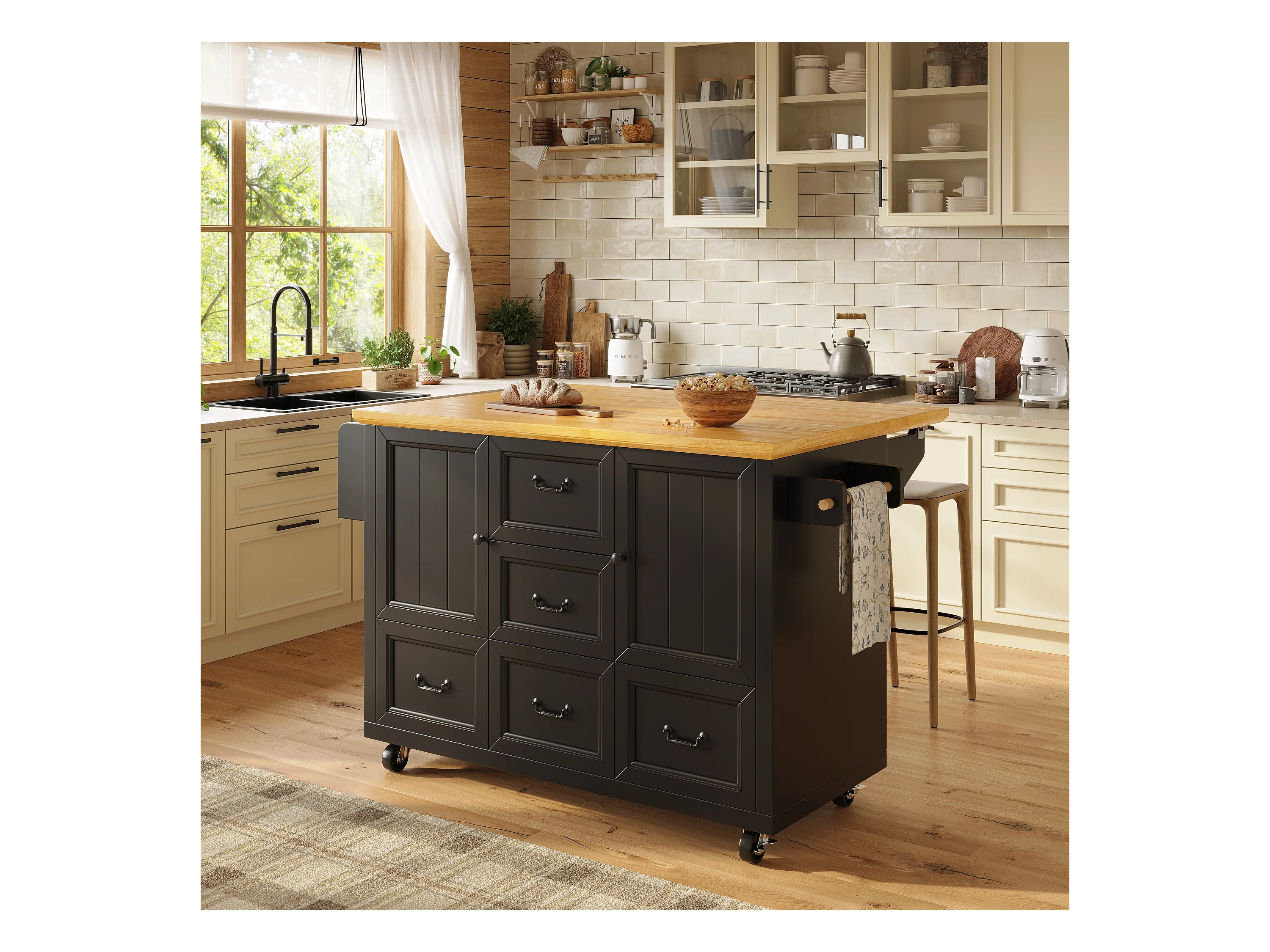 Îlot central extensible à roulettes - 120 x 73(45)x 93 cm - avec étagères + 2 portes + 3 tiroirs - MDF + métal - noir