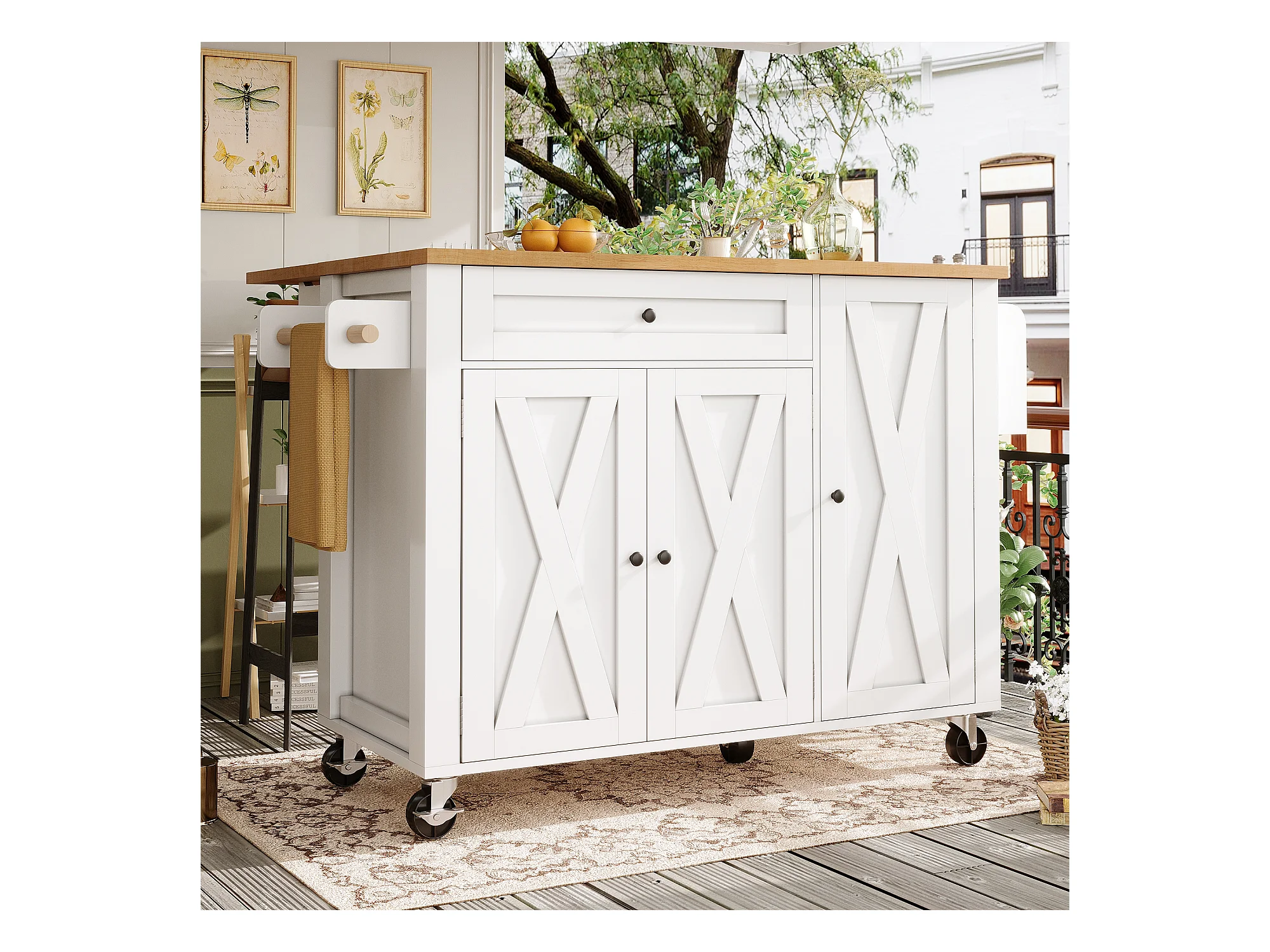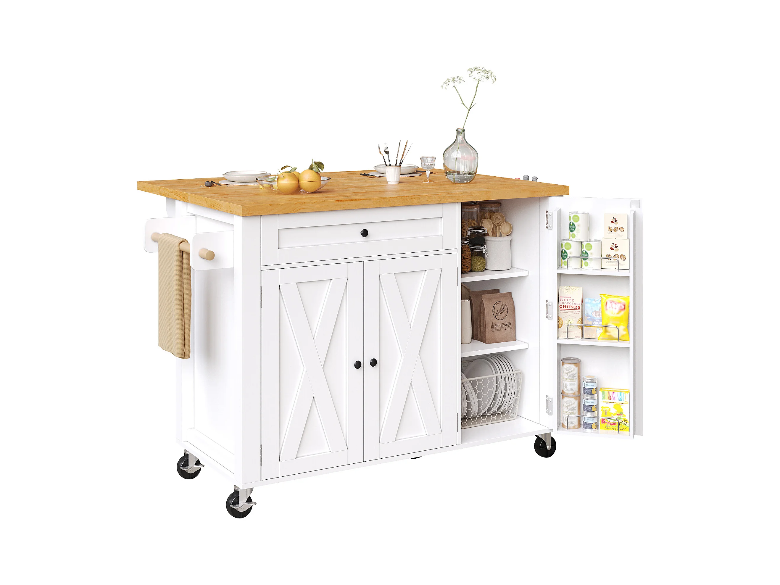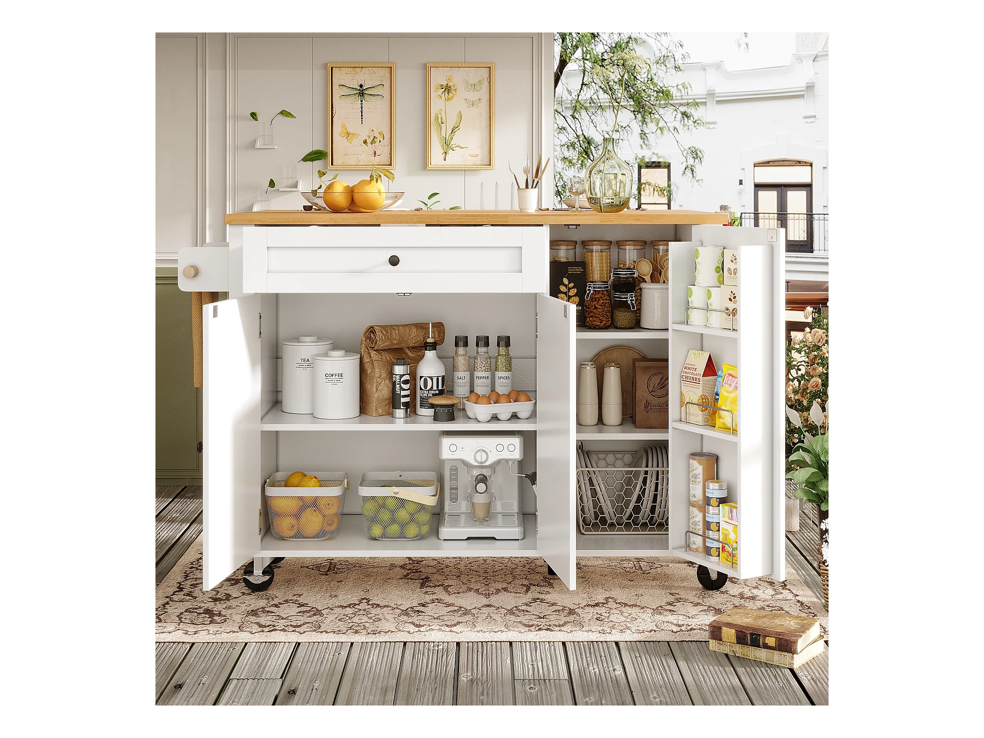 Îlot central extensible à roulettes - 99 x 70 (40) x 90 cm - avec étagères + 3 portes + 1 tiroir - MDF + métal - blanc