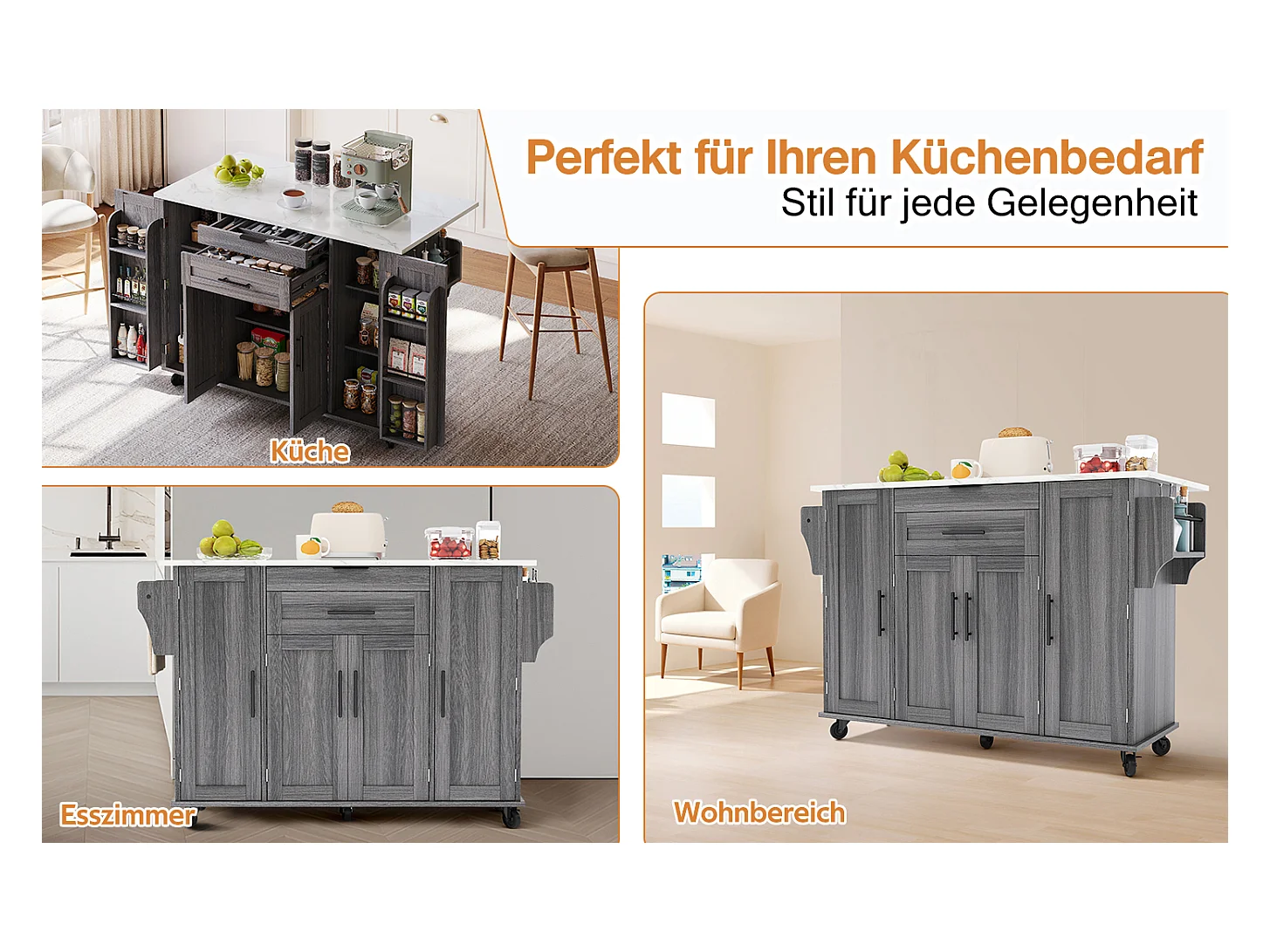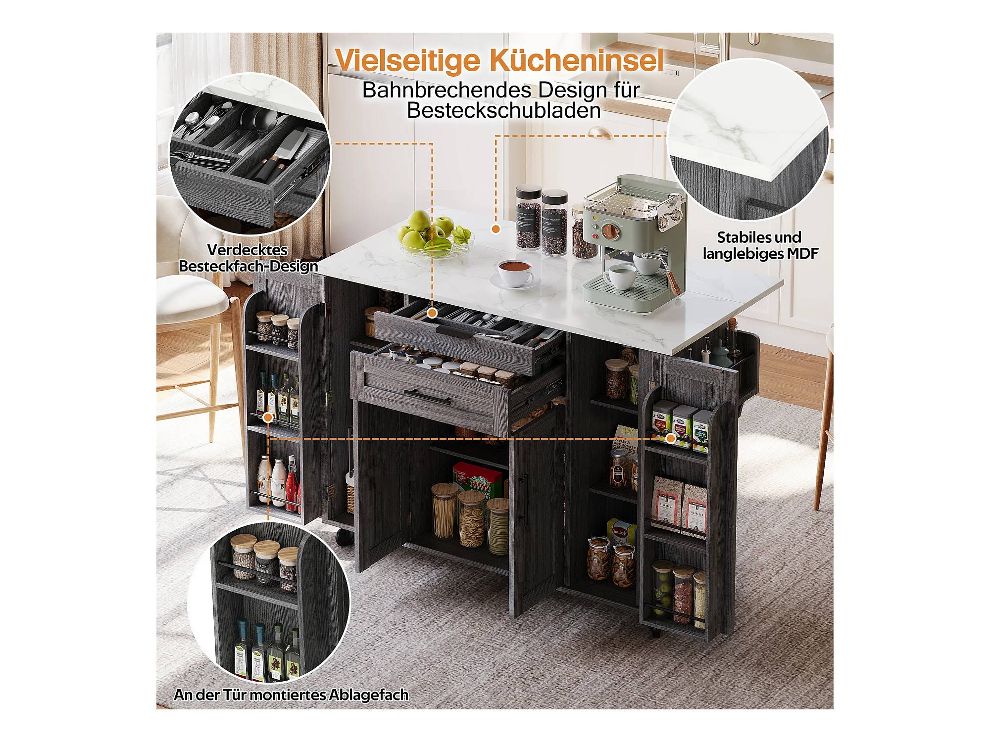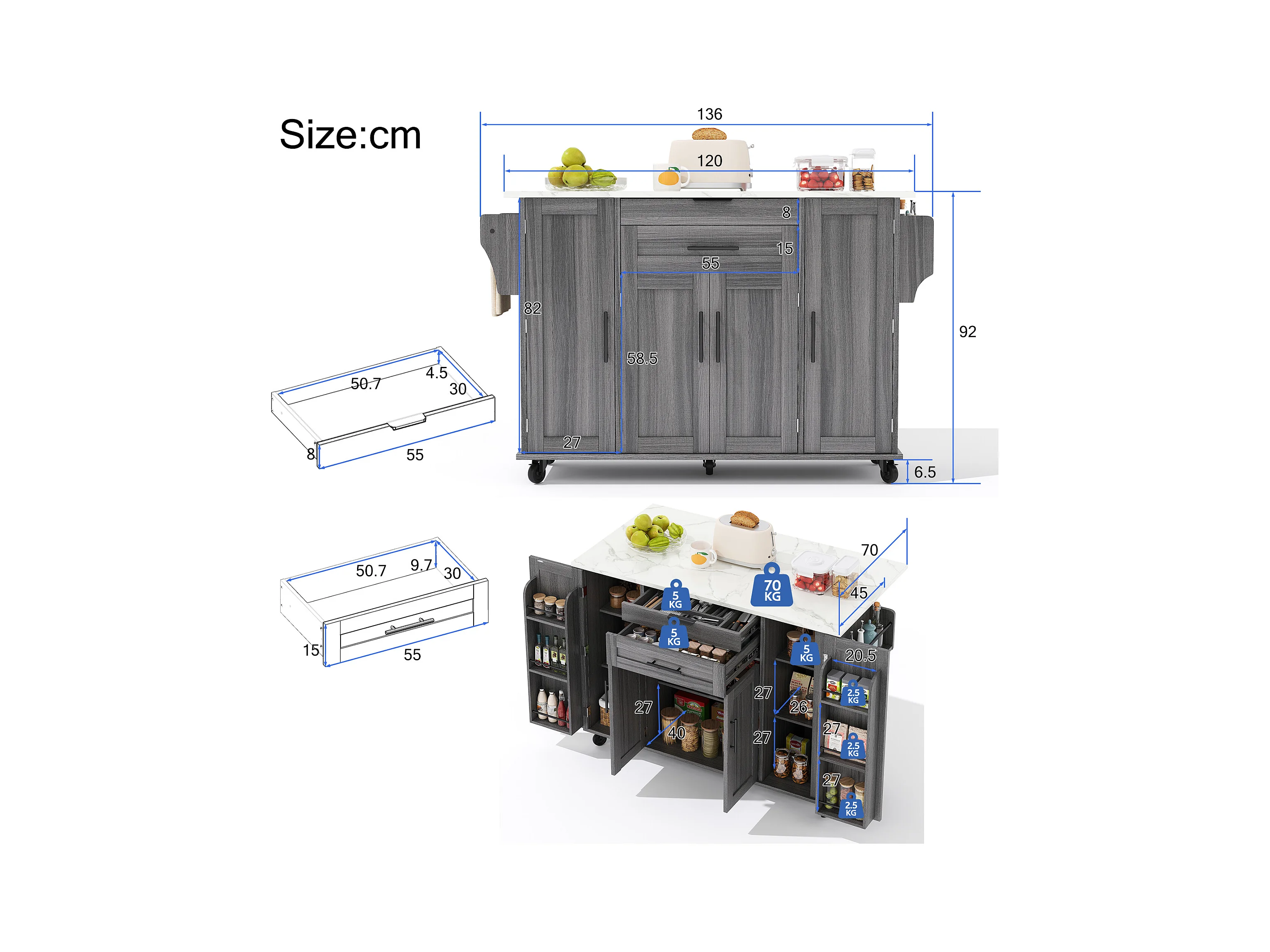 Îlot central mobile avec plan de travail extensible + 2 tiroirs + 4 portes - 136 x 45/70 x 92 cm - MDF - gris