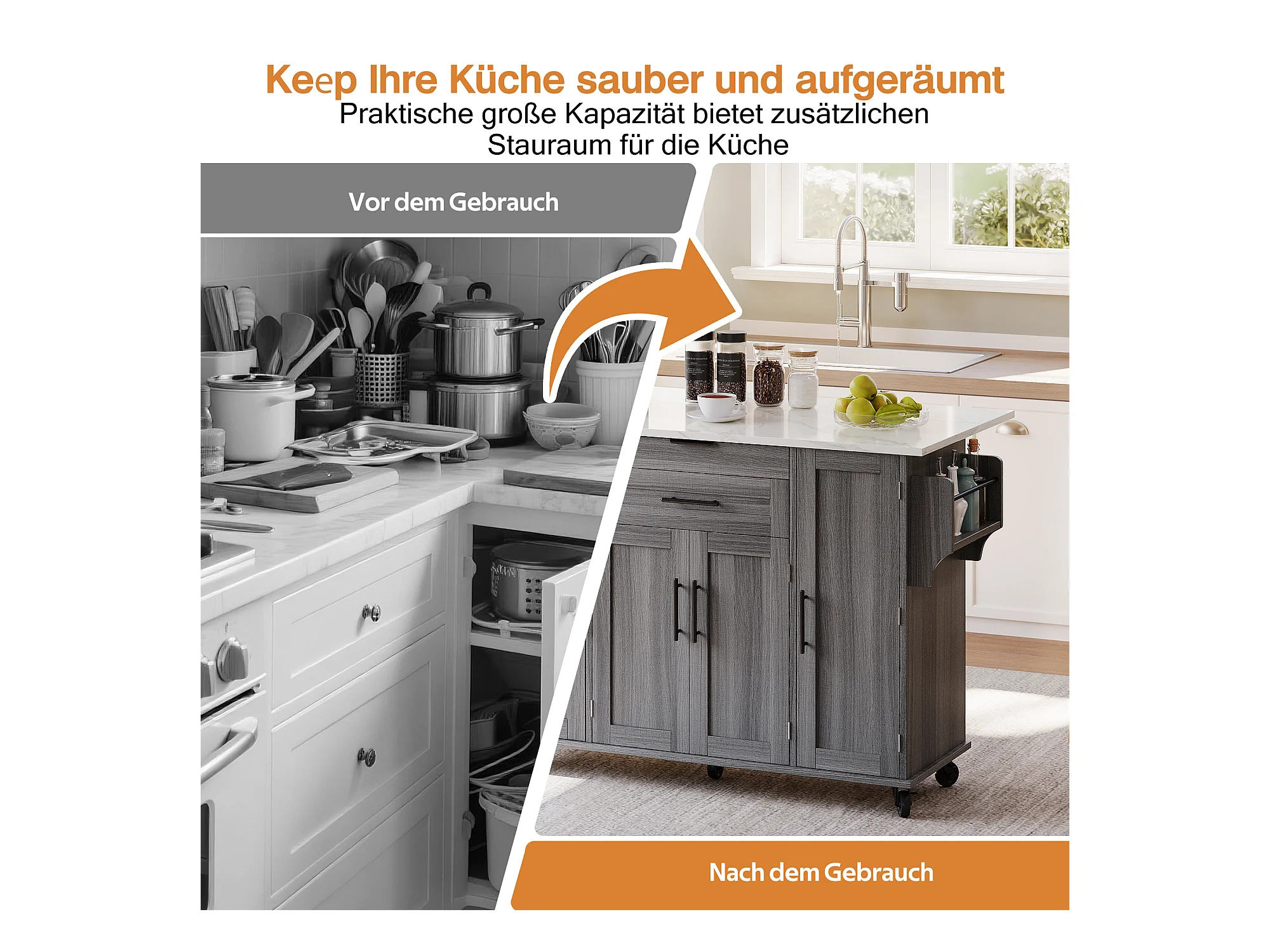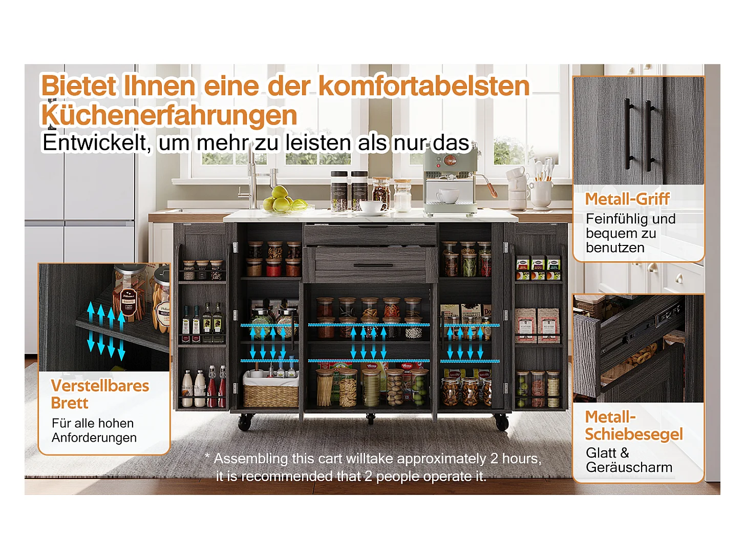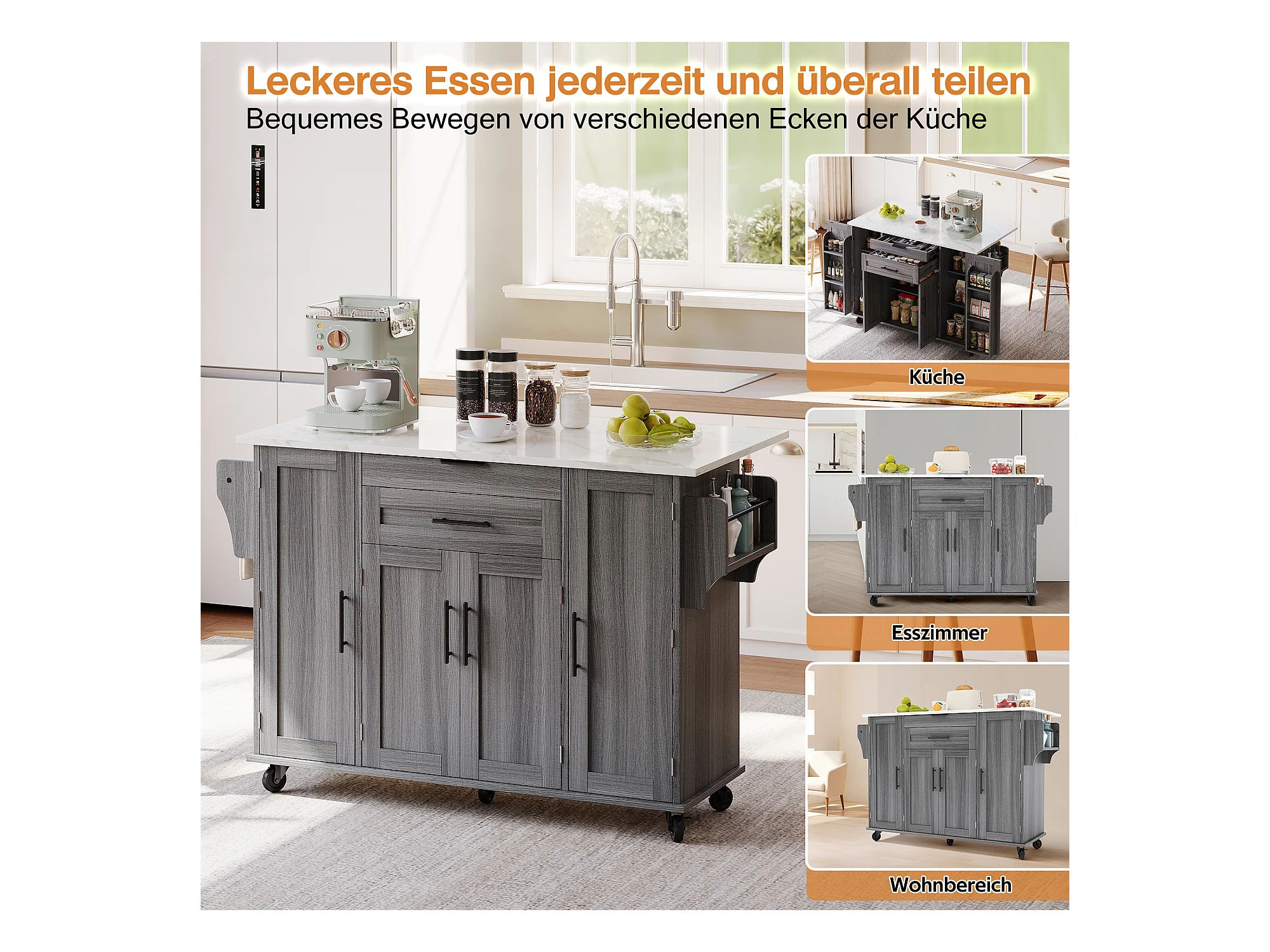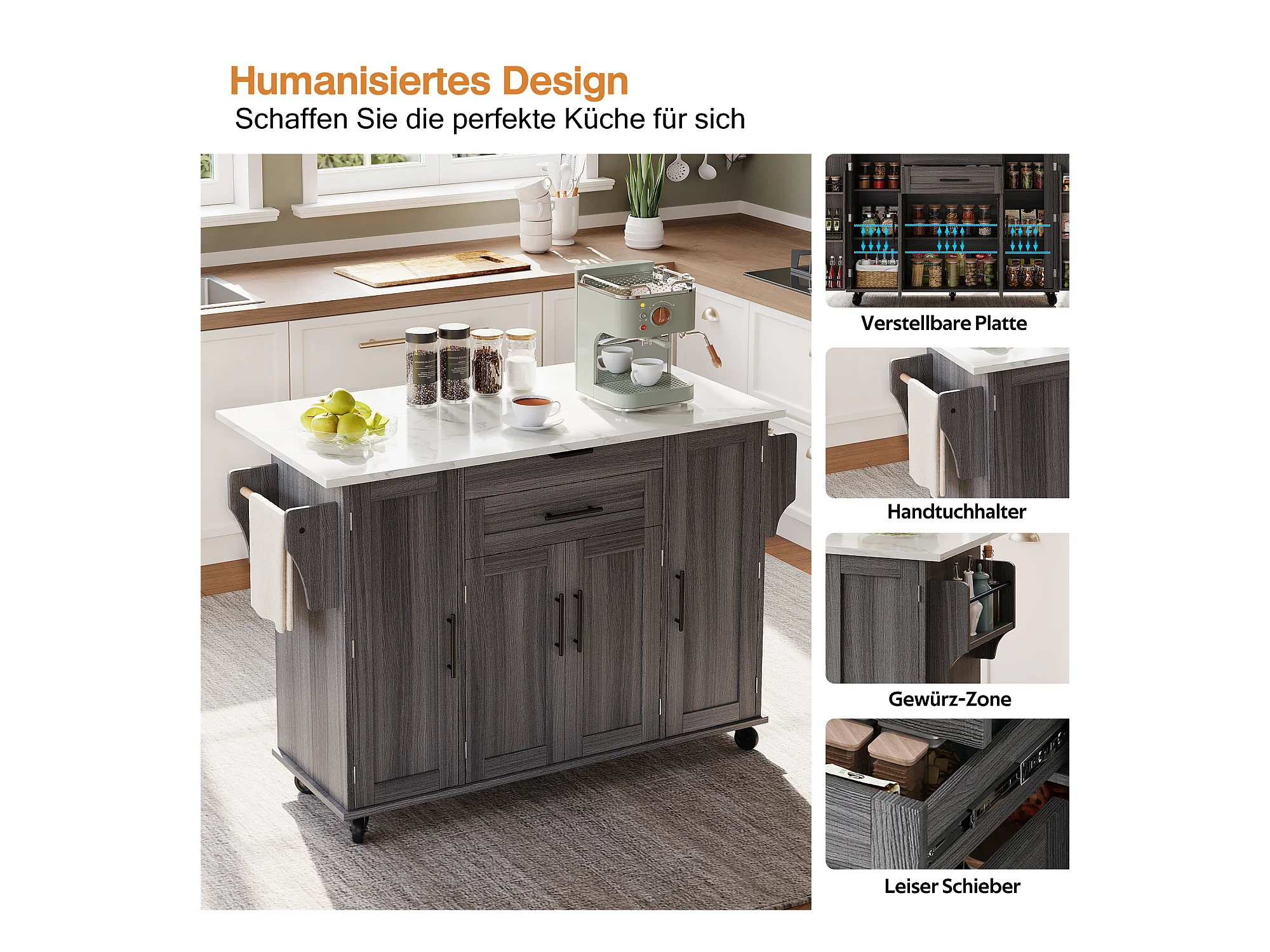 Îlot central mobile avec plan de travail extensible + 2 tiroirs + 4 portes - 136 x 45/70 x 92 cm - MDF - gris