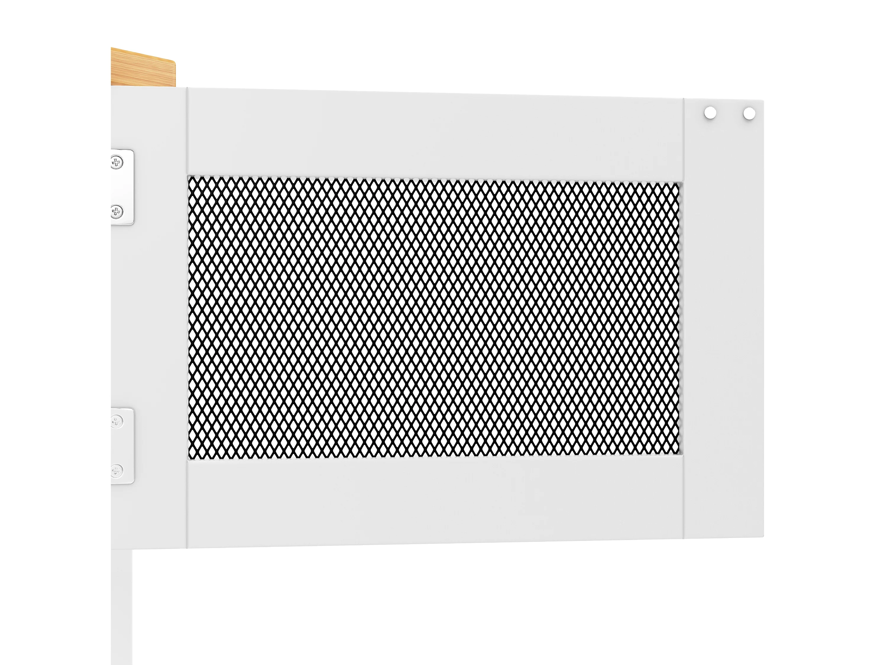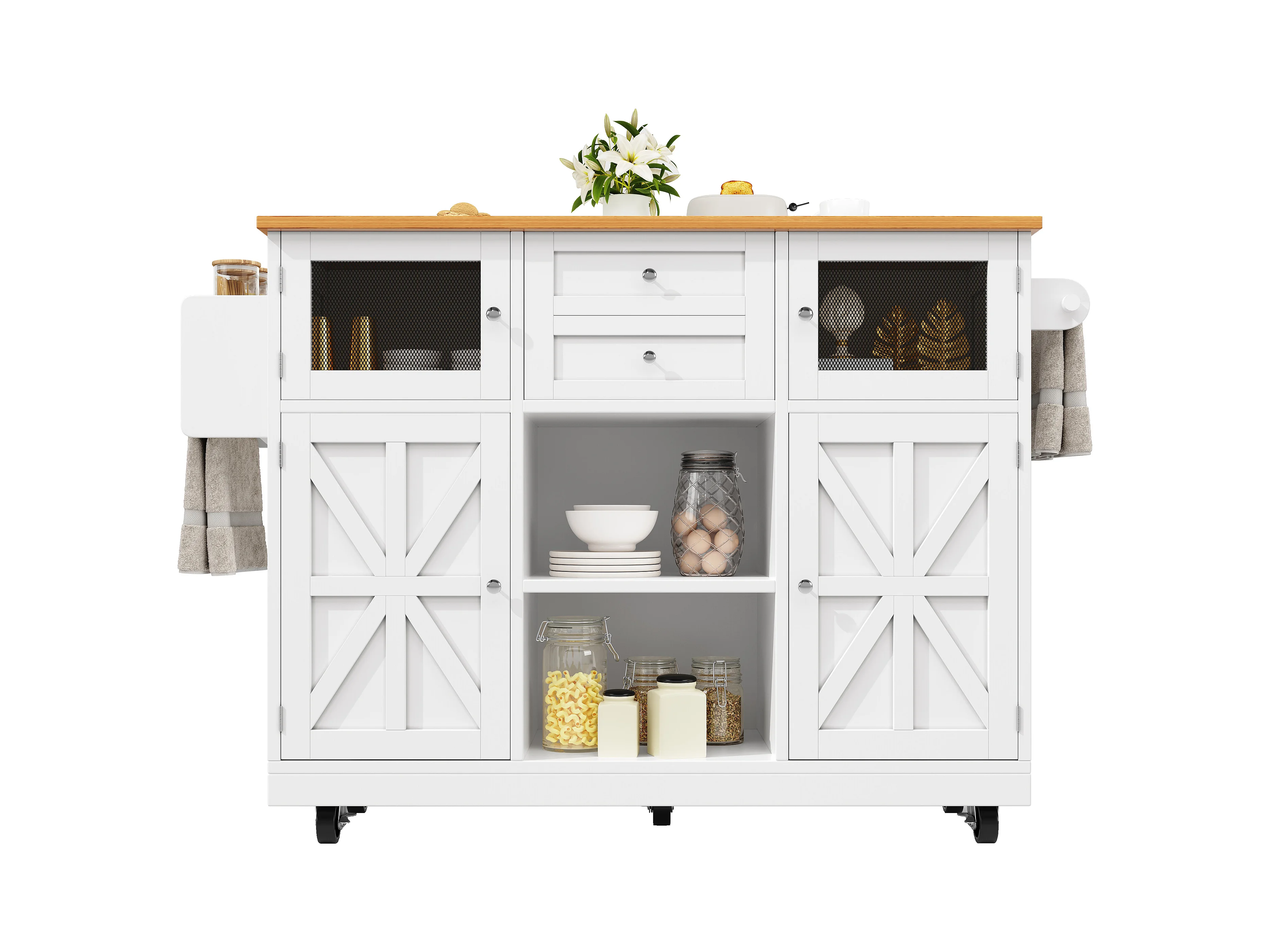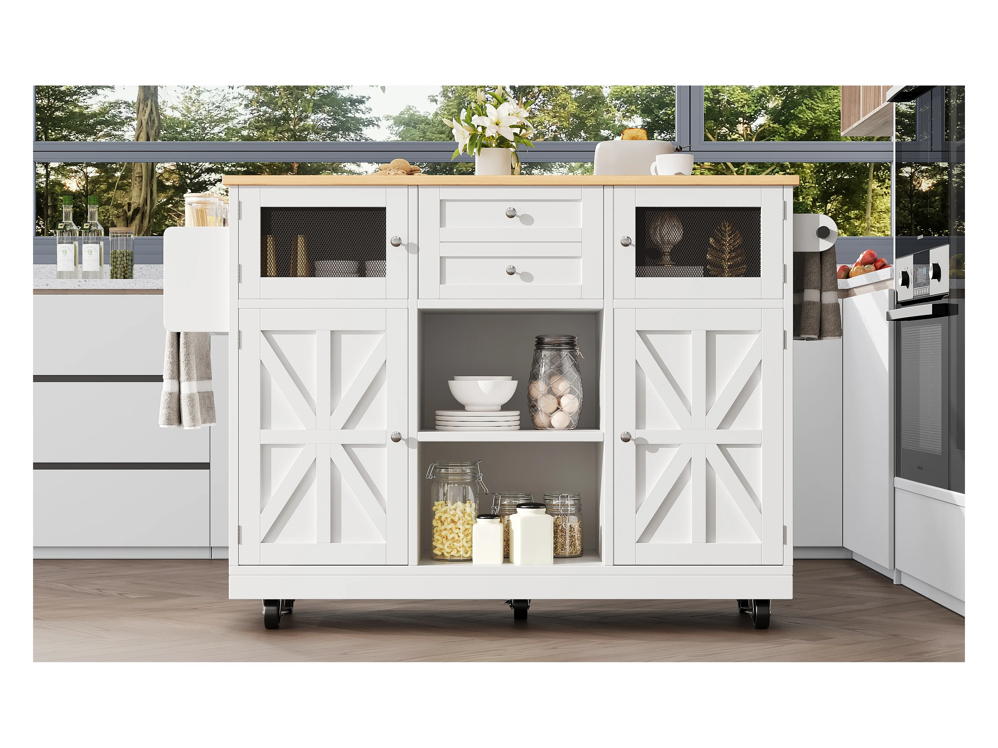 Îlot de cuisine mobile extensible, MDF et métal, blanc avec plateau bois (140x40x93.5cm)