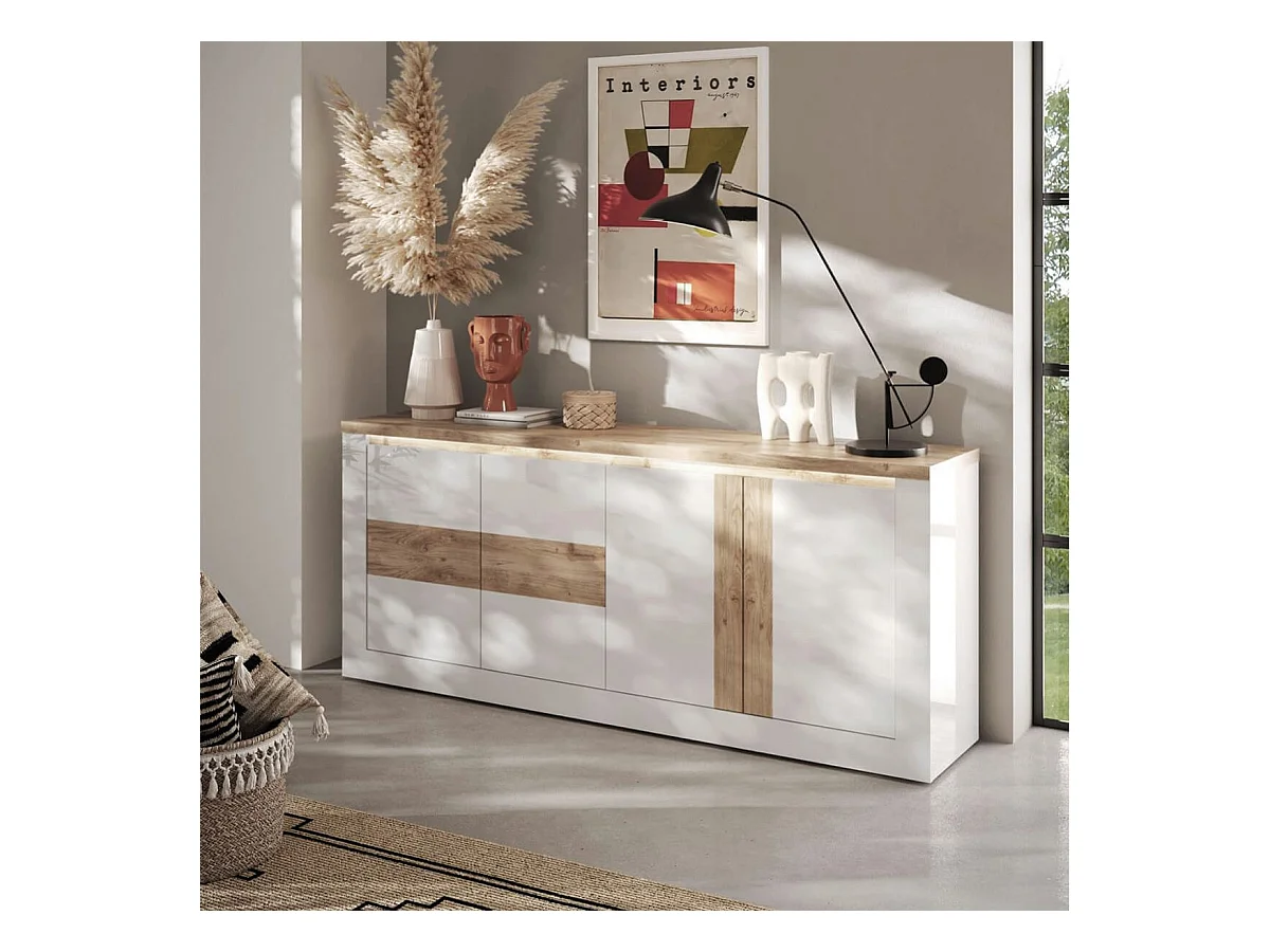 ISALIA - Buffet 4 portes blanc et aspect chêne finition Cadiz avec LED