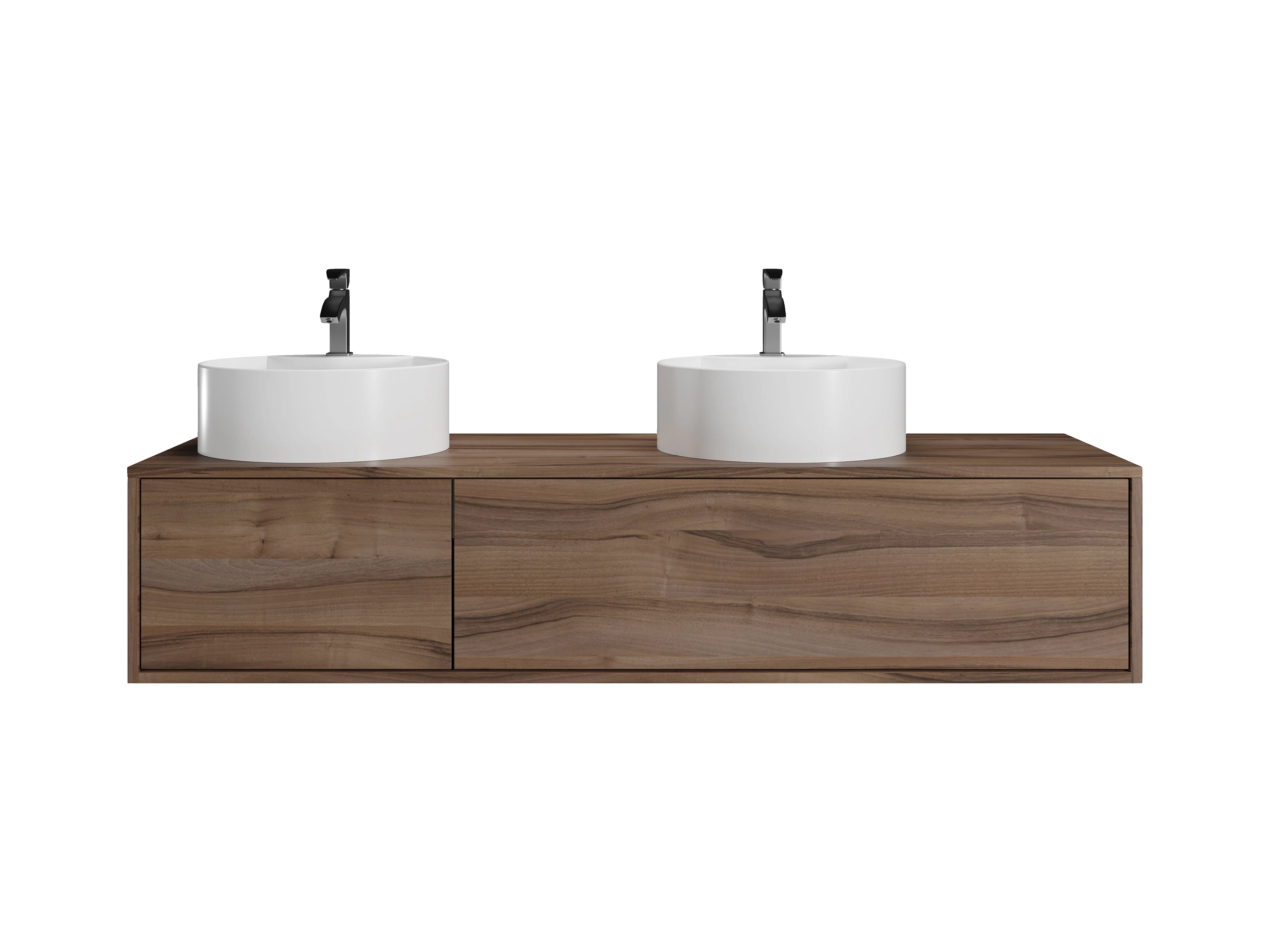 Meuble de salle de bain suspendu coloris naturel foncé avec double vasque à poser ronde- L150 cm - ISAURE II