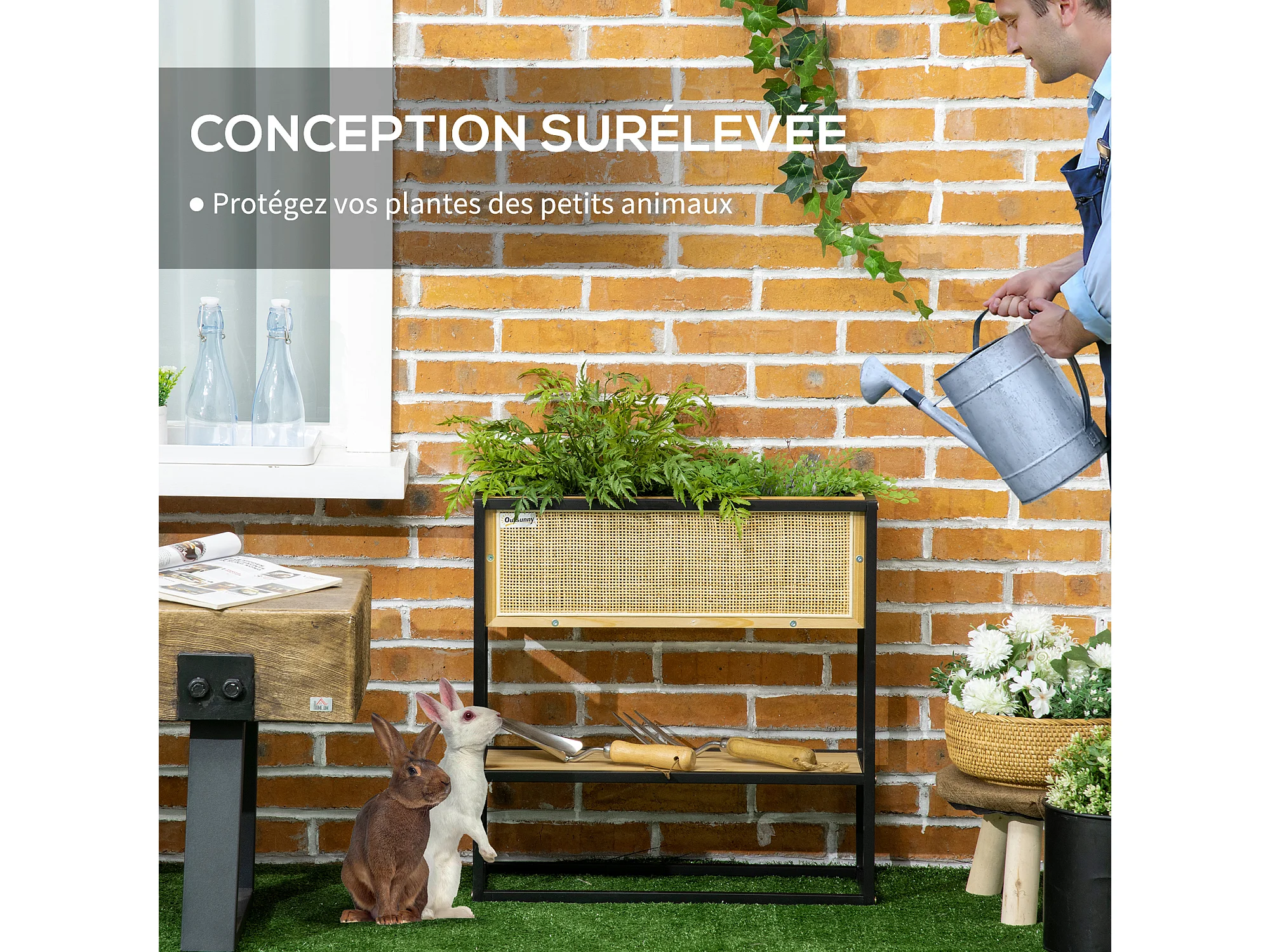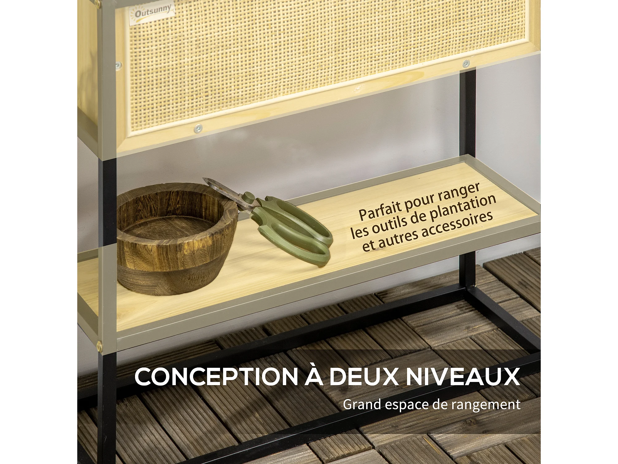 Jardinière sur pied style naturel - géotextile inclus, étagère intégrée - métal noir bois sapin verni bambou tressé