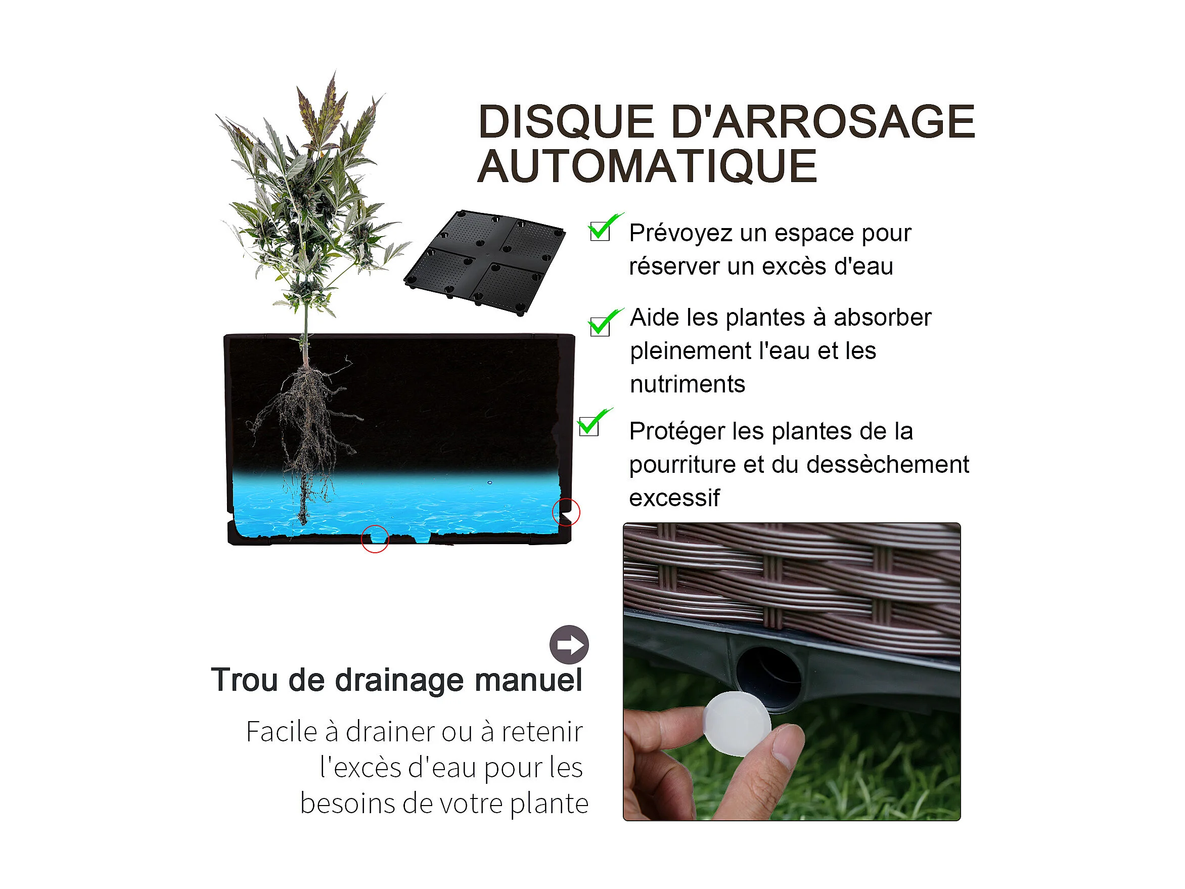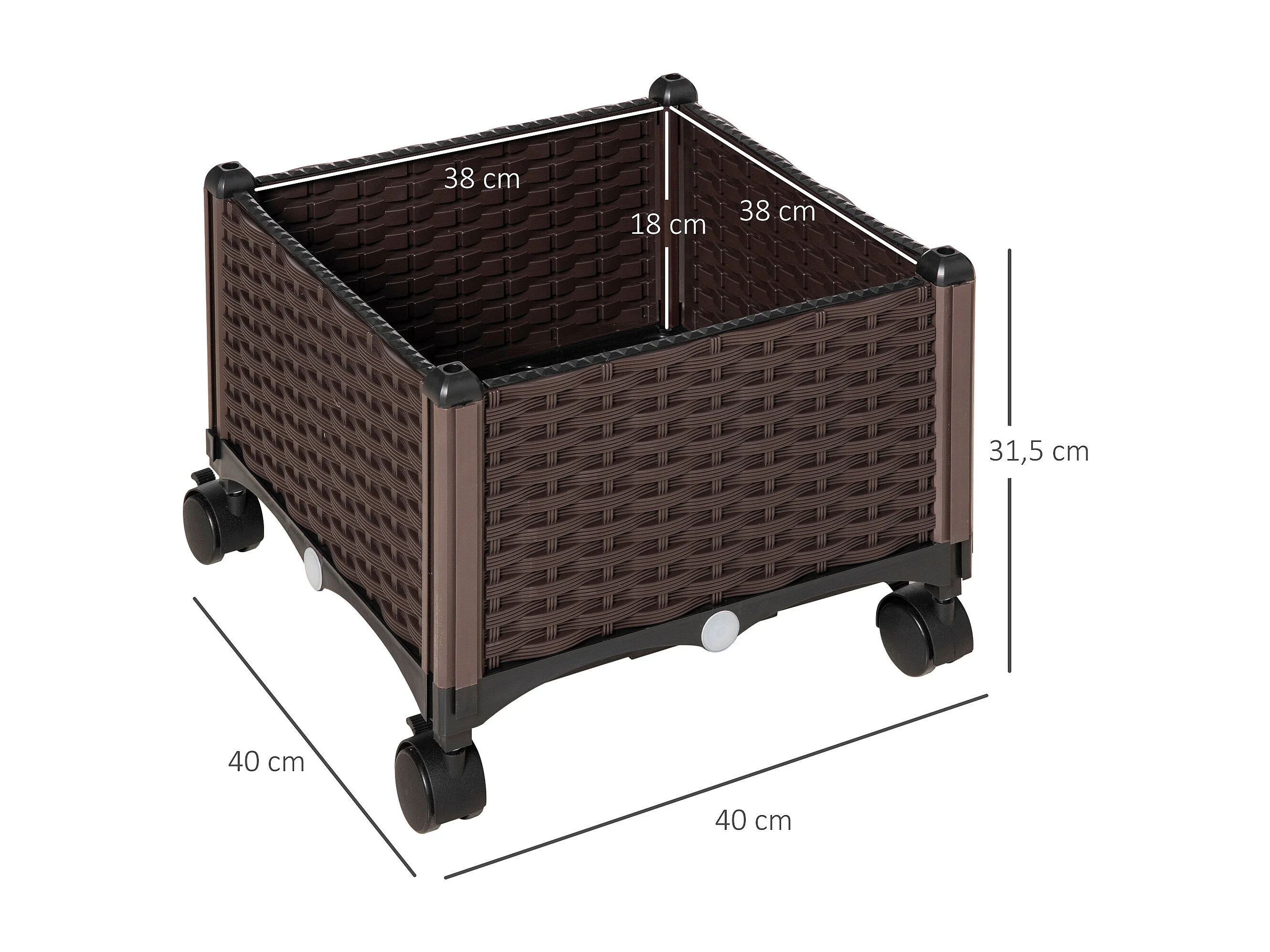 Jardinière sur roulettes dim. 40L x 40l x 31H cm insert d'irrigation plastique imitation rotin tressé chocolat