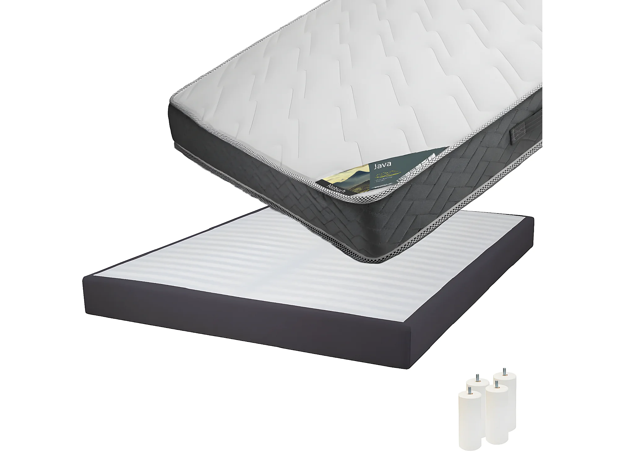 JAVA - Pack Matelas 140x190 + Sommier Tapissier Démontable 2x20 Lattes Anthracites + Pieds Blancs 15cm