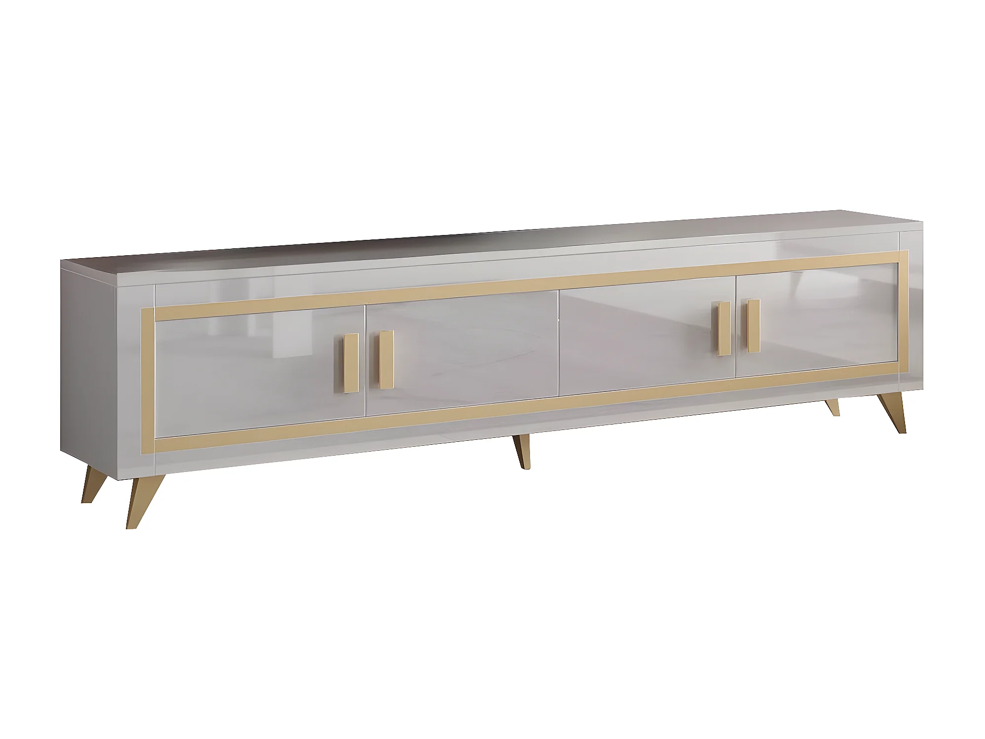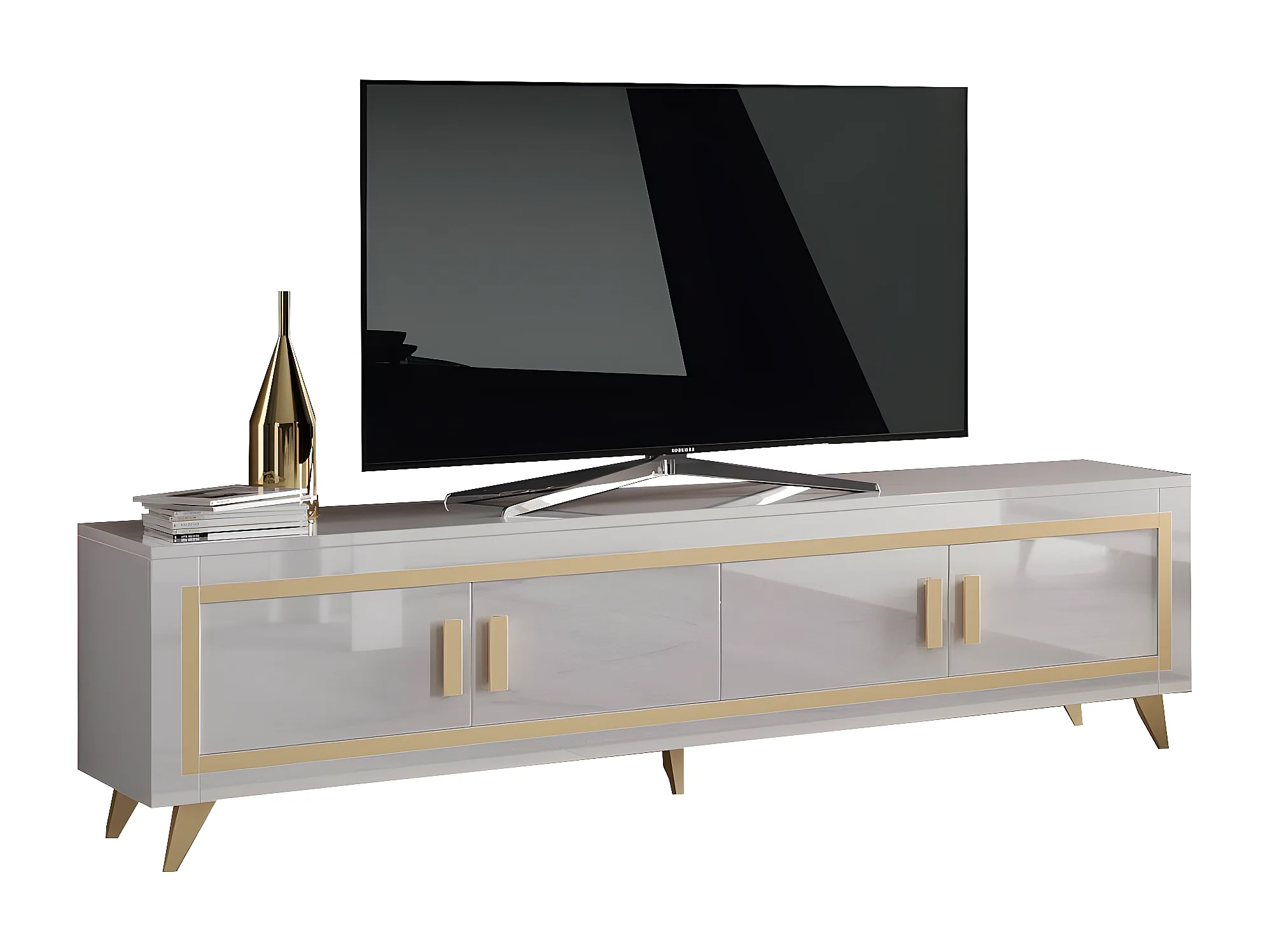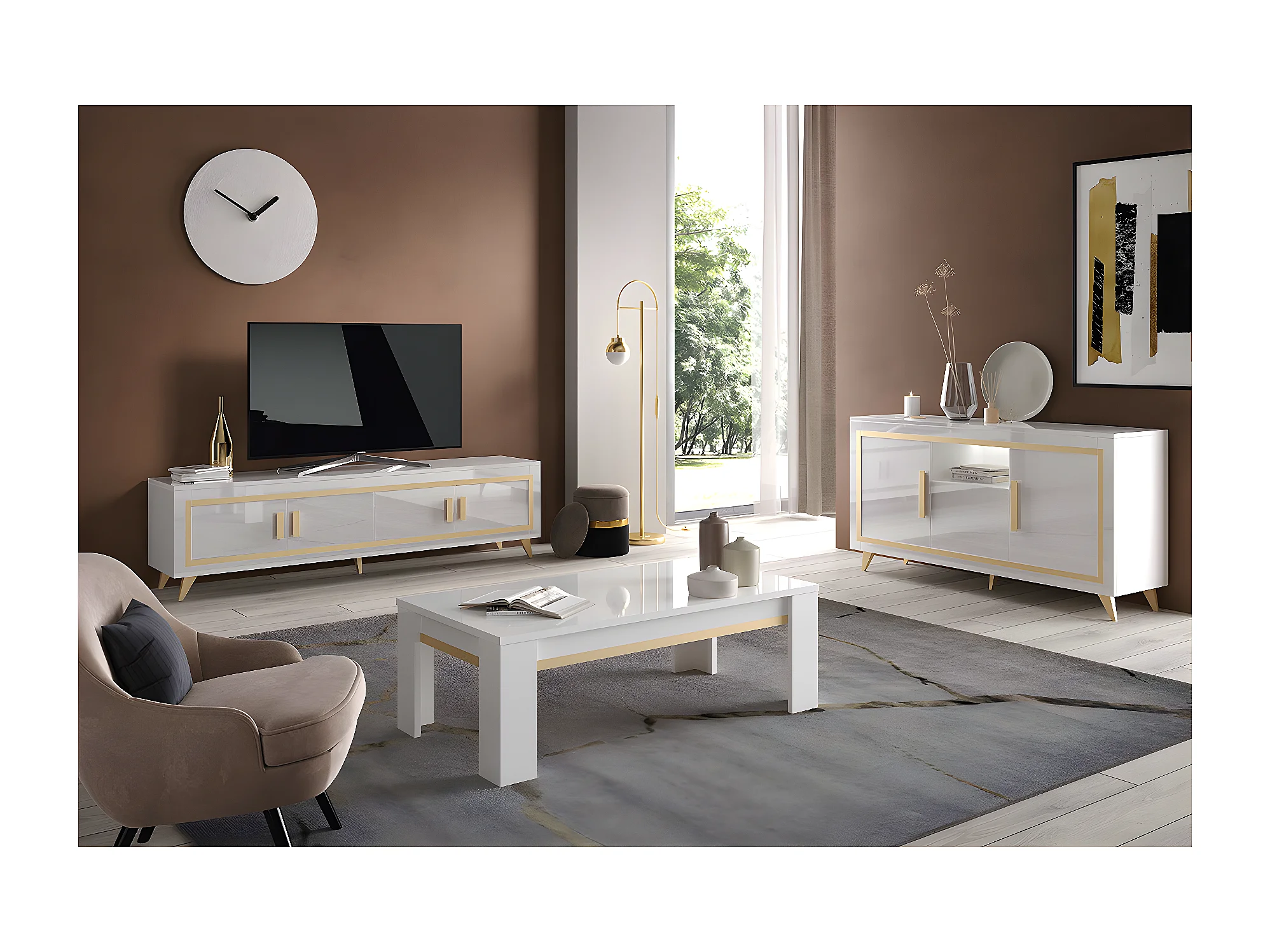JEMMA - Meuble TV 4 Portes Laqué Blanc et Décor Doré