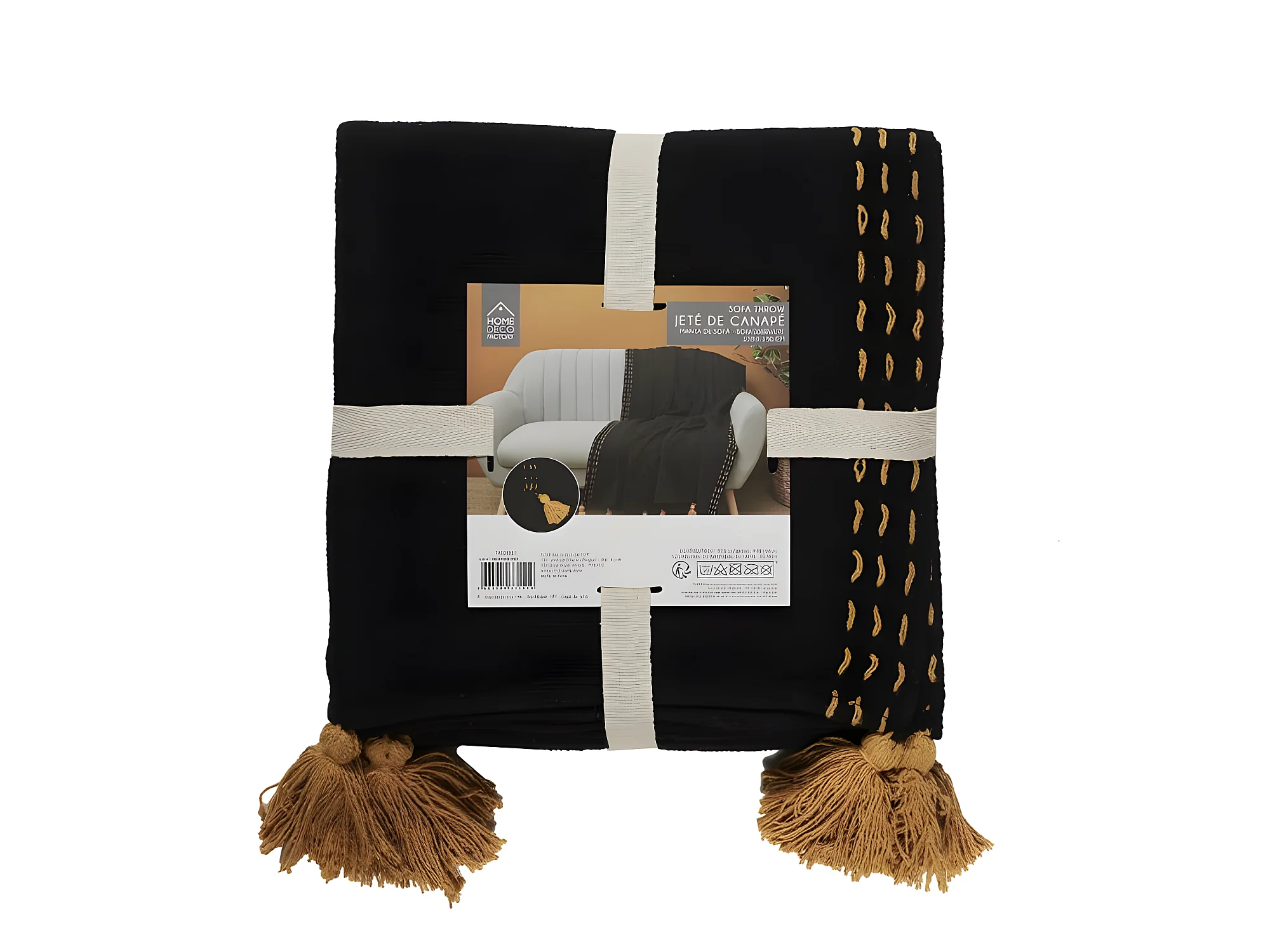 Jete De Canape Surpique Pompons Noir 130x150cm Noir, Jaune