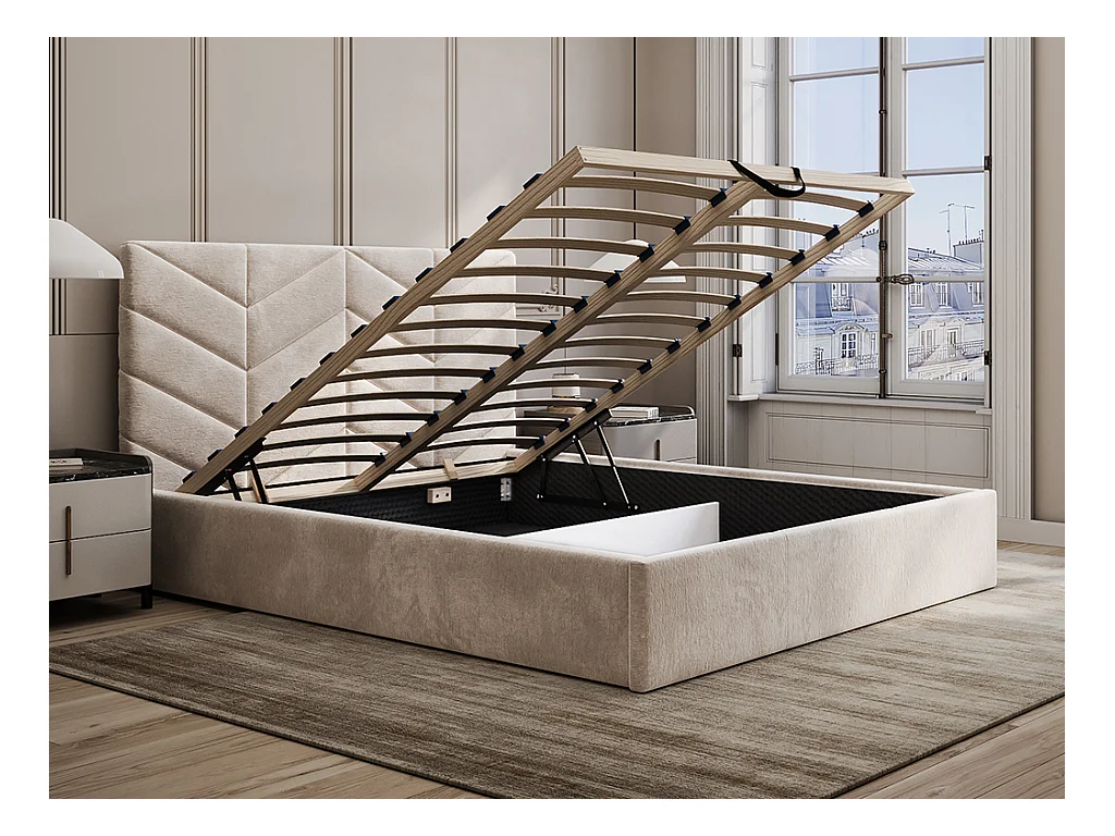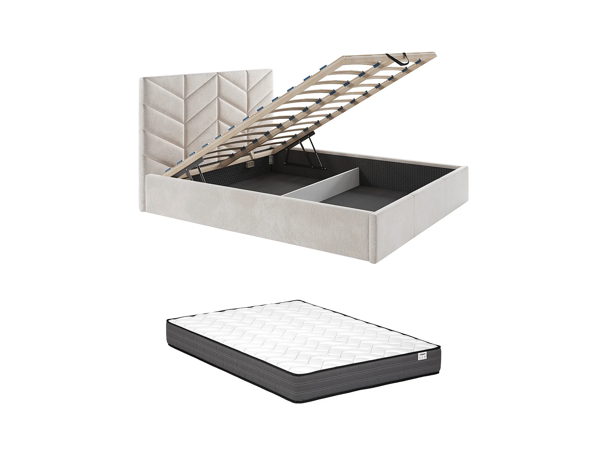 Lit coffre 200 x 200 cm - Tissu texturé - Crème + Matelas - JUSTANI