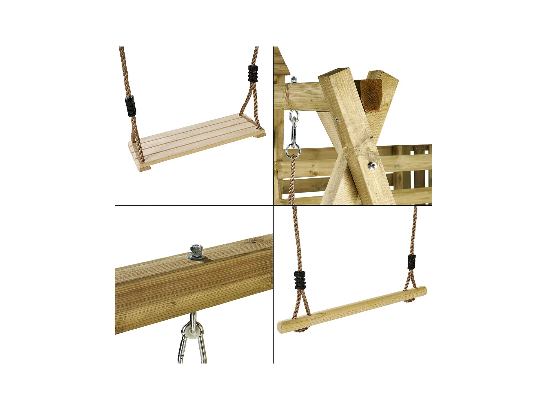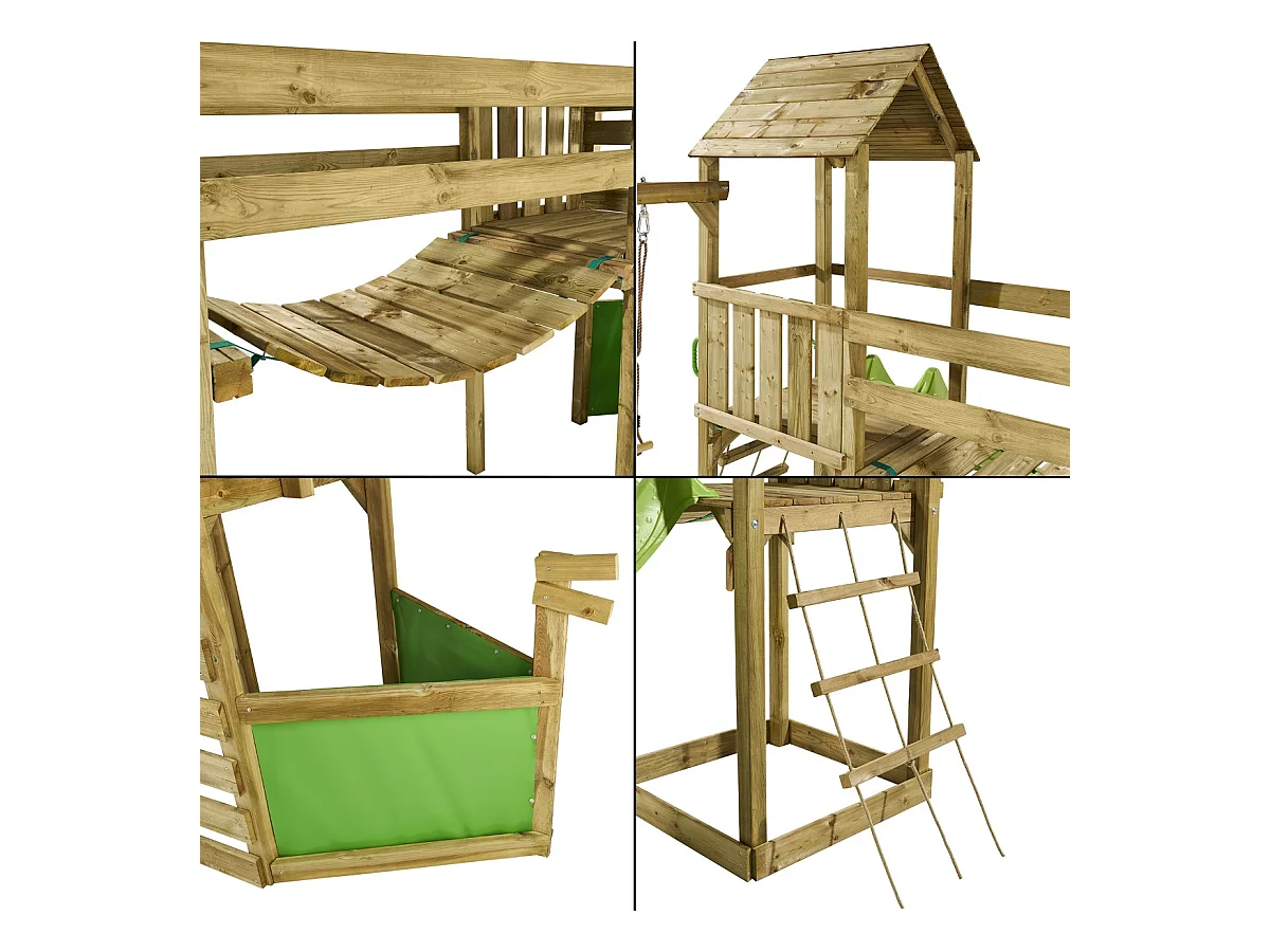 Kangui - Aire de jeux pirate en bois avec vigie WILLI - Balançoire, trapèze, toboggan, mur d'escalade, cabane sur plateforme, pont suspendu