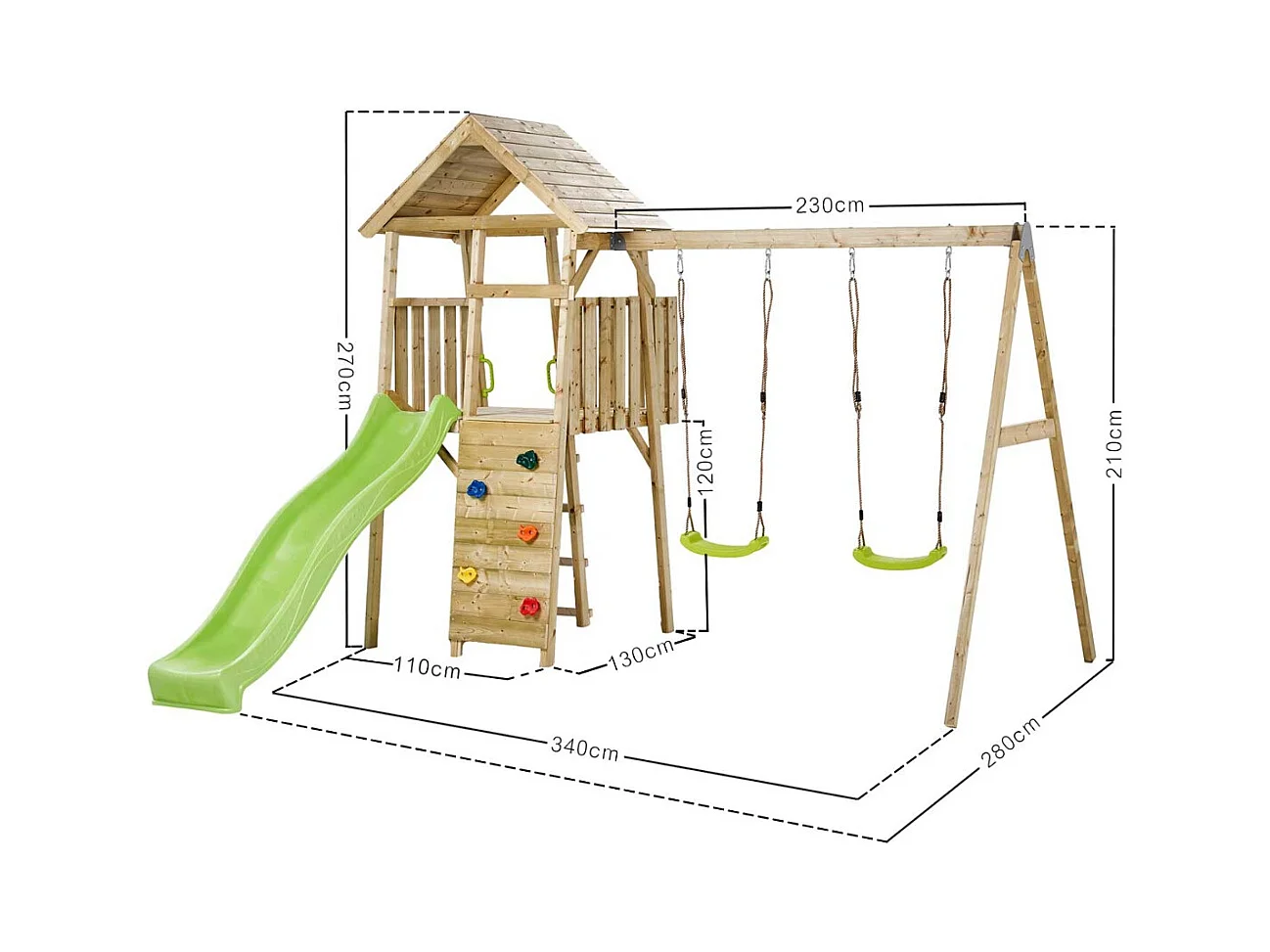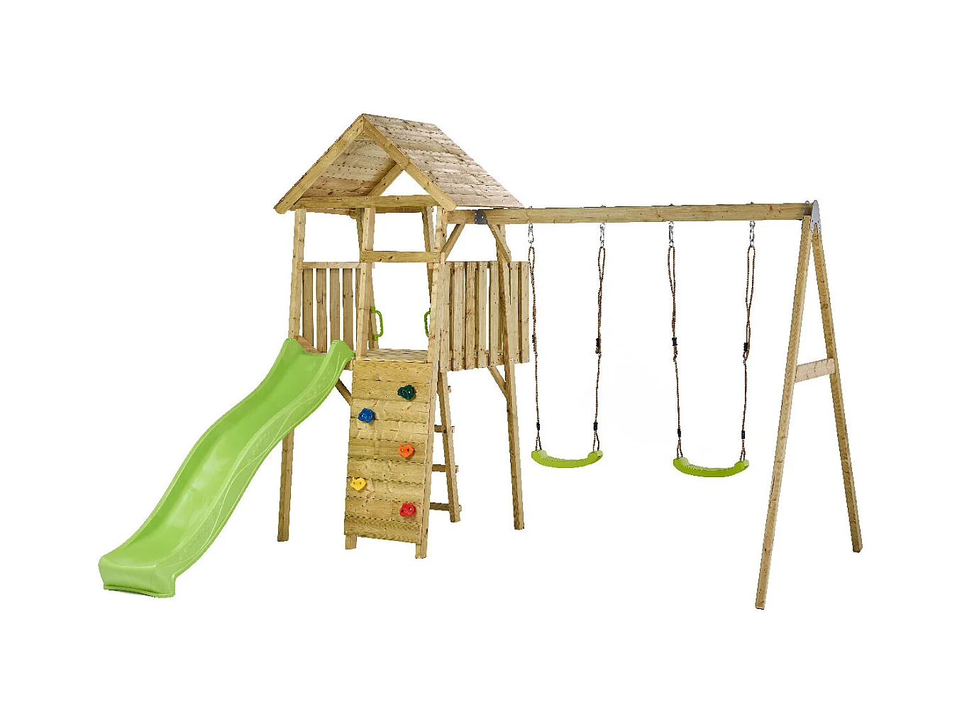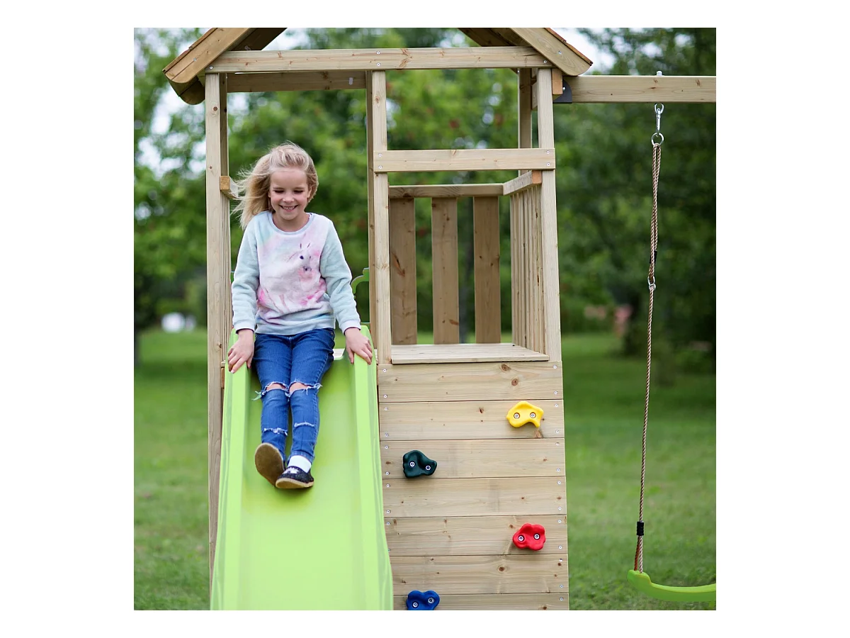 KANGUI Aire de jeux portique en bois WOODI - Double balançoire, toboggan, mur d'escalade, cabane, échelle