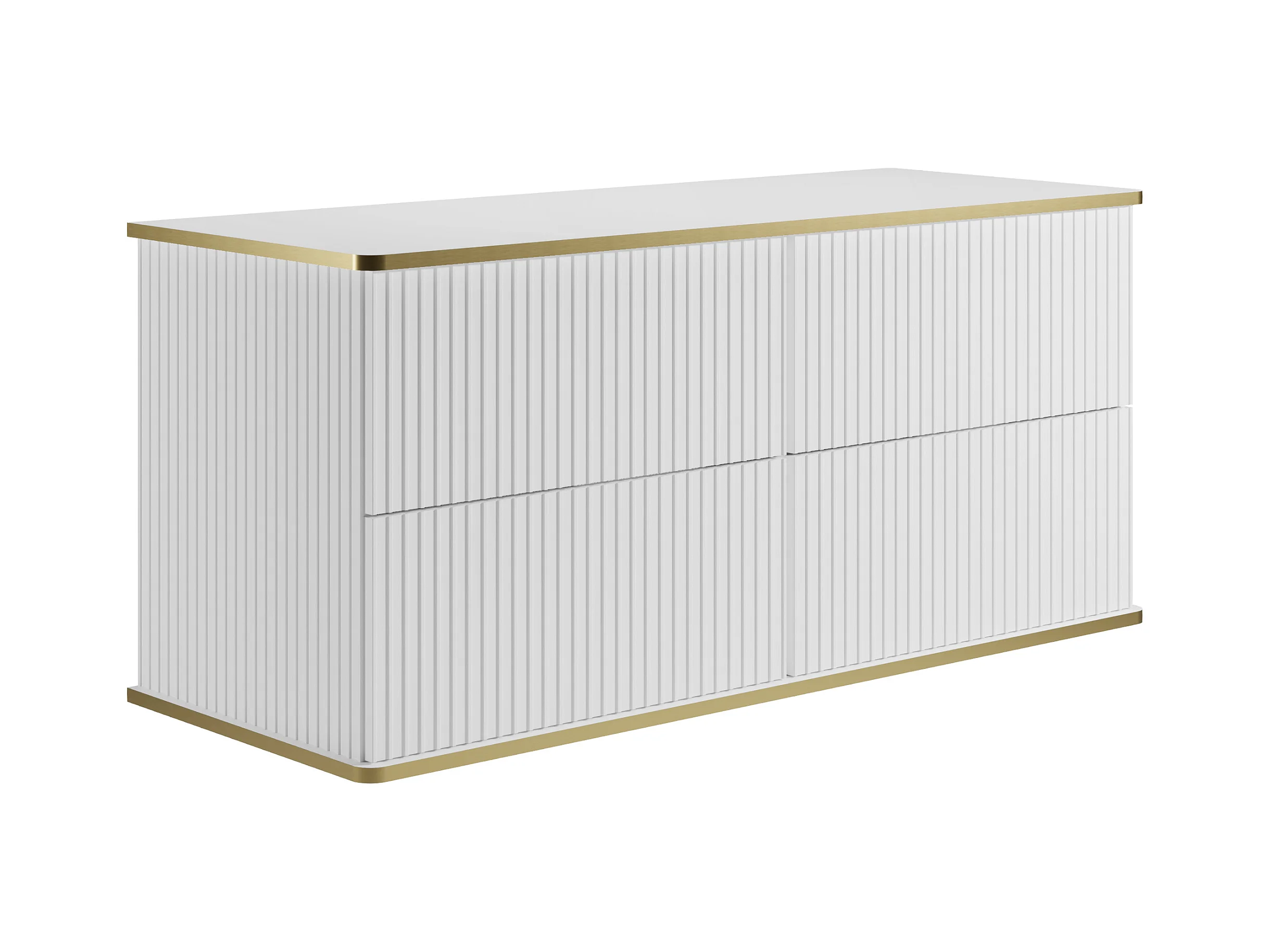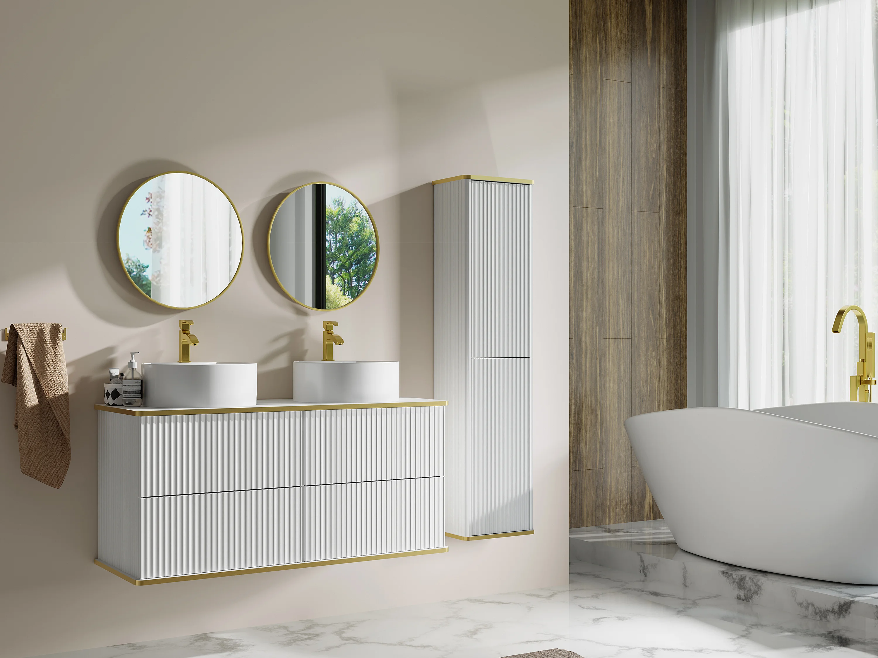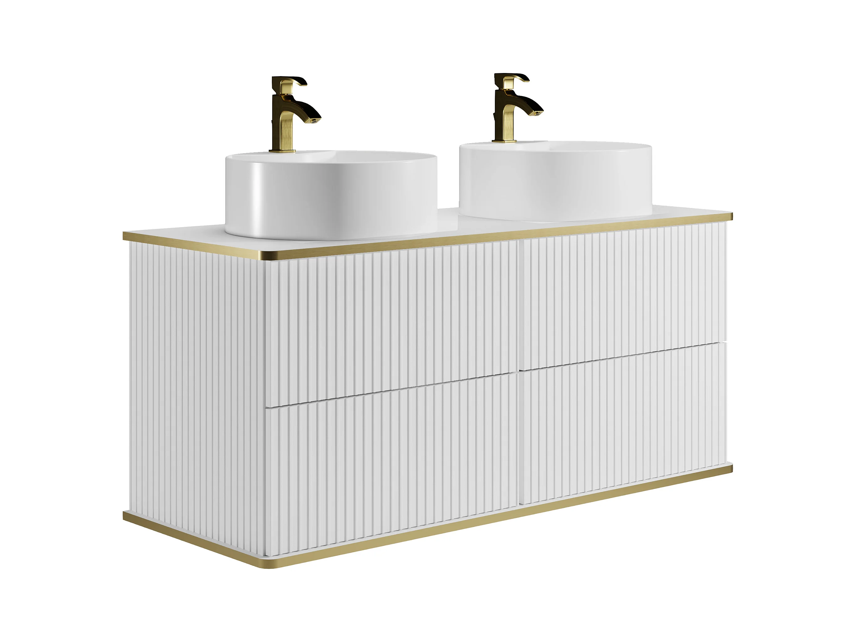 Meuble de salle de bain suspendu strié avec double vasque à poser ronde et colonne - Blanc - 120 cm - KELIZA