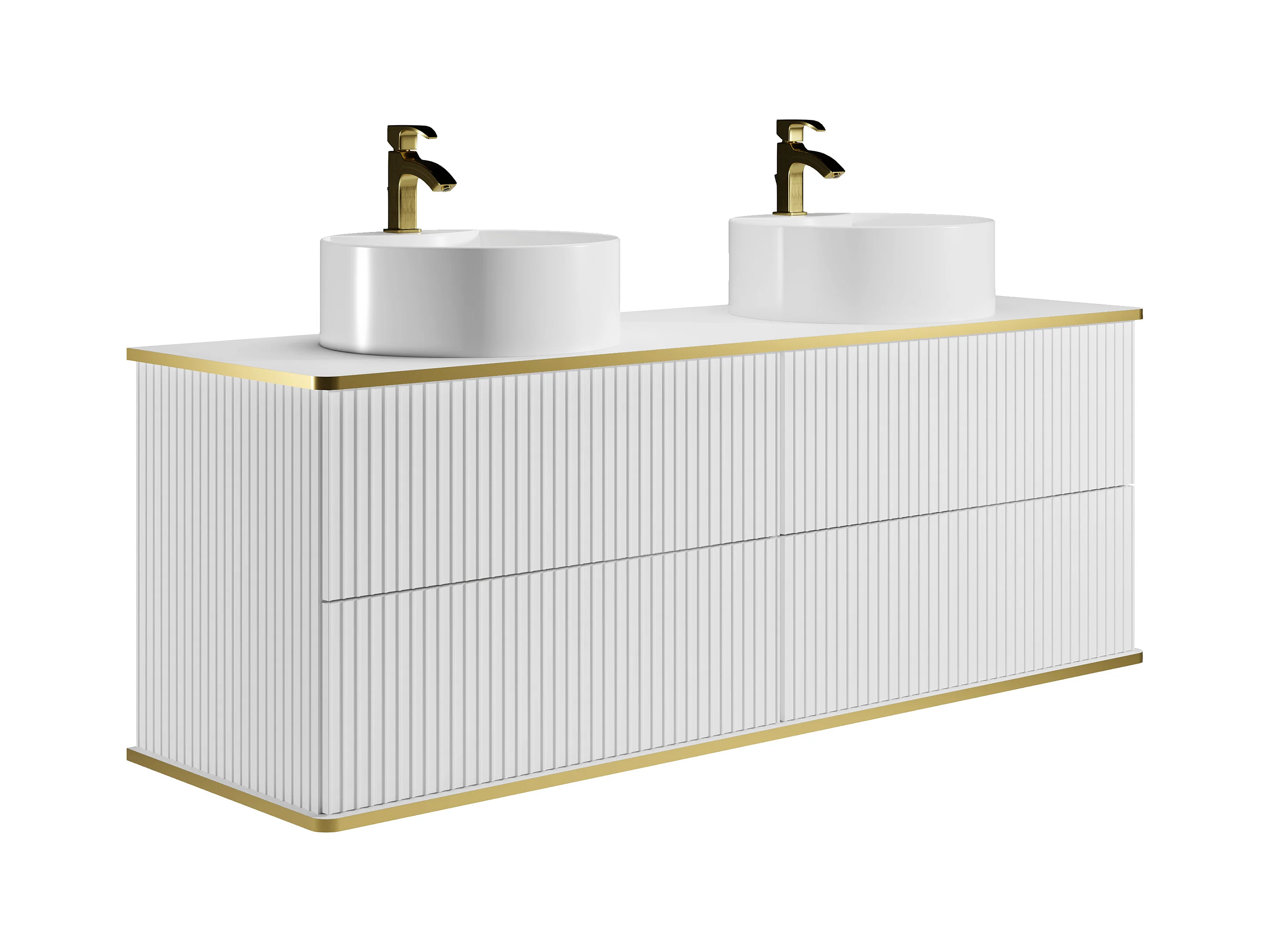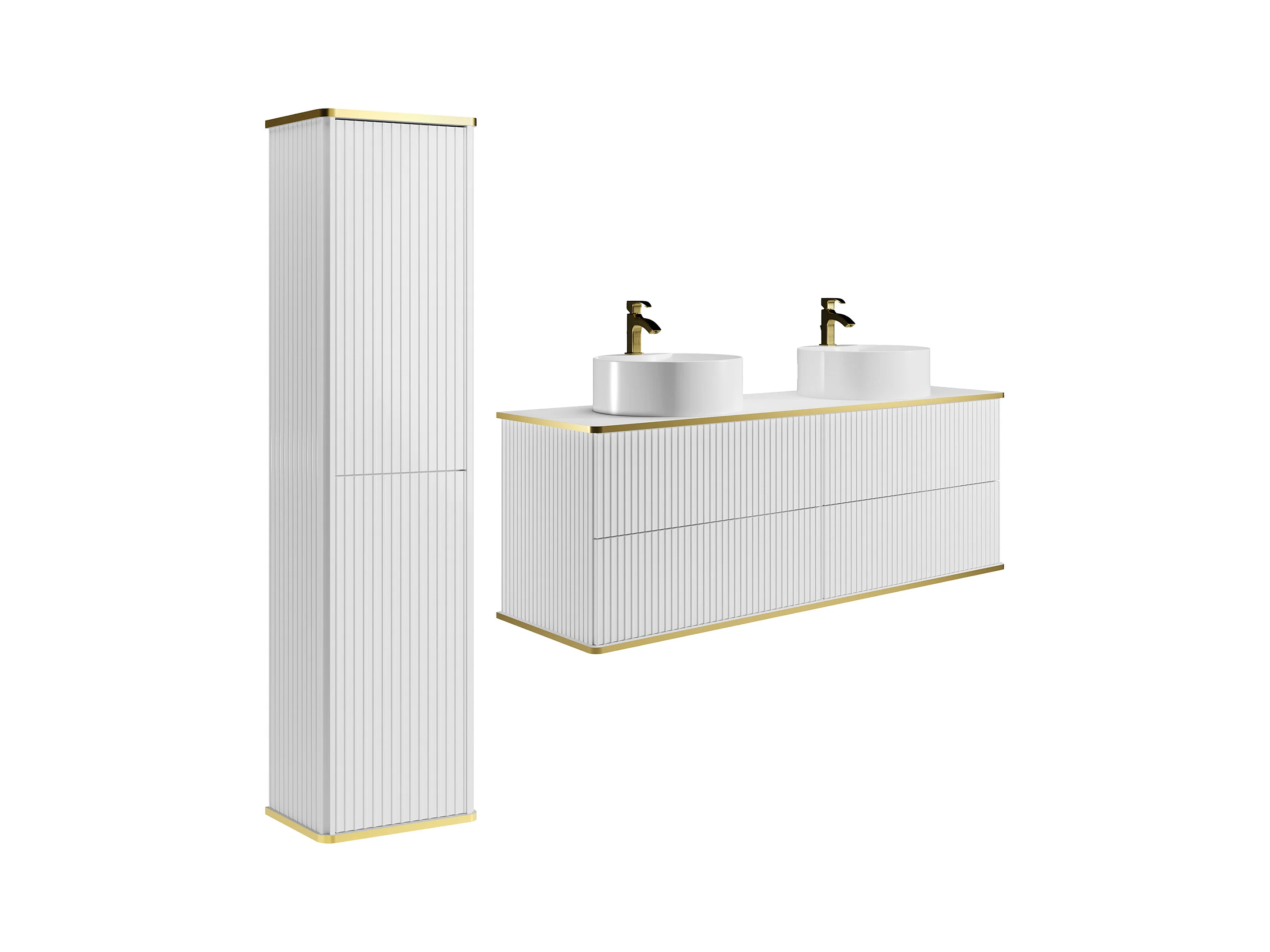 Meuble de salle de bain suspendu strié avec double vasque à poser ronde et colonne - Blanc - 150 cm - KELIZA