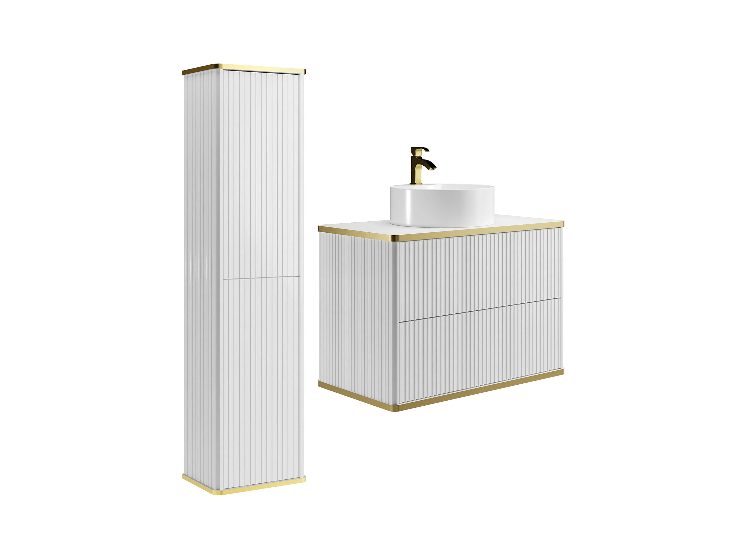 Meuble de salle de bain suspendu strié avec vasque à poser ronde et colonne - Blanc - 80 cm - KELIZA