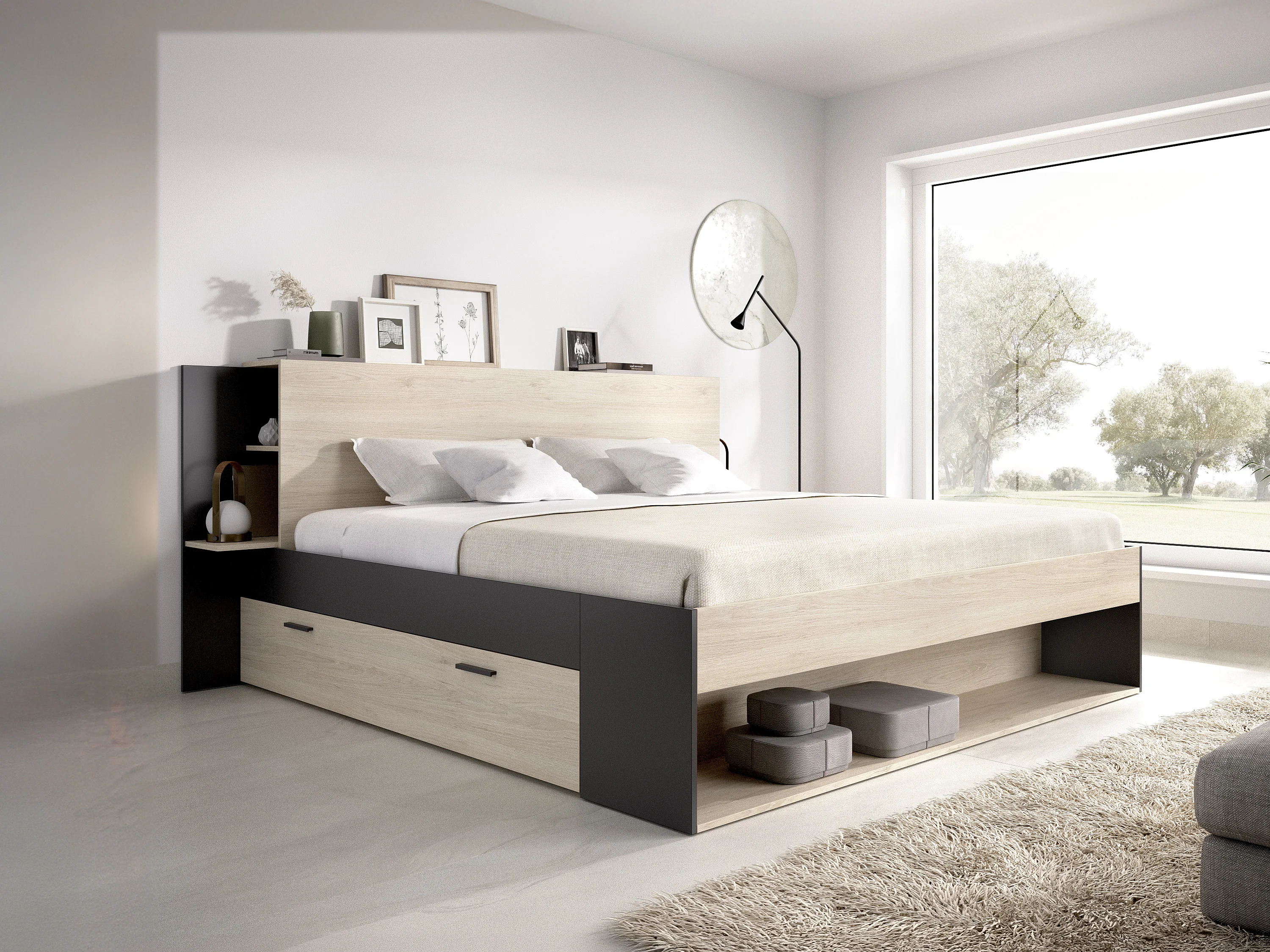 Lit 140 x 190 cm avec rangements - Coloris : Naturel et noir + Sommier + Matelas - KEROSIA