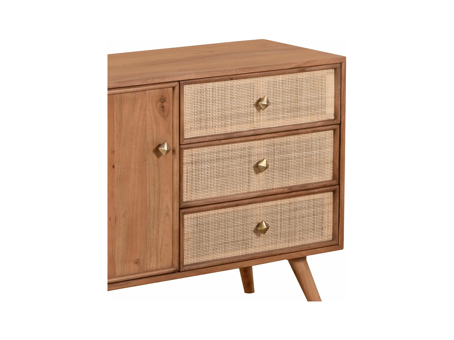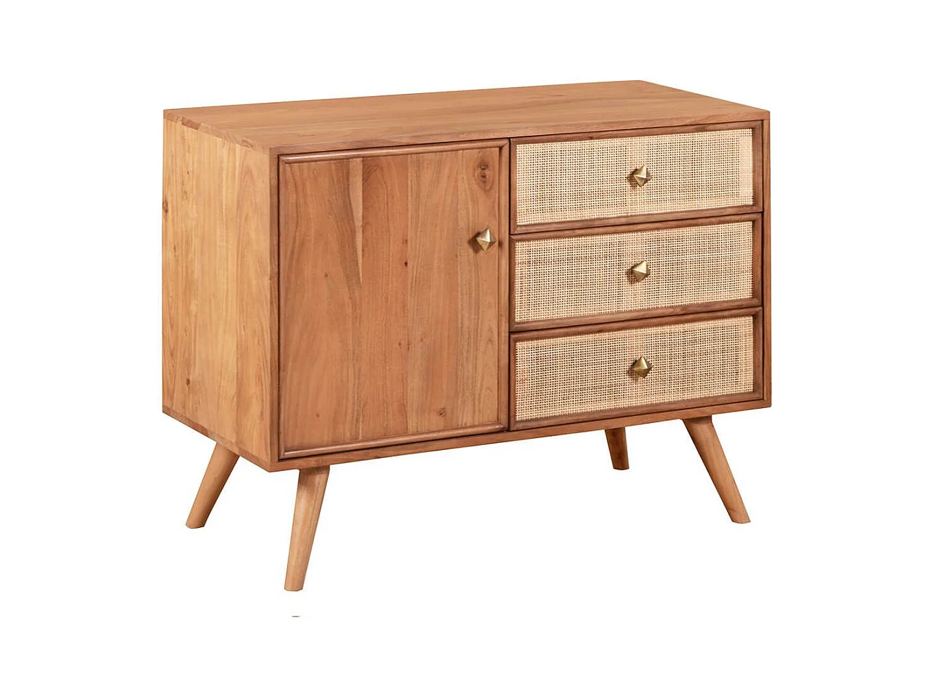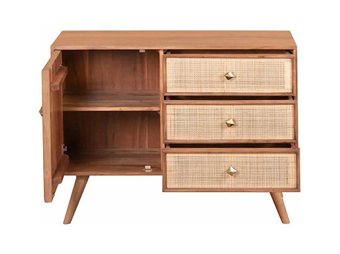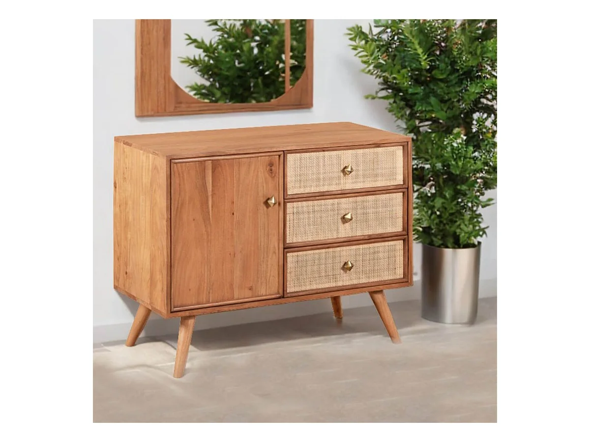 KESIAH - Meuble de rangement 1 porte 3 tiroirs en acacia finition teinté teck avec plaquage cannage
