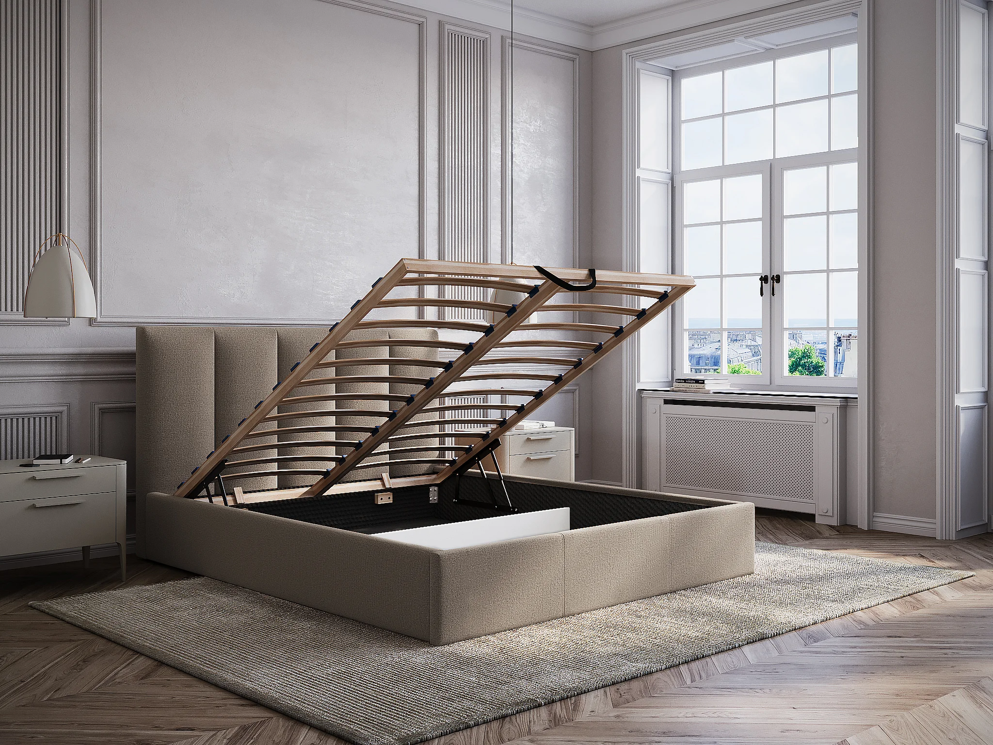 Lit coffre 200 x 200 cm avec tête de lit coutures verticales - Tissu - Taupe - KILACLO