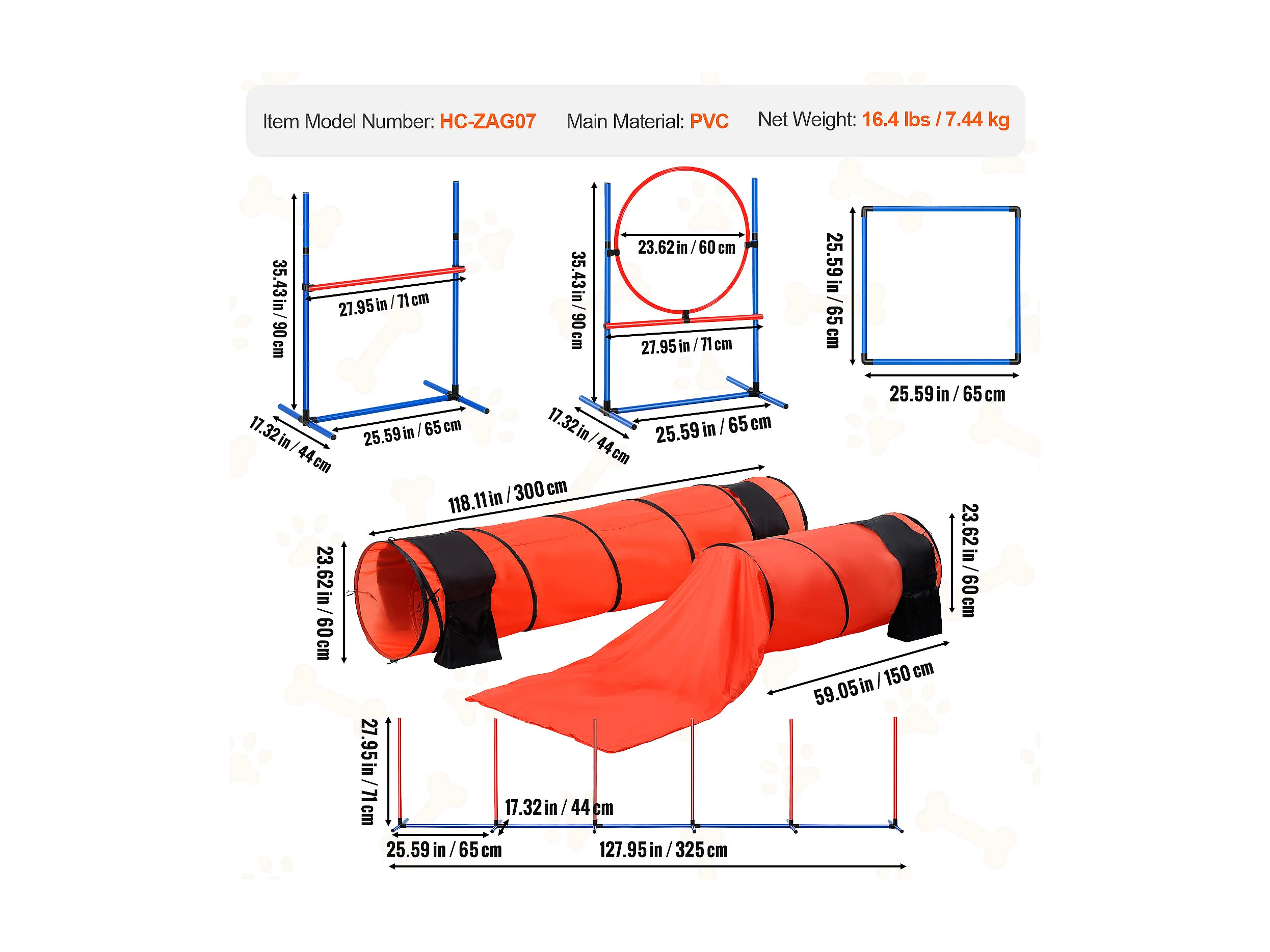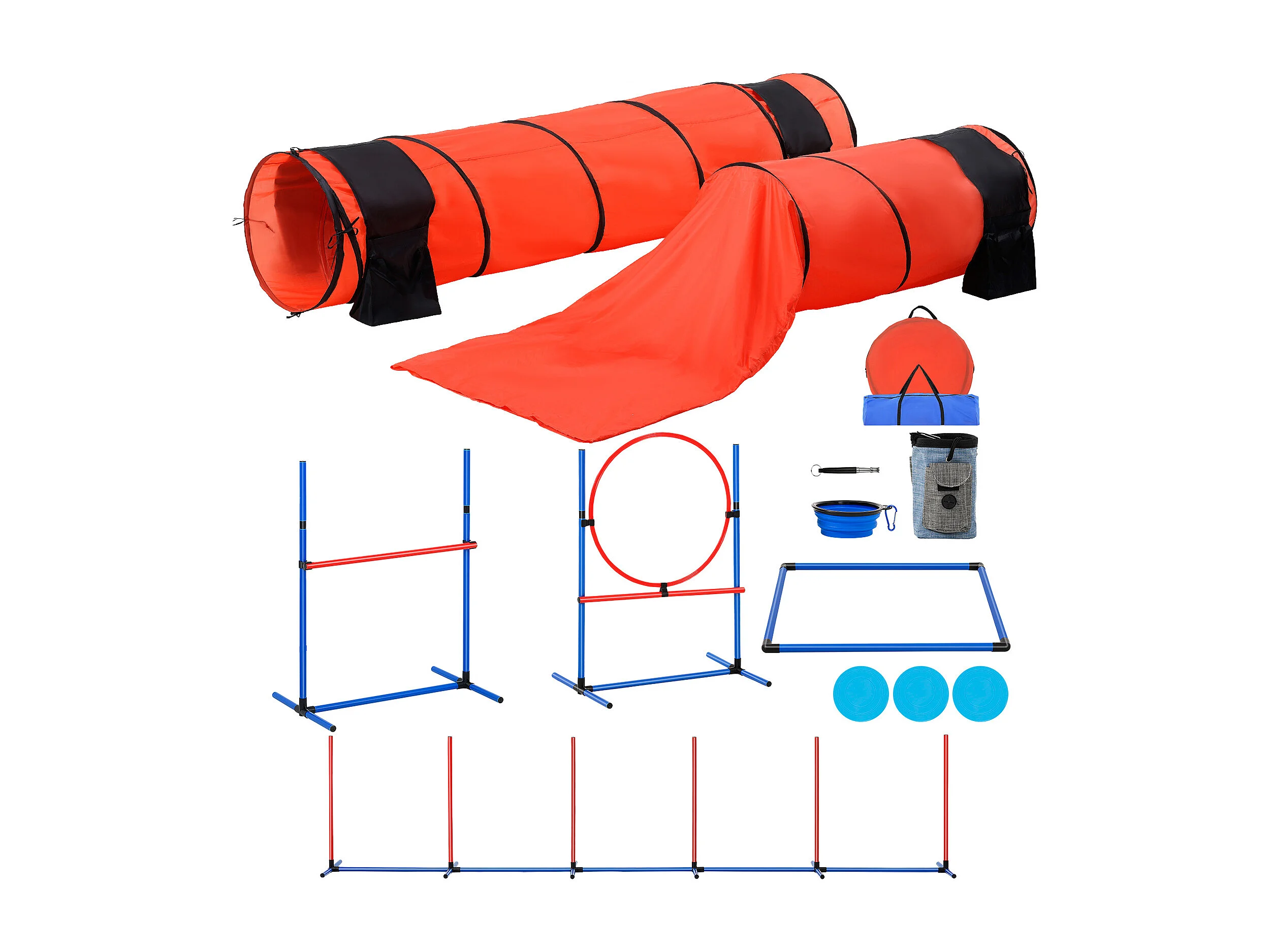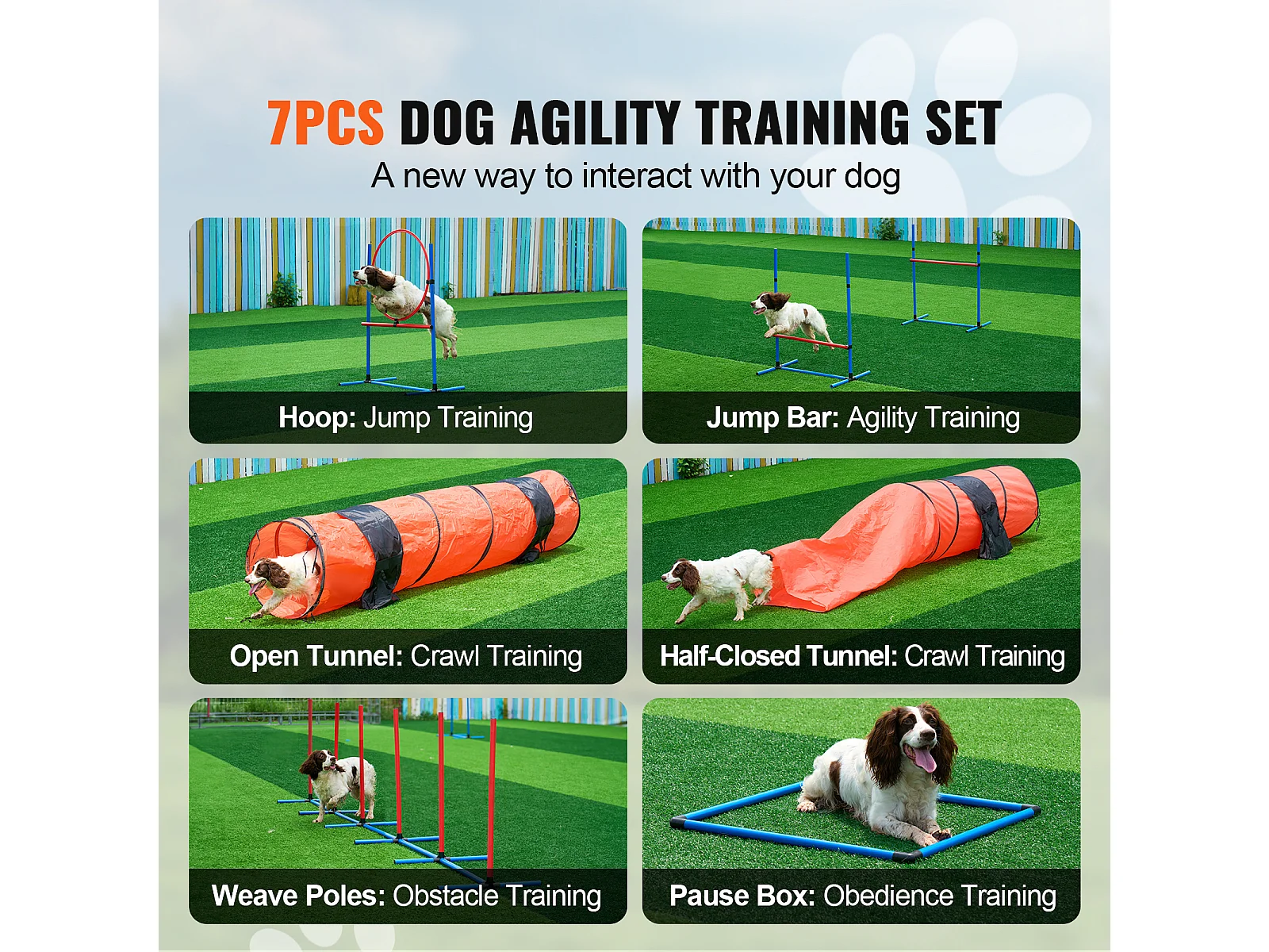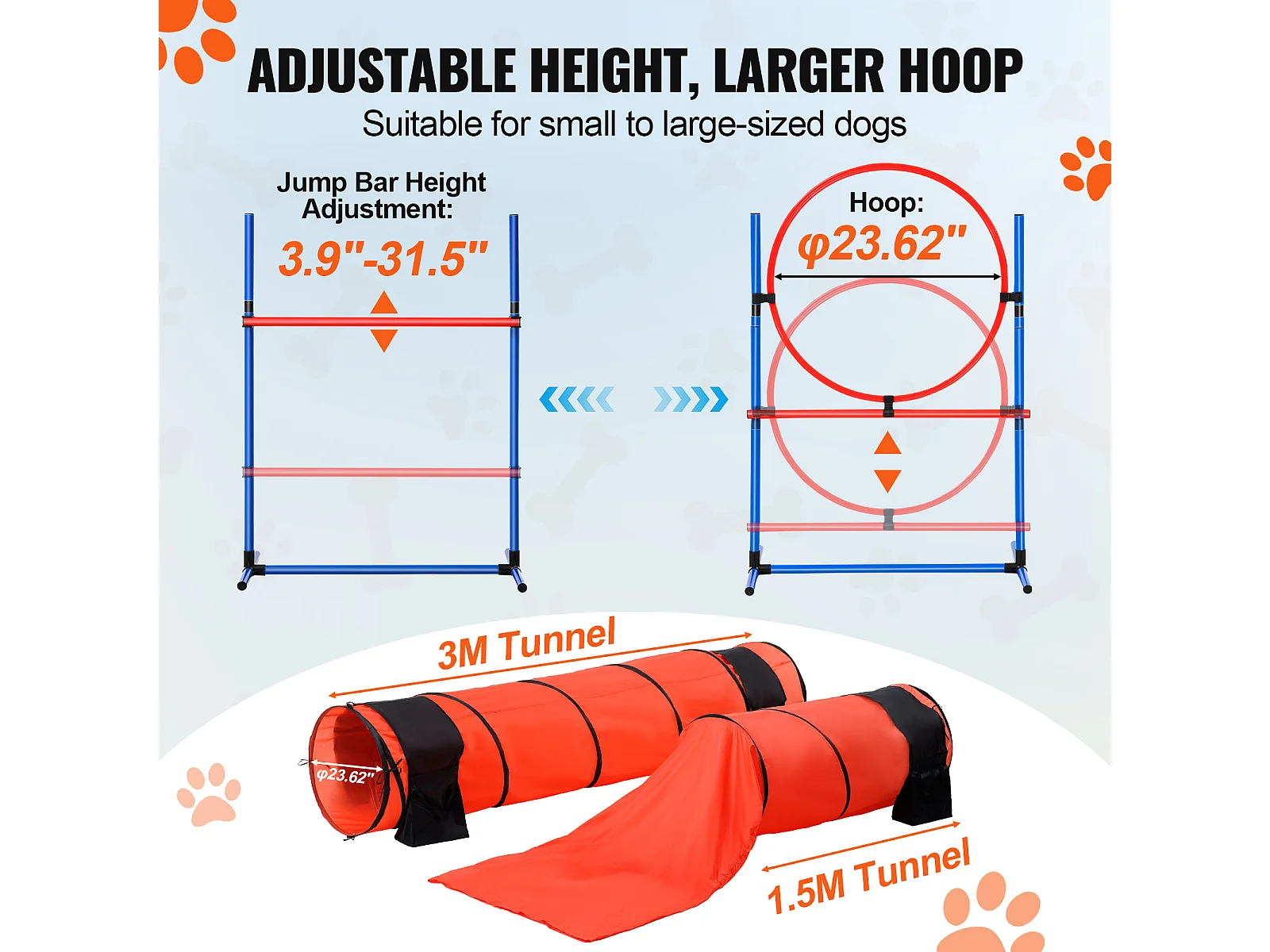 Kit d'Agilité, SucceBuy Équipement d'Entraînement d'Agilité pour Chien, Ensemble de 7 Pièces Amélioré avec Haies Hautes Réglables, 6 Poteaux de Tissage, 2 Tunnels