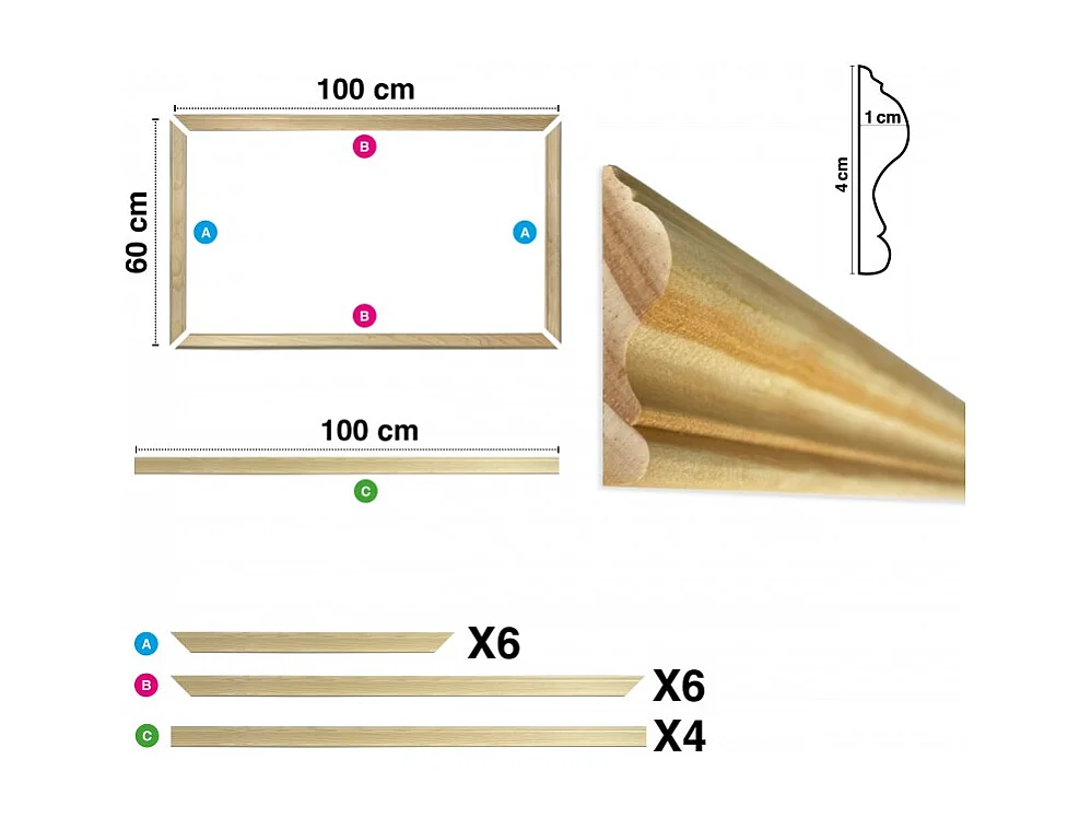 Kit de 4 moulures murales en bois Pin des Landes - Prêt à coller et peindre - Antoinette - 4 mètres