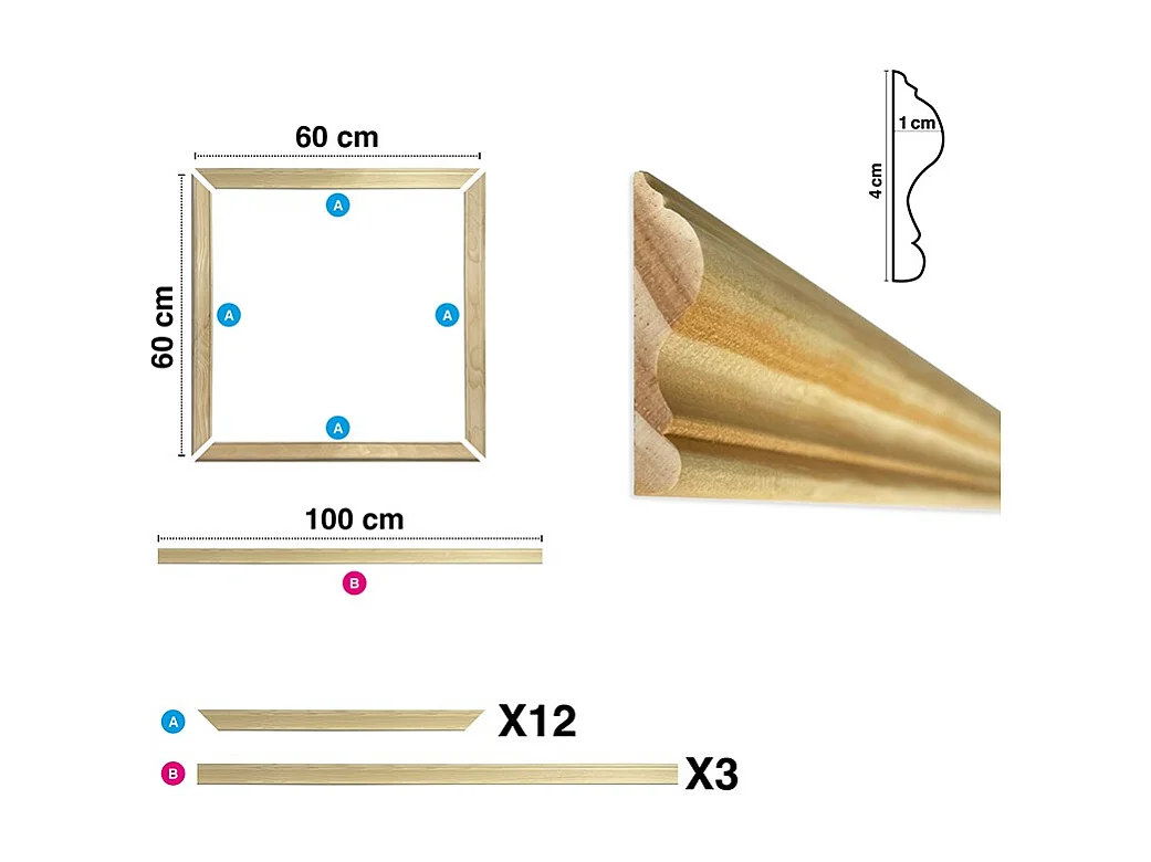 Kit de 4 moulures murales en bois Pin des Landes - Prêt à coller et peindre - Blandine - 3 mètres