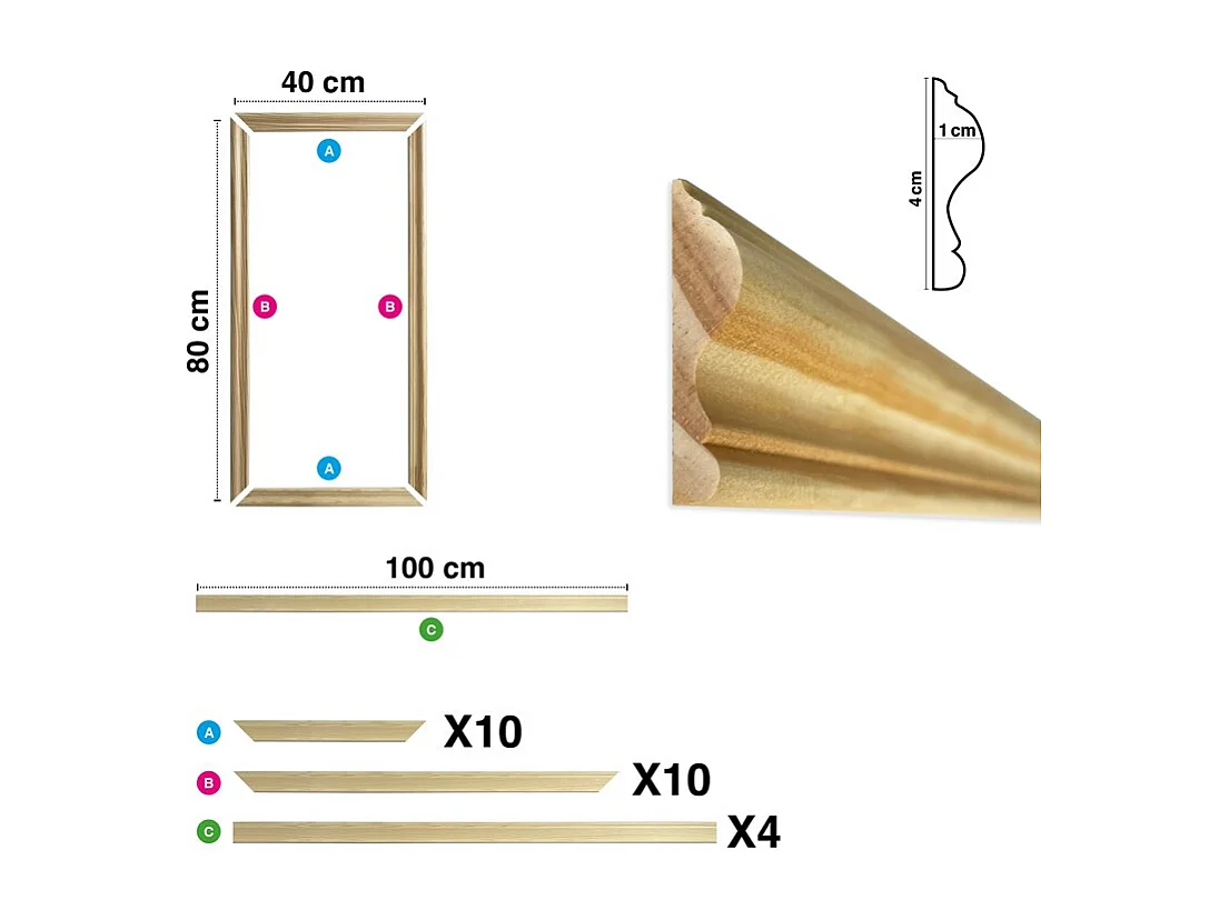 Kit de 4 moulures murales en bois Pin des Landes - Prêt à coller et peindre - Antoinette - 4 mètres