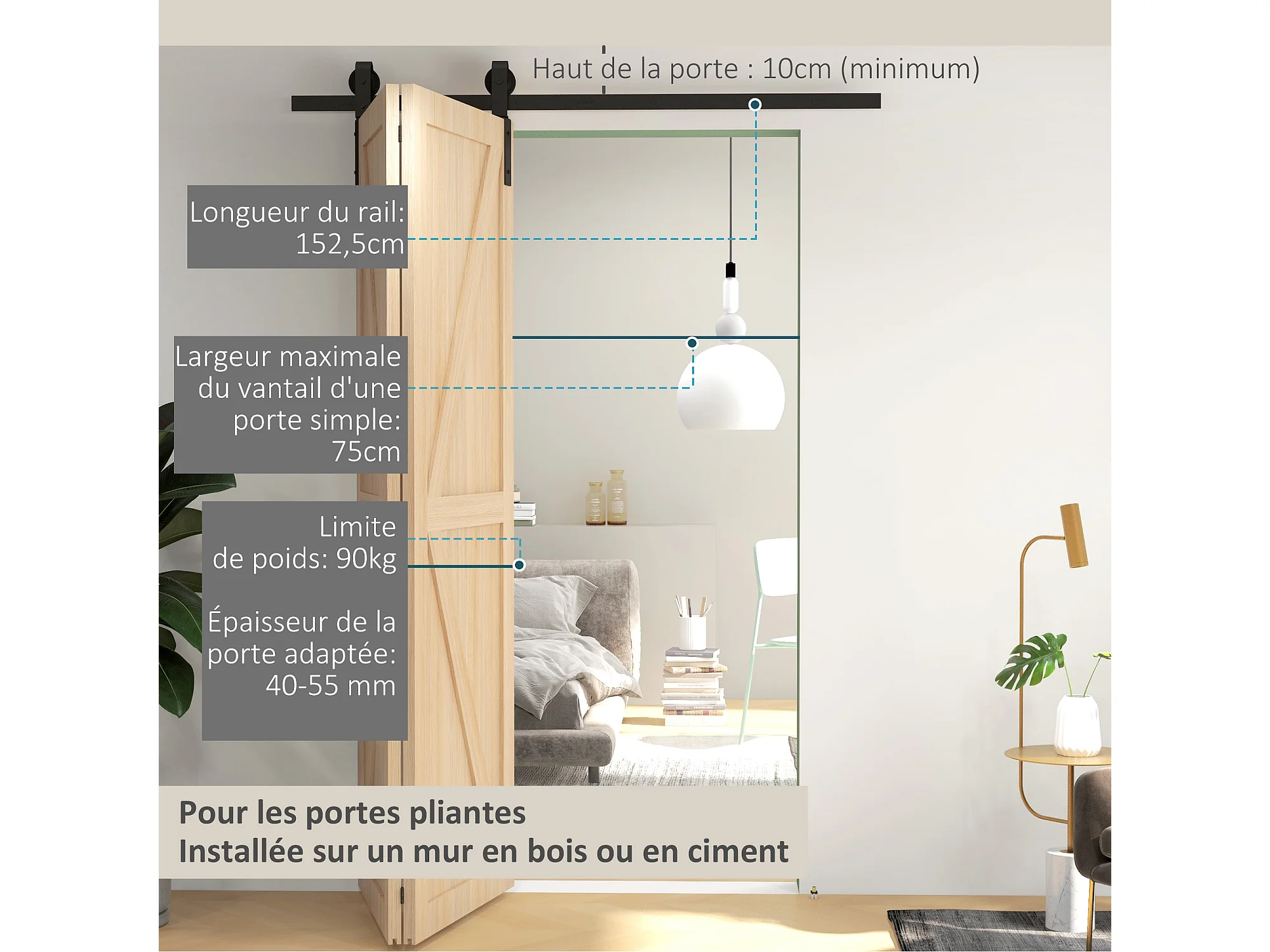 Kit de porte coulissante système galandage pour porte épaisseur 40-55 mm longueur rail 1,52 m charge max. 90 Kg acier au carbone noir