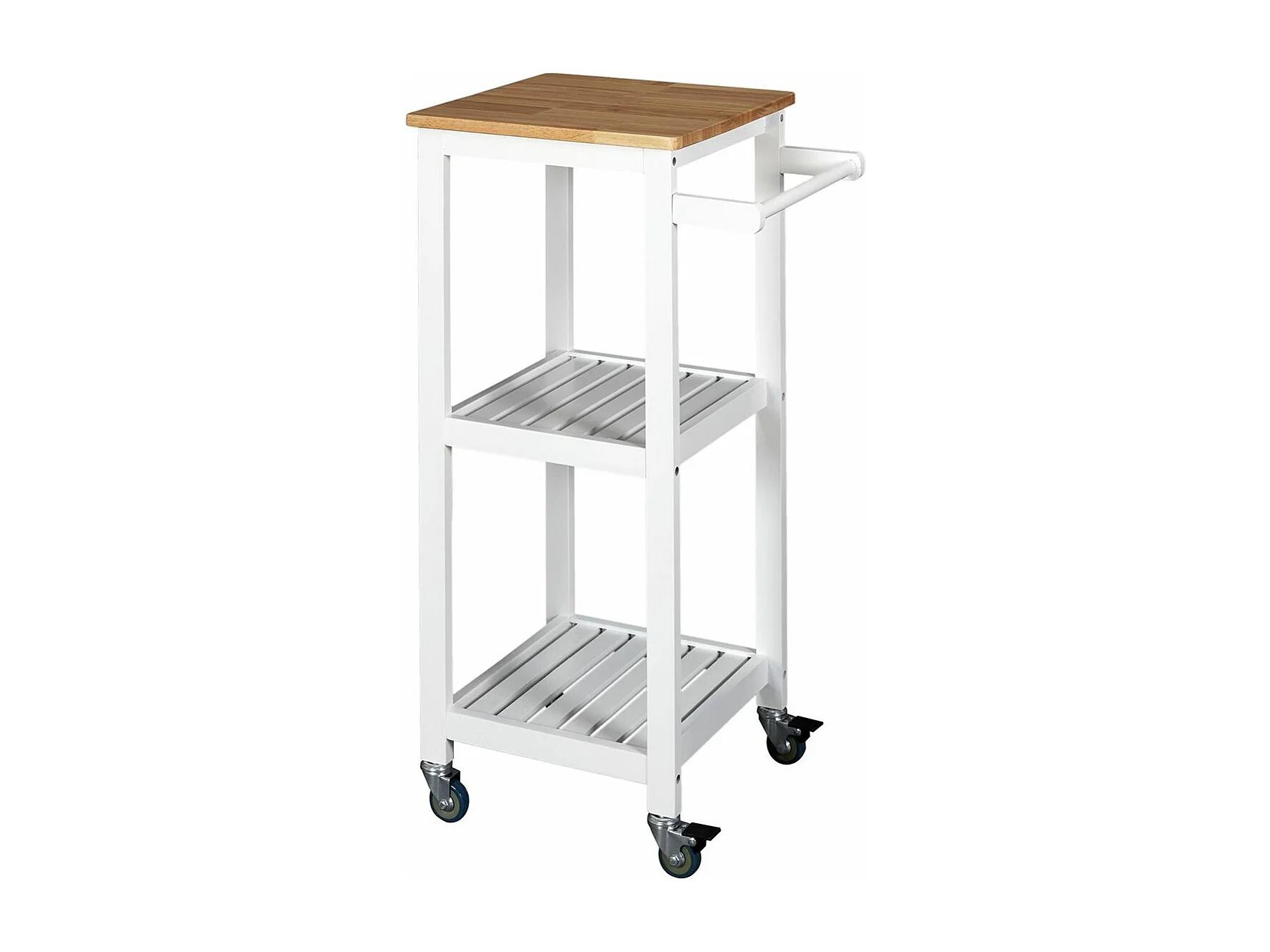 Desserte de cuisine blanche (118×43×98 cm) avec plateau bois, rangement multifonction, roulettes et porte-serviette