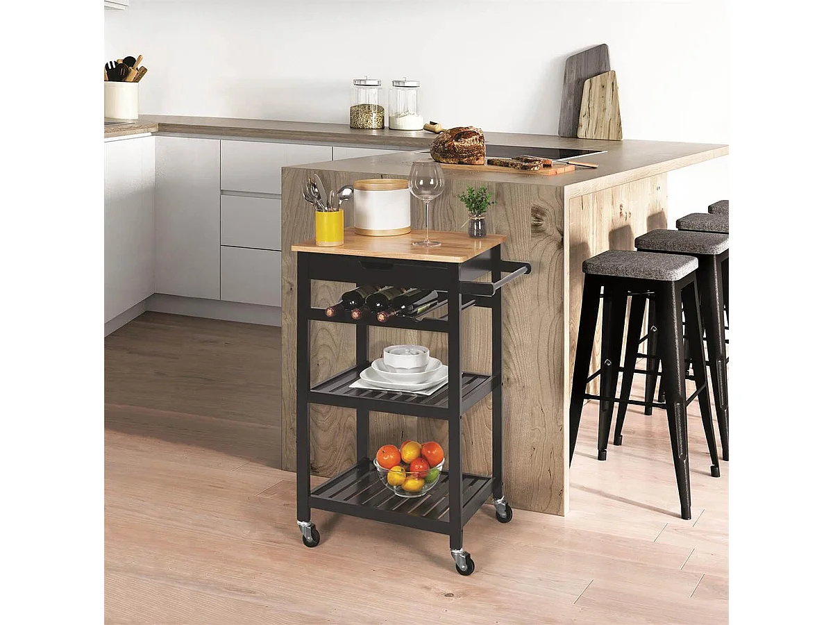 Desserte de cuisine noire (118×43×98 cm), avec roulettes, plateau bois, rangements modulables et porte-serviette