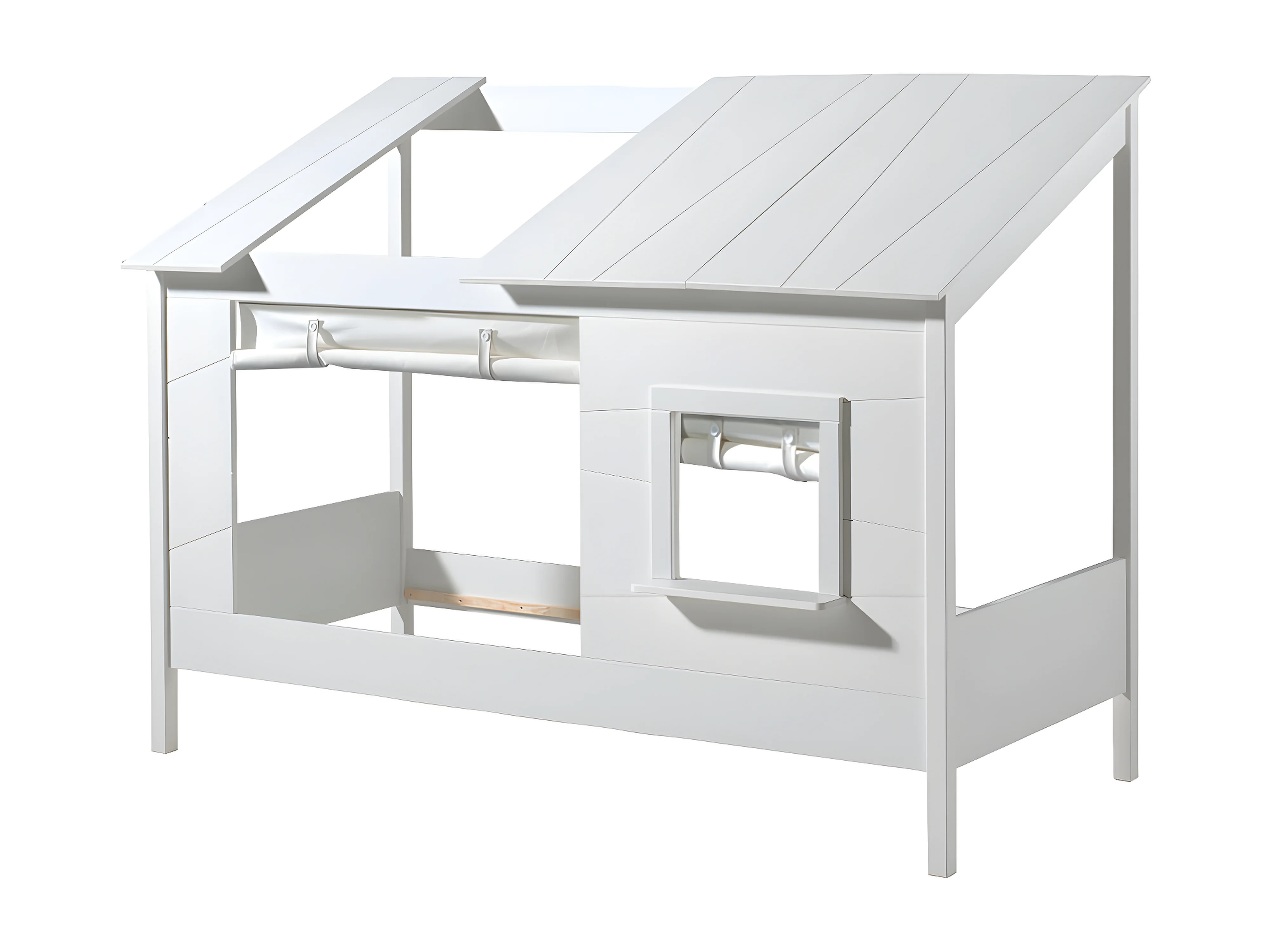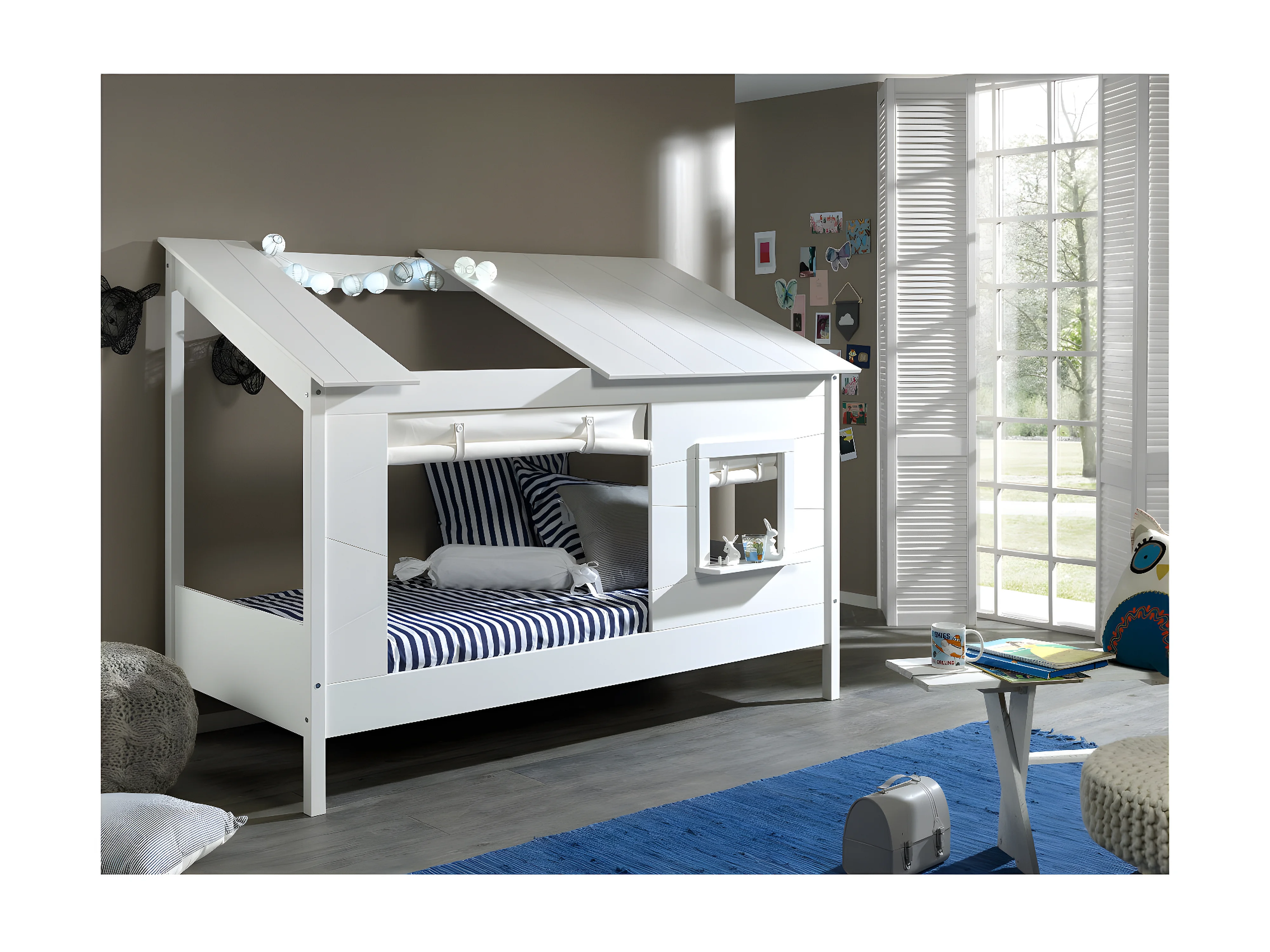 LAKA - Lit Maison 90x200cm Blanc avec Fenêtre + Rideaux