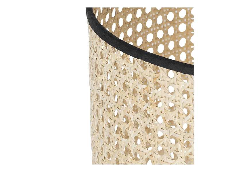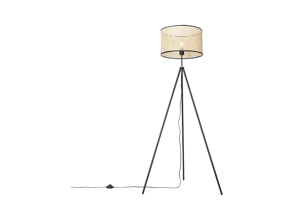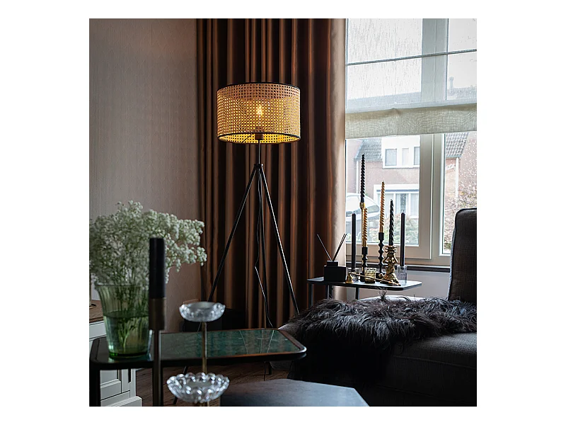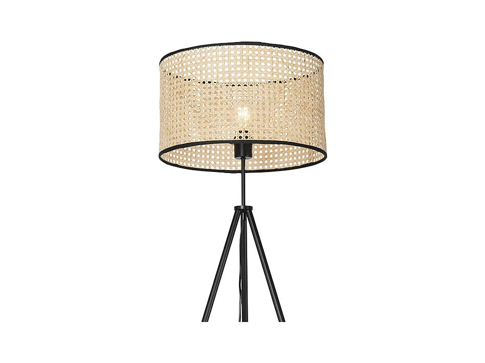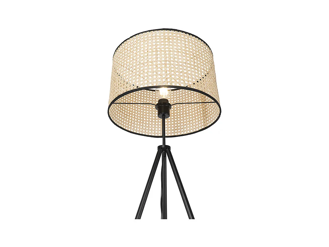 Lampadaire rural trépied noir avec abat-jour en rotin - Kata