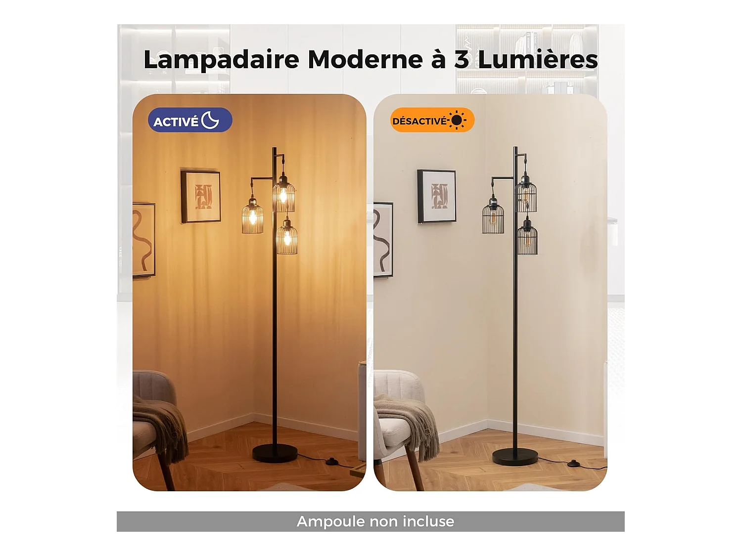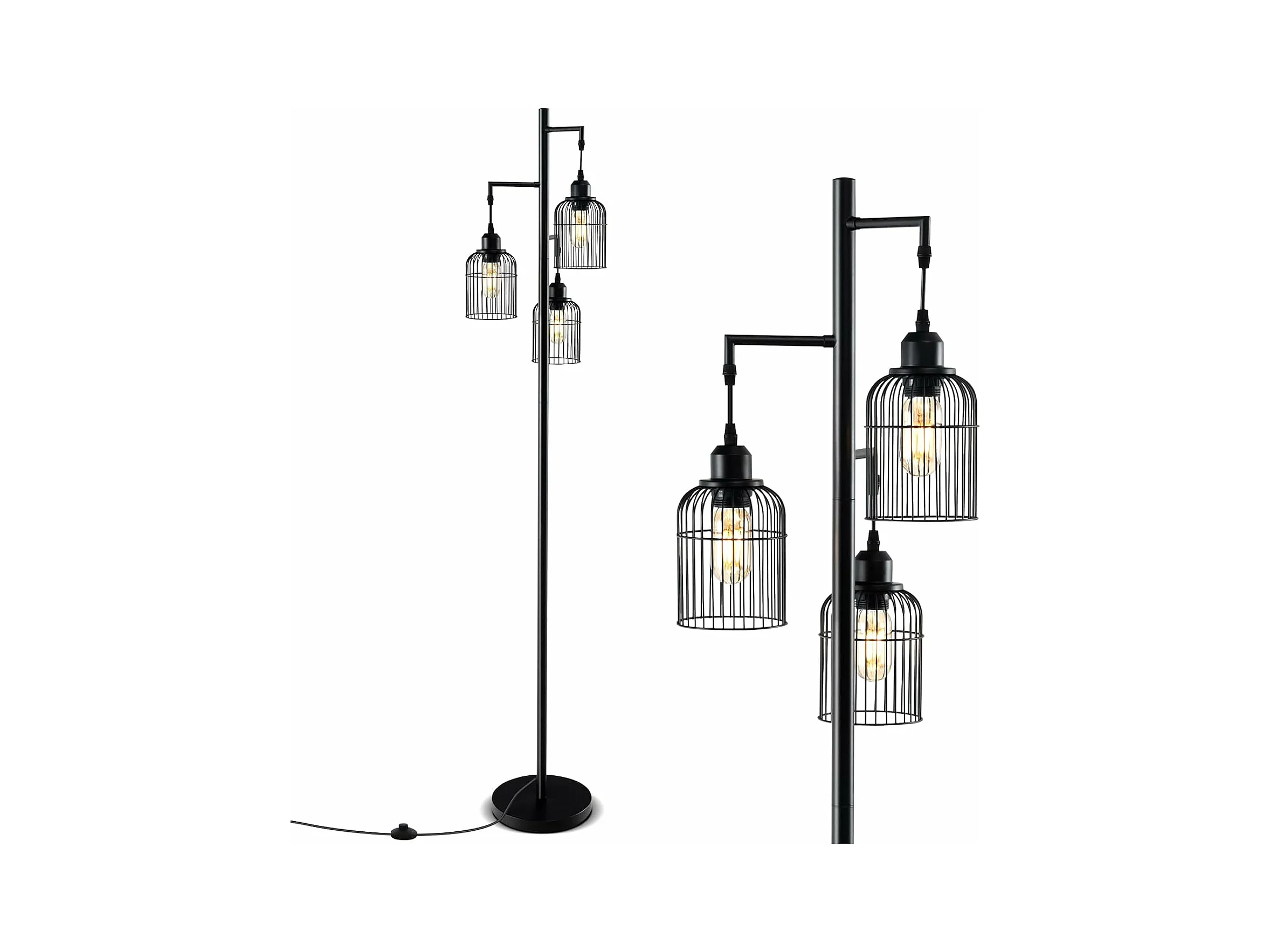 Lampadaire sur Pied Salon, Lampadaire Industriel 169 CM, 3 Abat-jours, Interrupteur au Pied, Base Robuste, 60W, Lampadaire Haut pour Bureau, Chambre, Salle d'Etude, Salle à Manger, Noir [Classe énergétique A]
