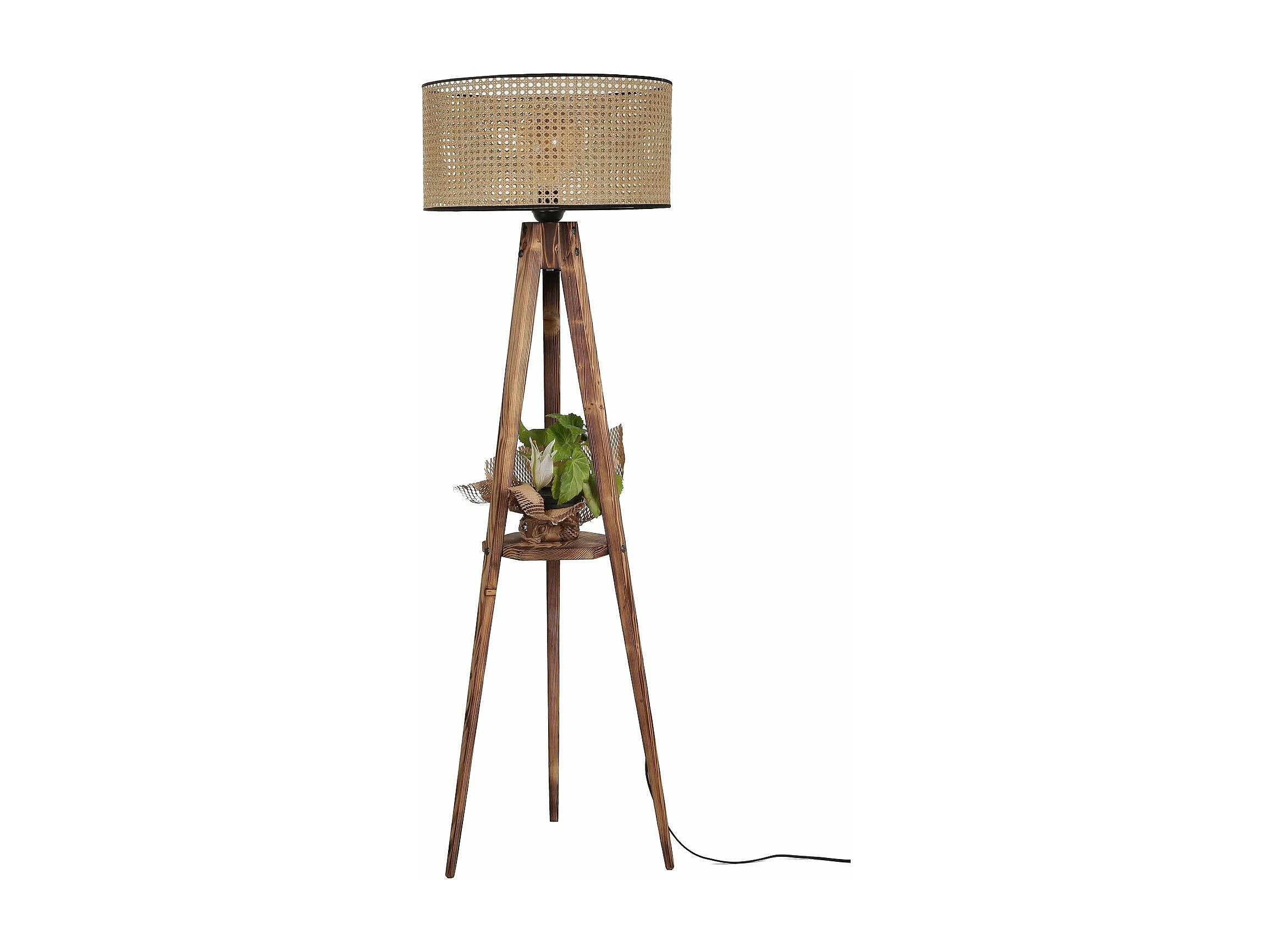 Lampadaire trépied Lunctura 153cm Bois Naturel et Tissu cannage brun