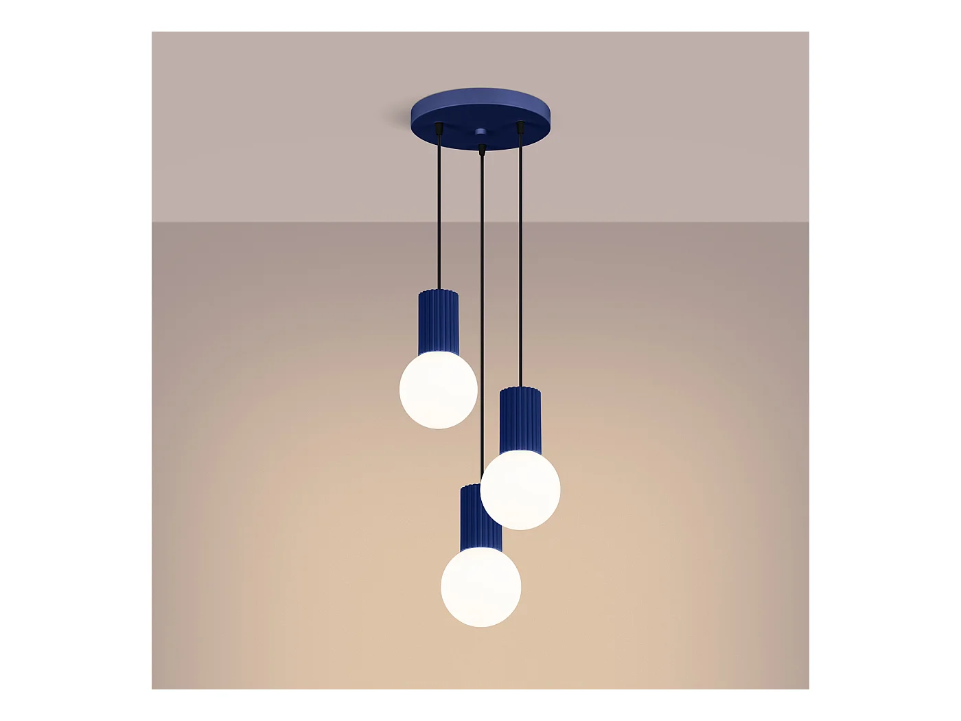 Barre, 3 suspensions globe verre bleu 80 cm.