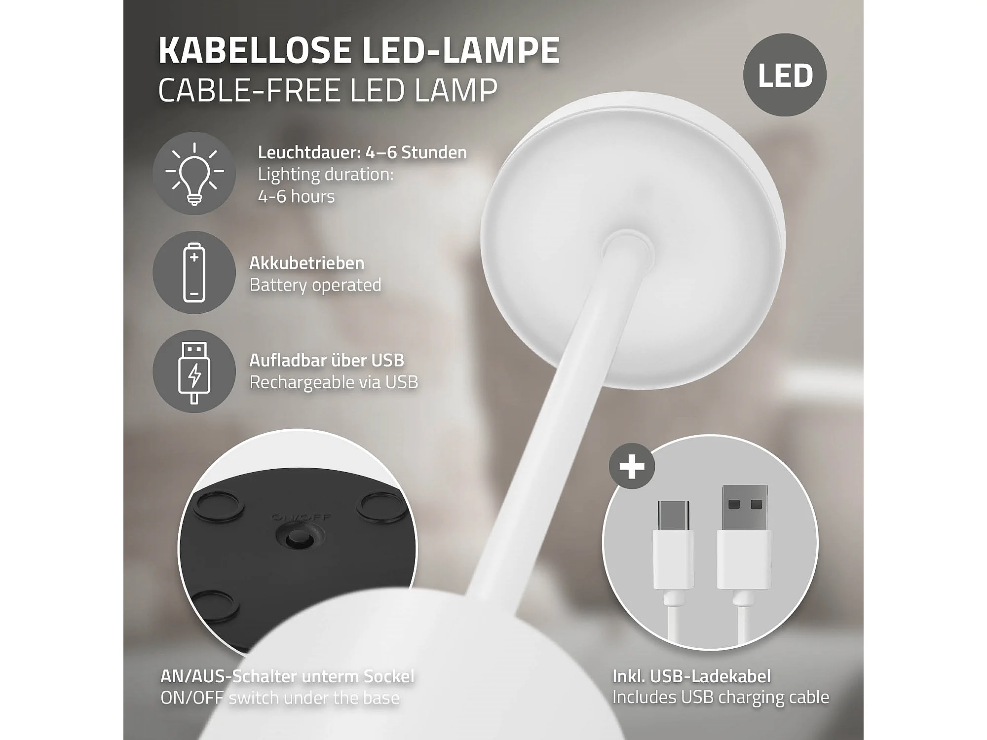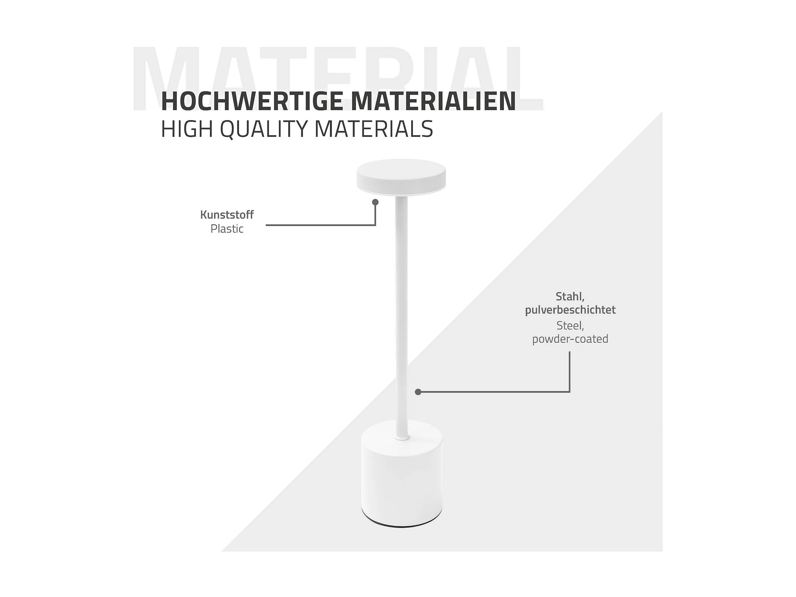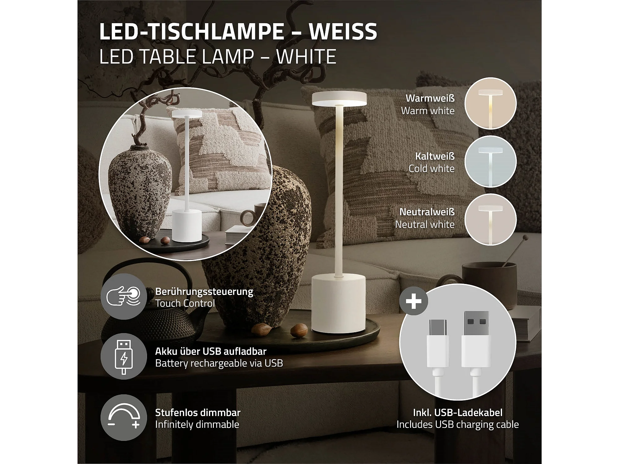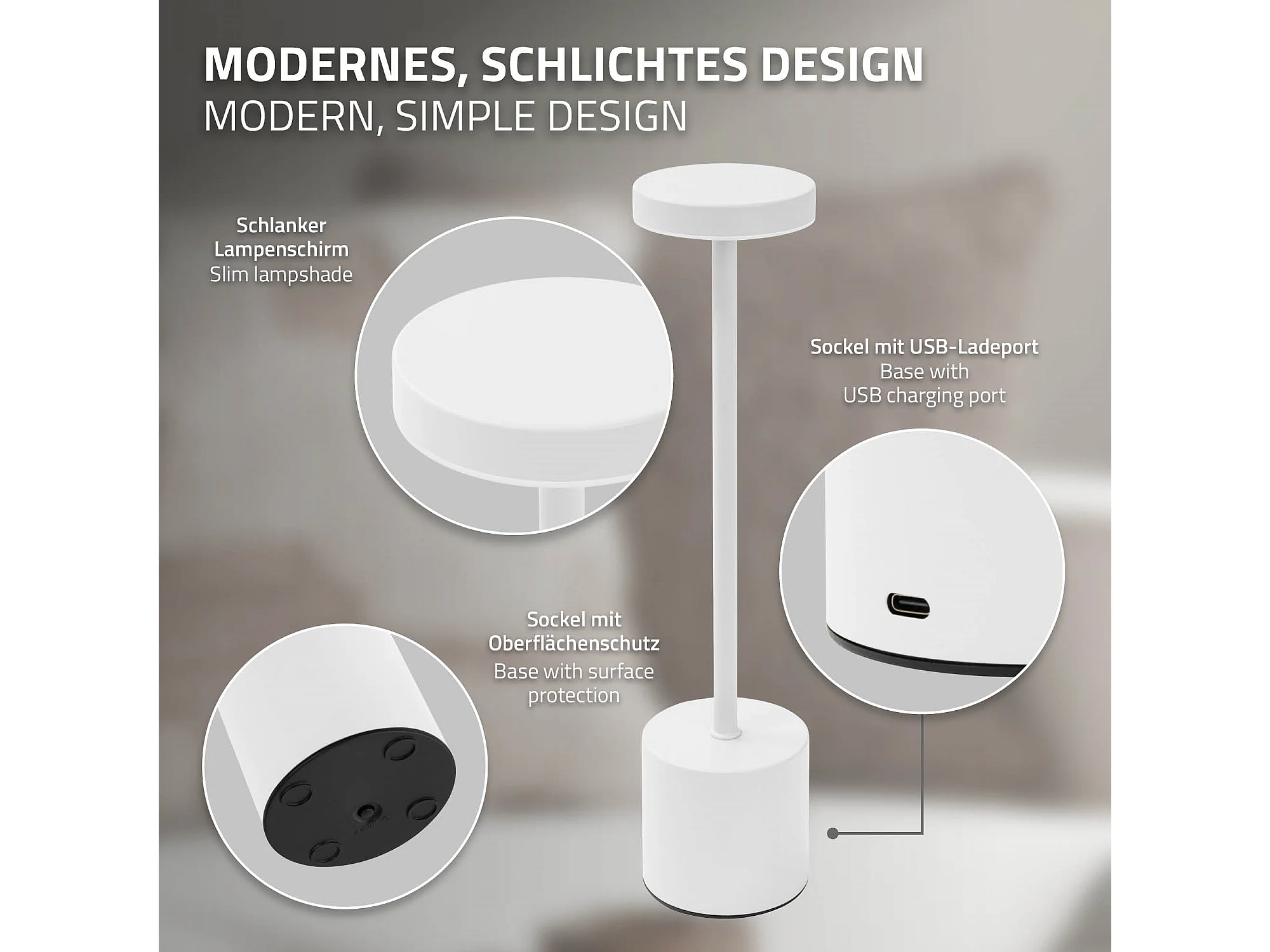 Lampe de table LED Ø8x34,5cm blanche 3 couleurs d'intensité réglables capteur tactile batterie rechargeable USB-C éclairage bureau sans fil portable